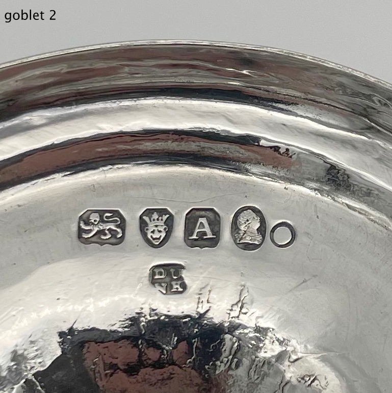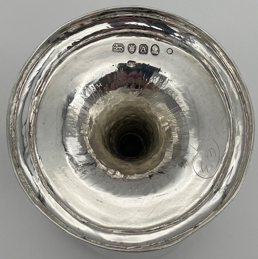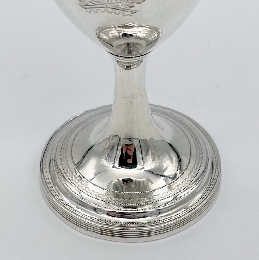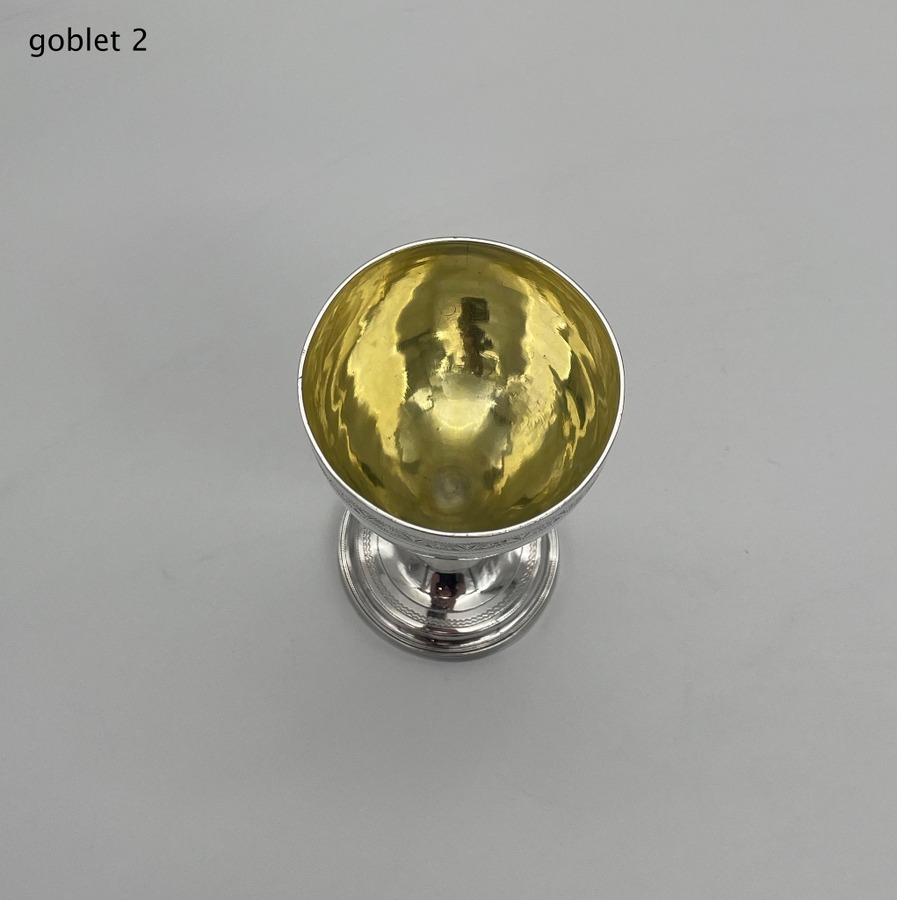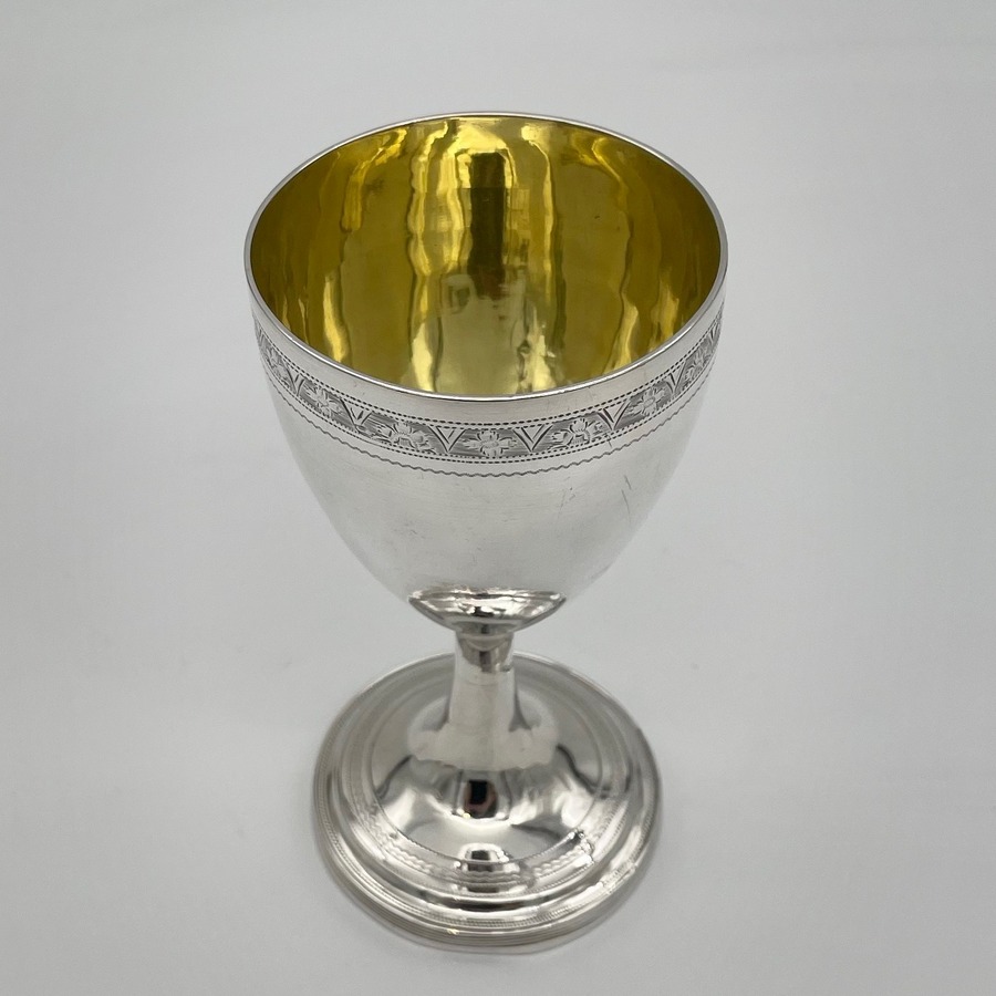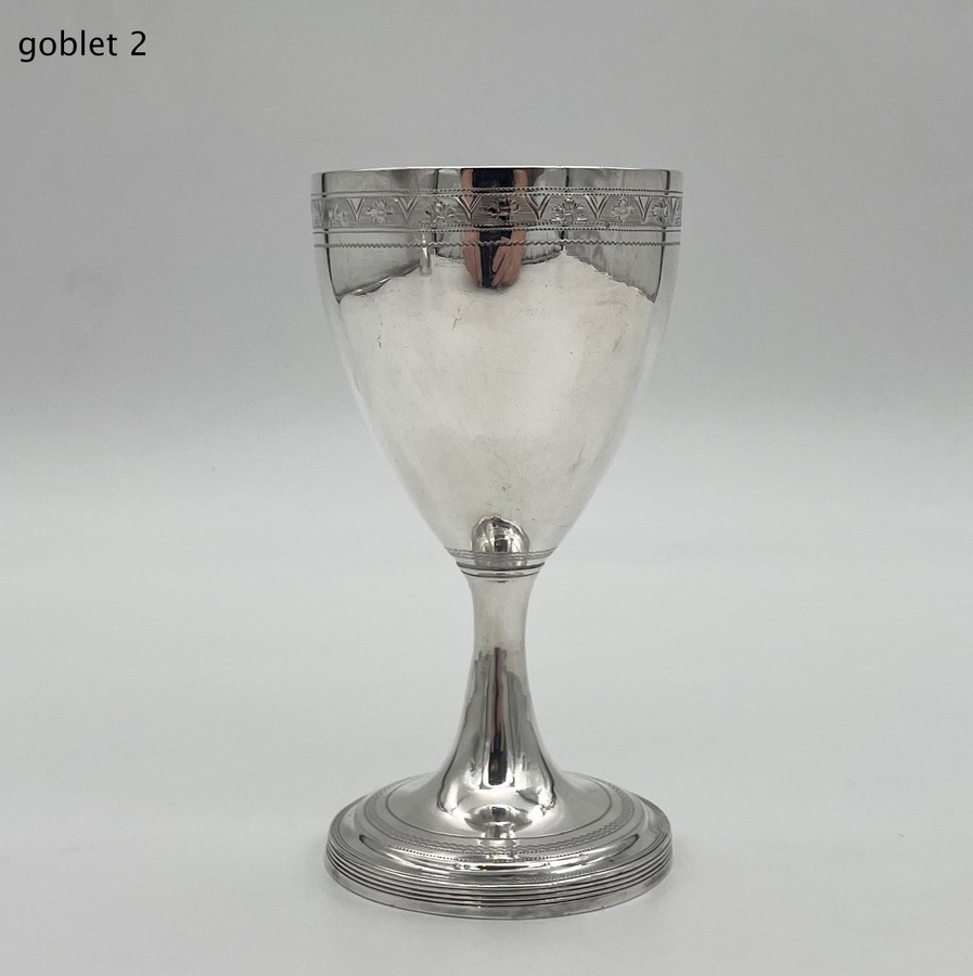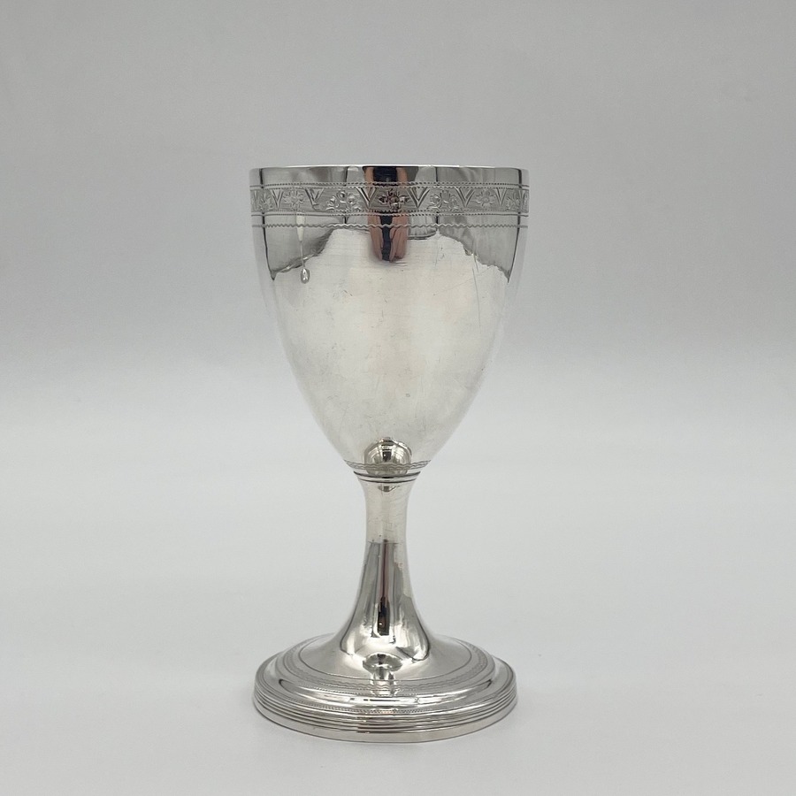 Wonderful pair of Georgian silver vase shaped pair of goblets decorated with a elegant upper bright cut engraved bands and a stylish wreath shaped cartouches in which sits contemporary hand engraved entwined initials.