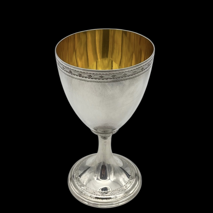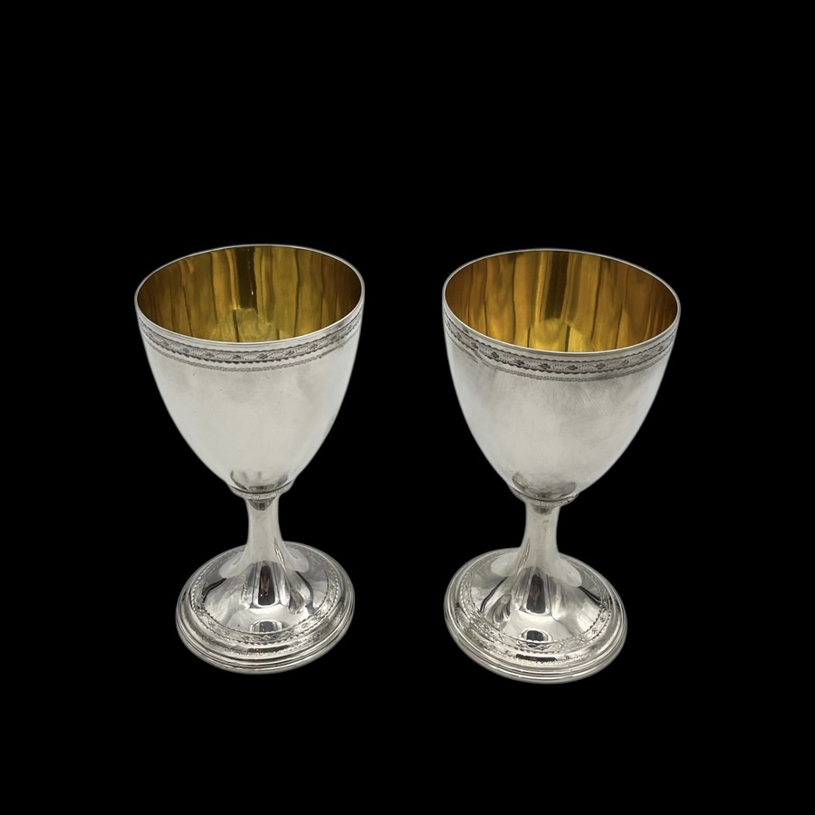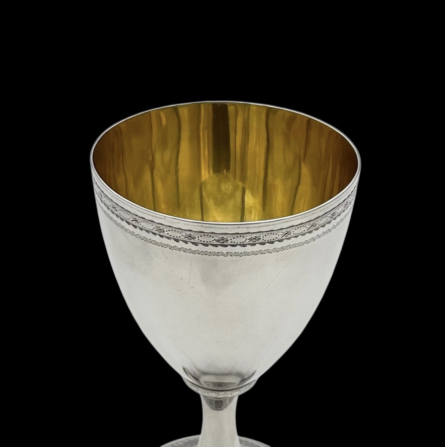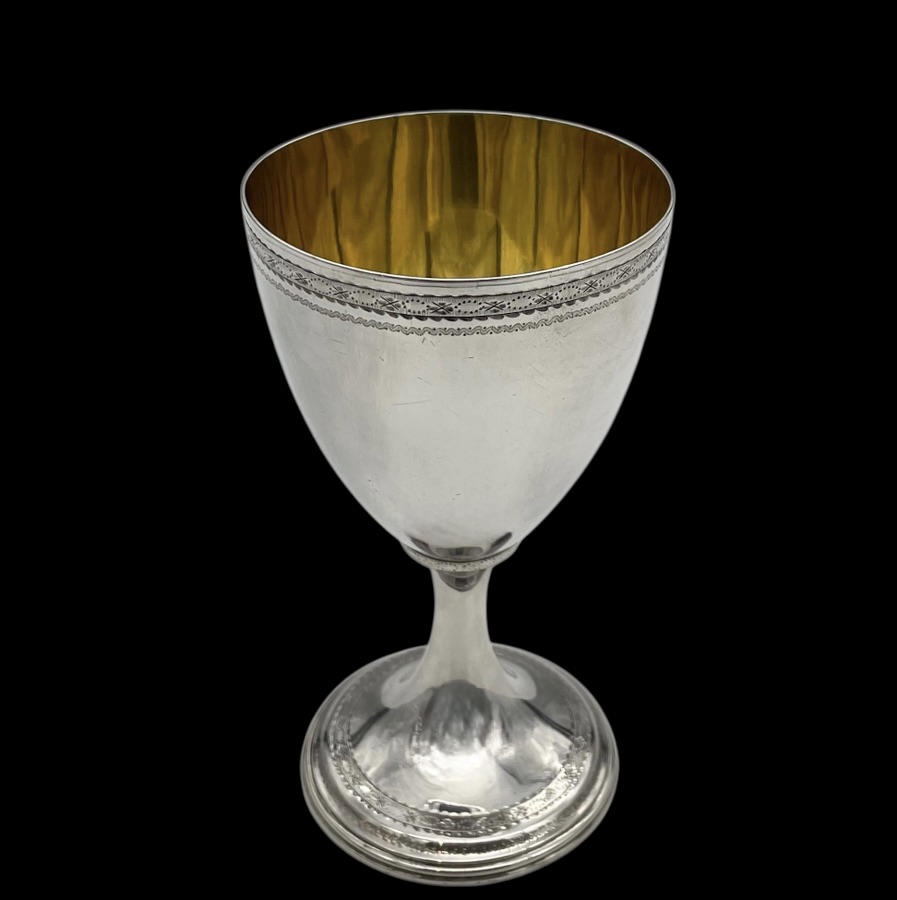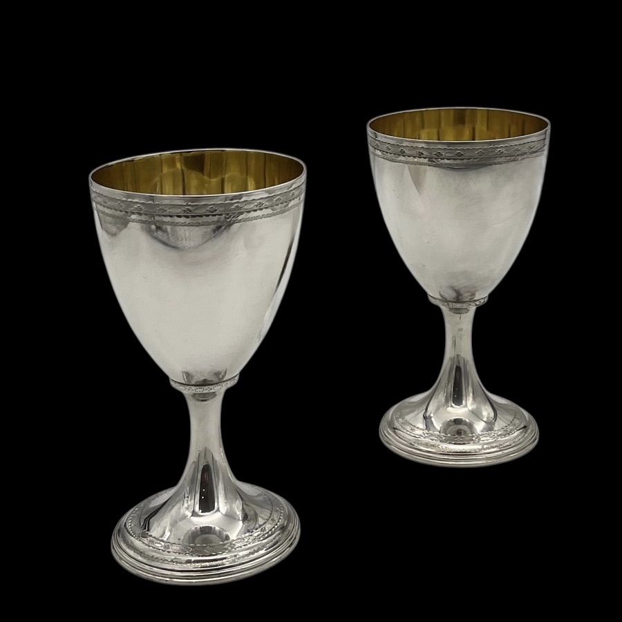 A wonderful pair of Georgian silver vase shaped wine goblets decorated with upper and lower bands of intricate bright cut engraving for low/highlights. Â The interiors of the bowls have been gilded for decorative contrast.