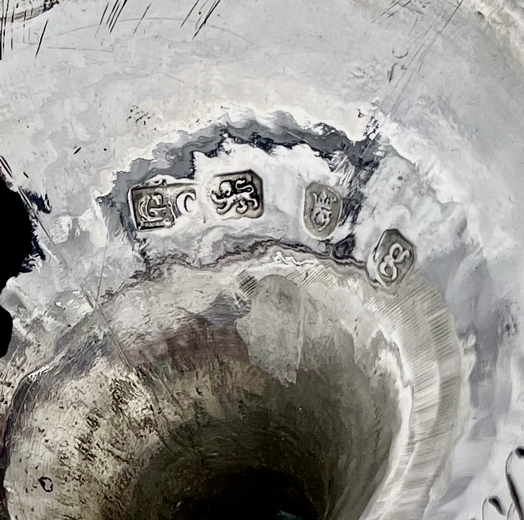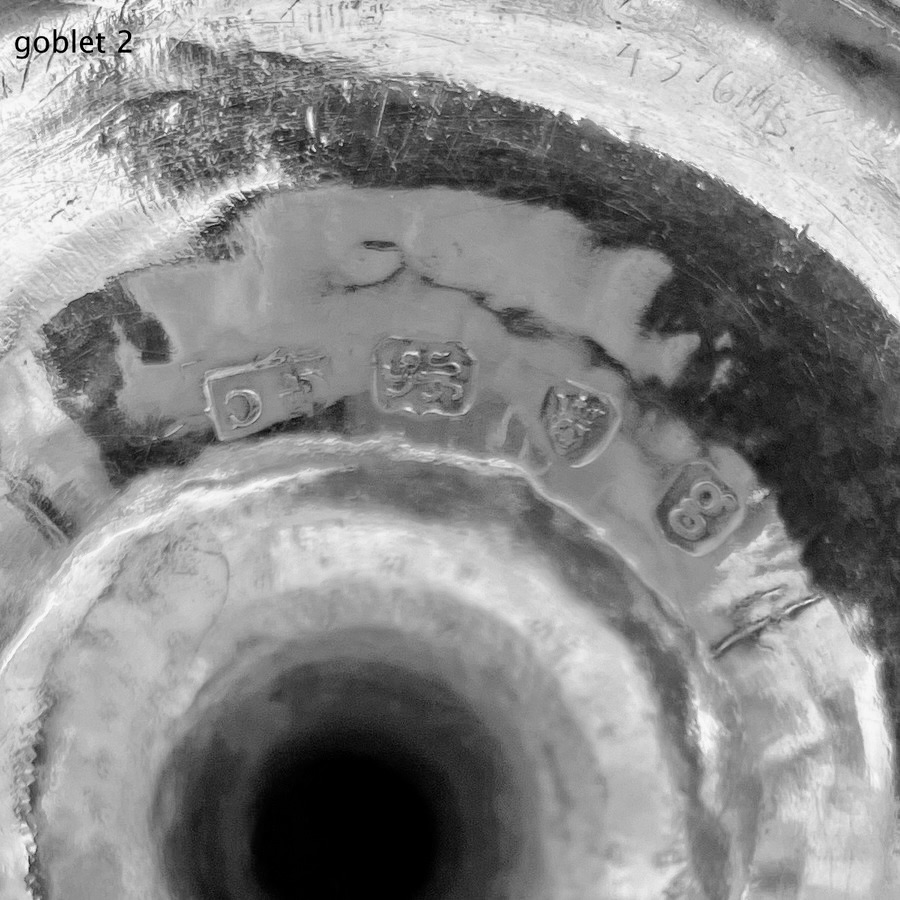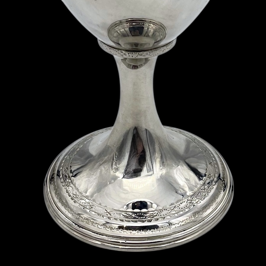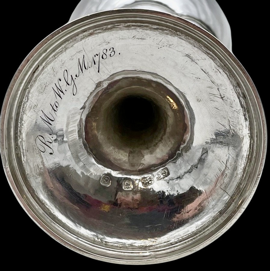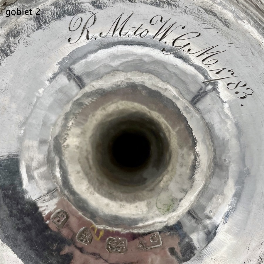 A wonderful pair of Georgian silver vase shaped wine goblets decorated with upper and lower bands of intricate bright cut engraving for low/highlights. Â The interiors of the bowls have been gilded for decorative contrast.