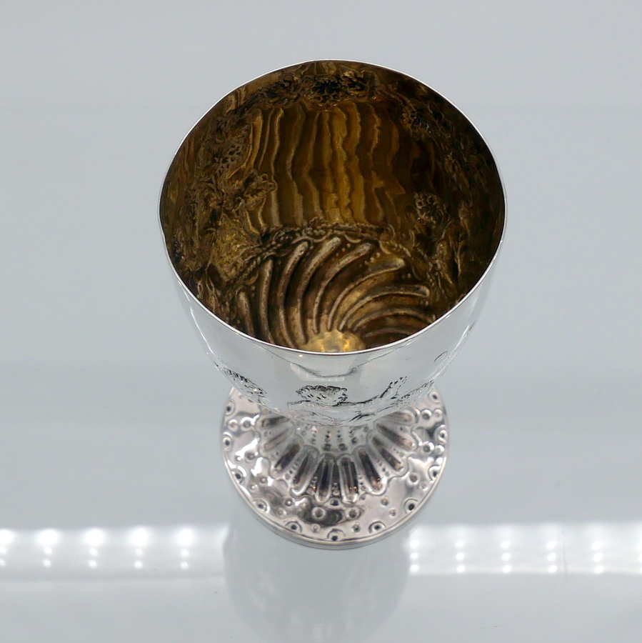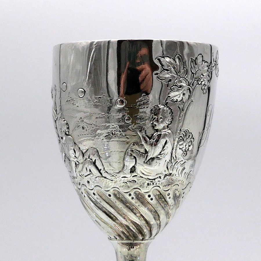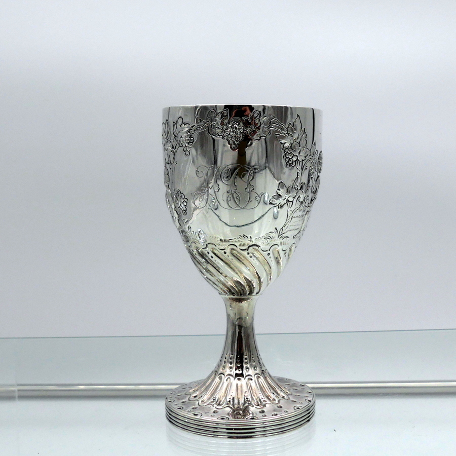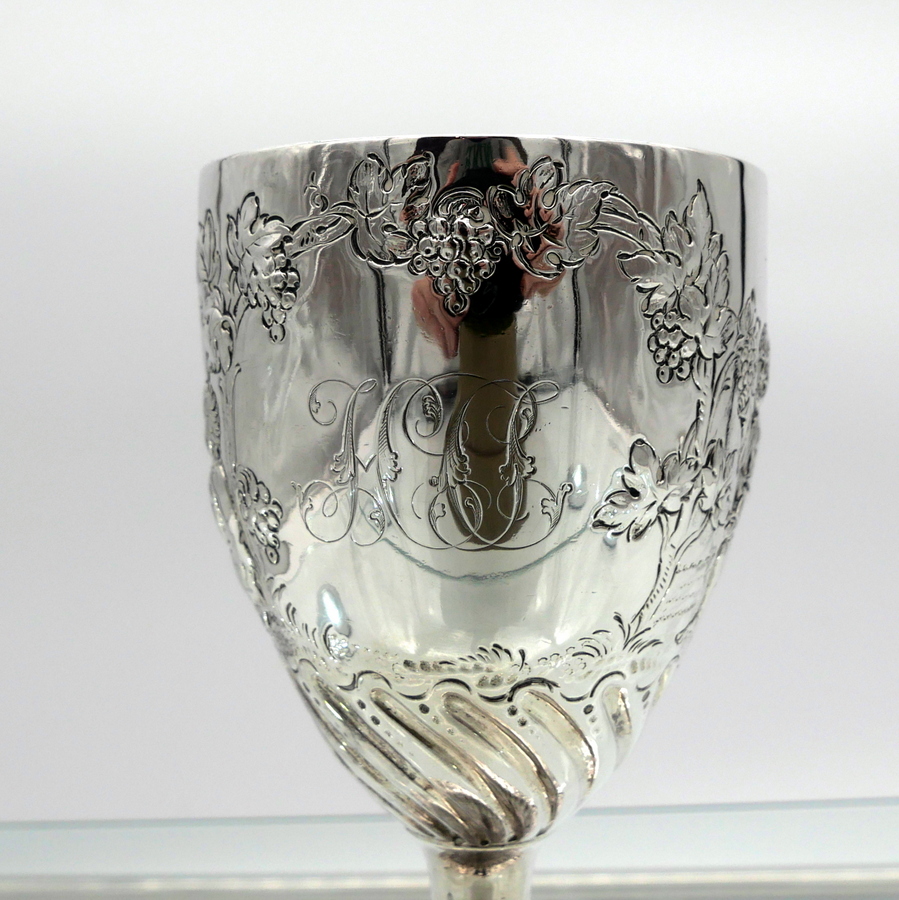 A beautiful Georgian silver wine goblet decorated with eye catching later chased (Victorian era) embossing stylish hand engraved entwined initials for importance.
