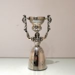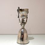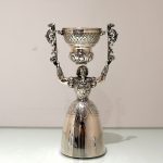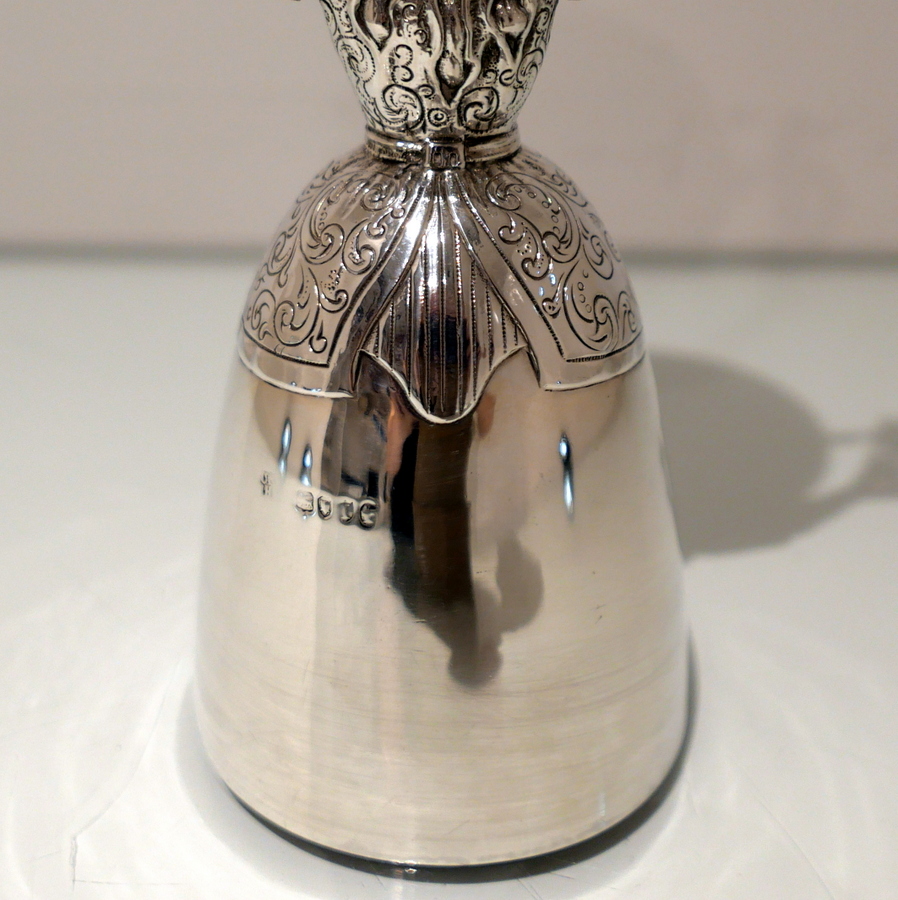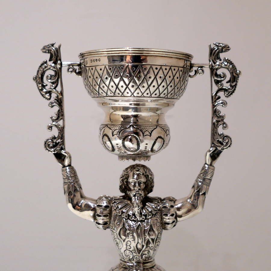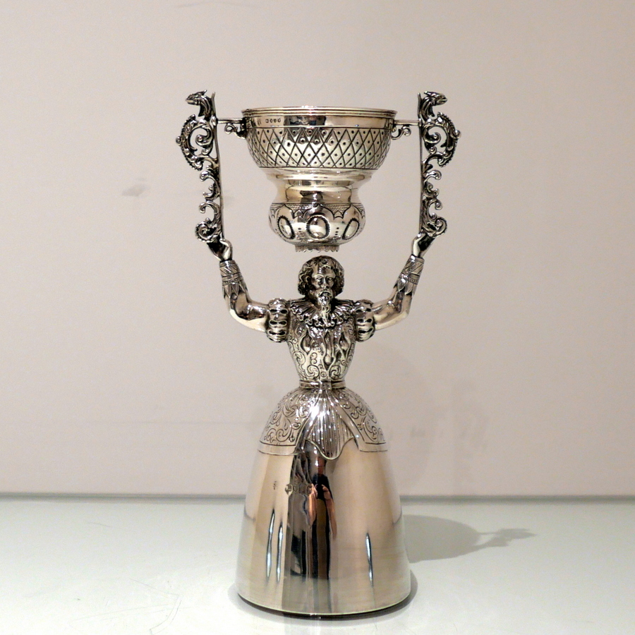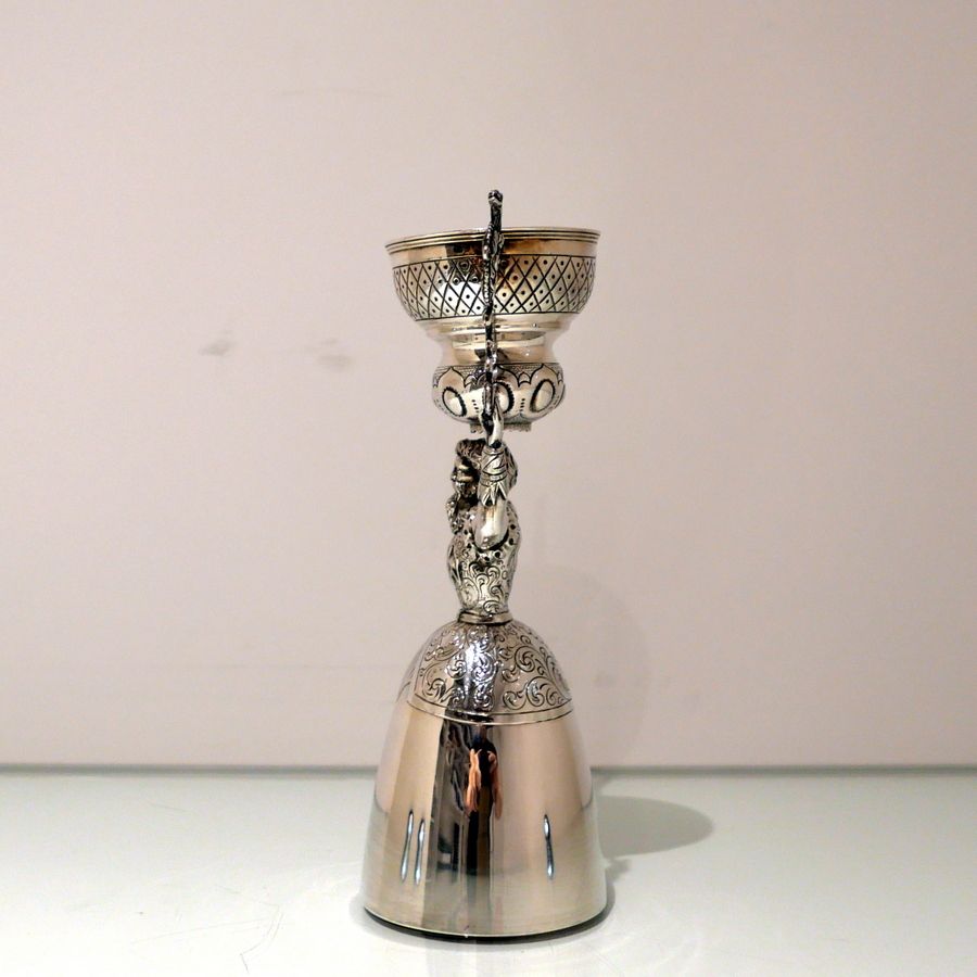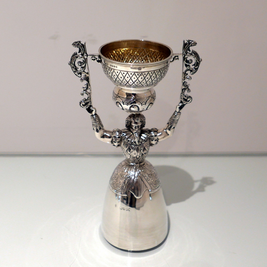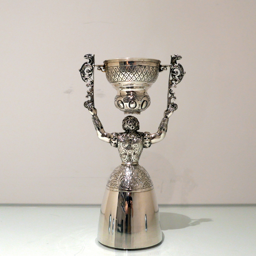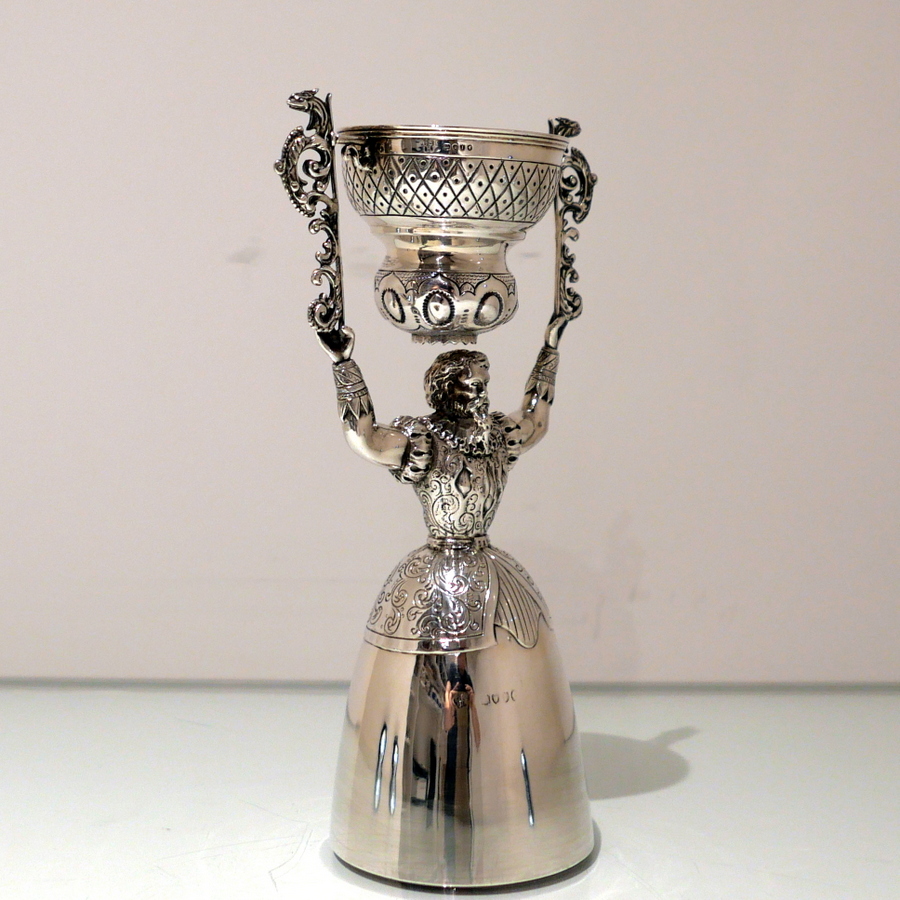 A rare and highly desirable English made Victorian silver wager cup designed with an elegant figural body, a stylish decorative bell skirt and an ornate upper swivel bowl.