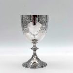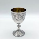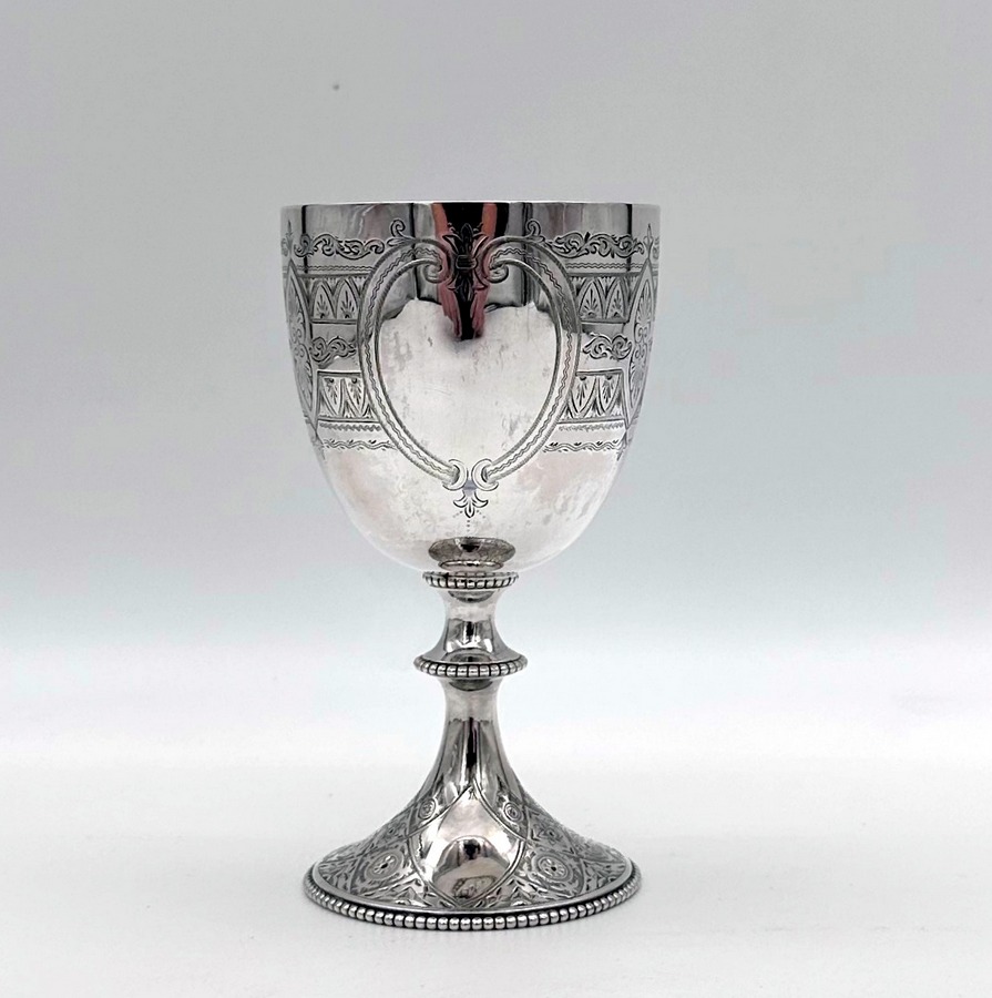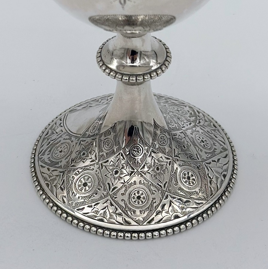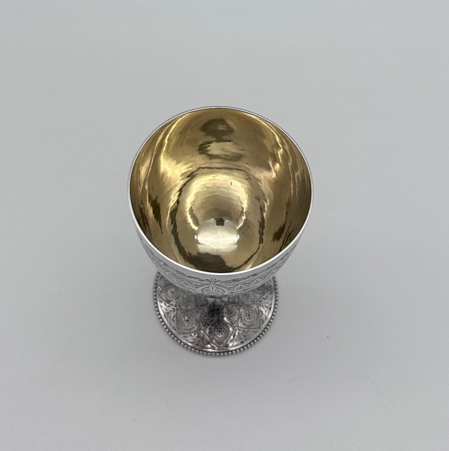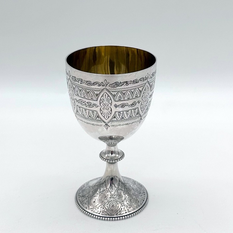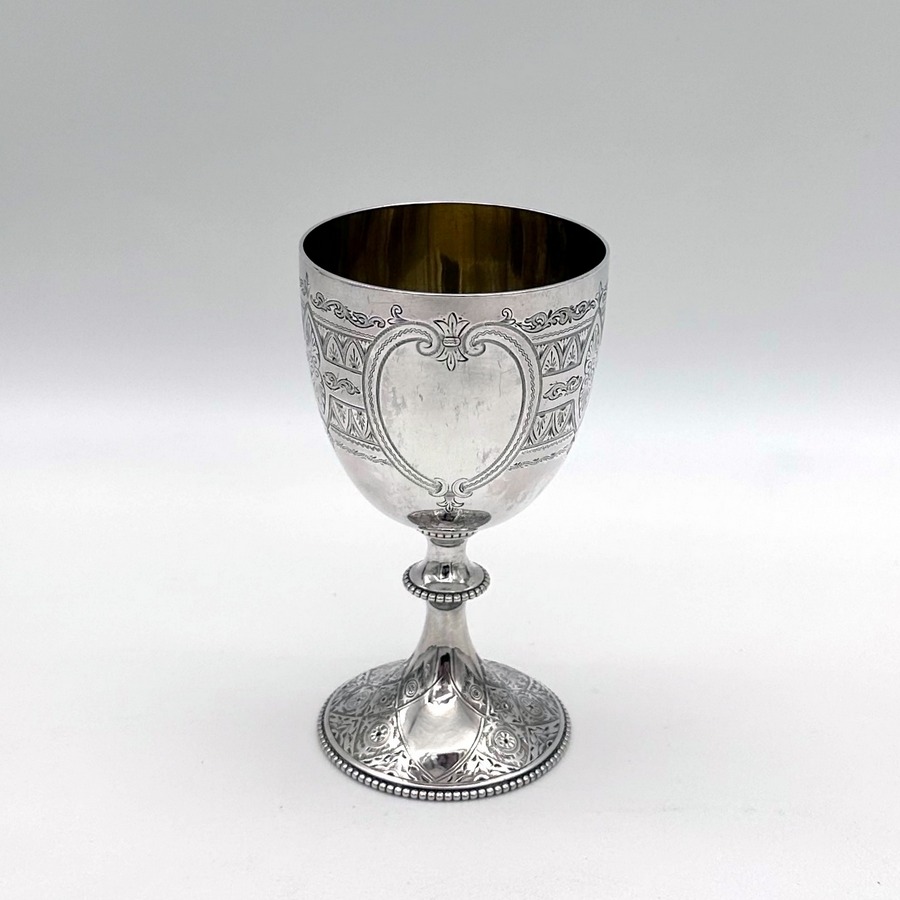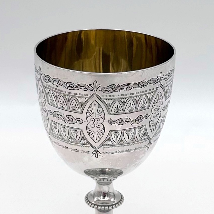 Delightfully beautiful Victorian silver wine goblet decorated with fabulous engraving and applied bead wires for lowlights. The centre front of the bowl has a stylish cartouche and the inside has been gilded.