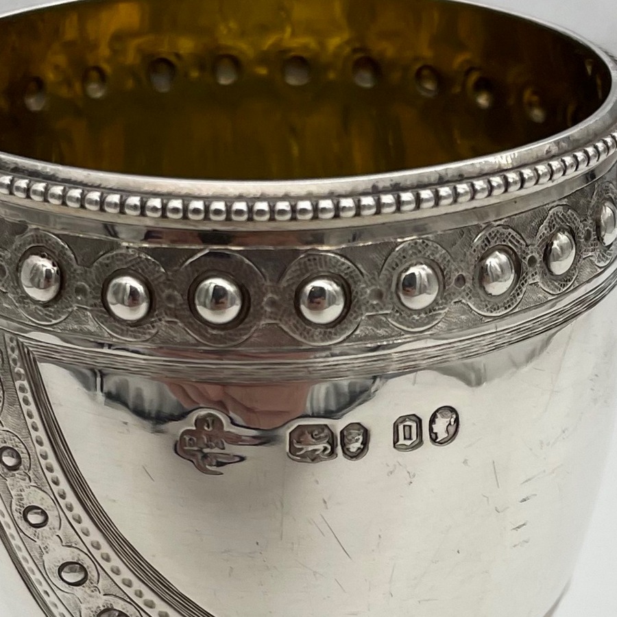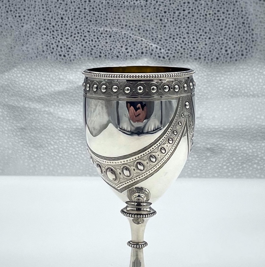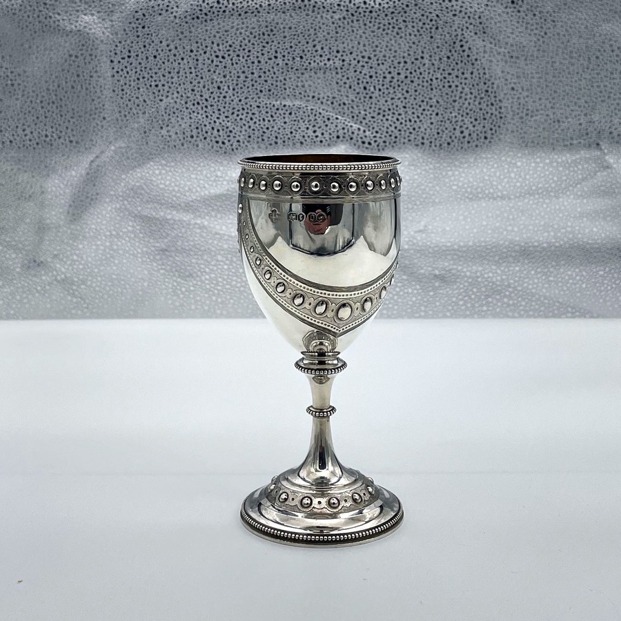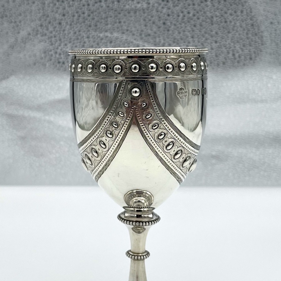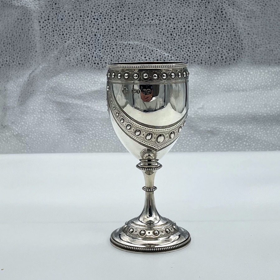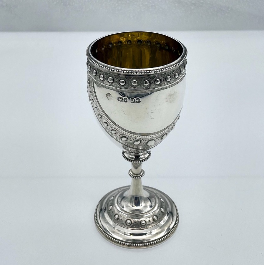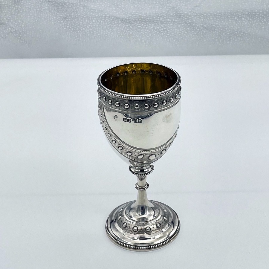 A wonderful sterling silver Victorian wine goblet designed with elegant bead themed highlights and stunning applied decorative hanging cast strap work. Â The decoration is repeated on the foot for lowlights.