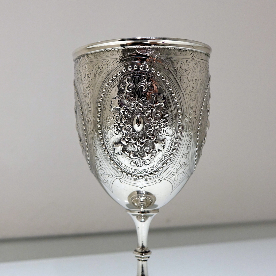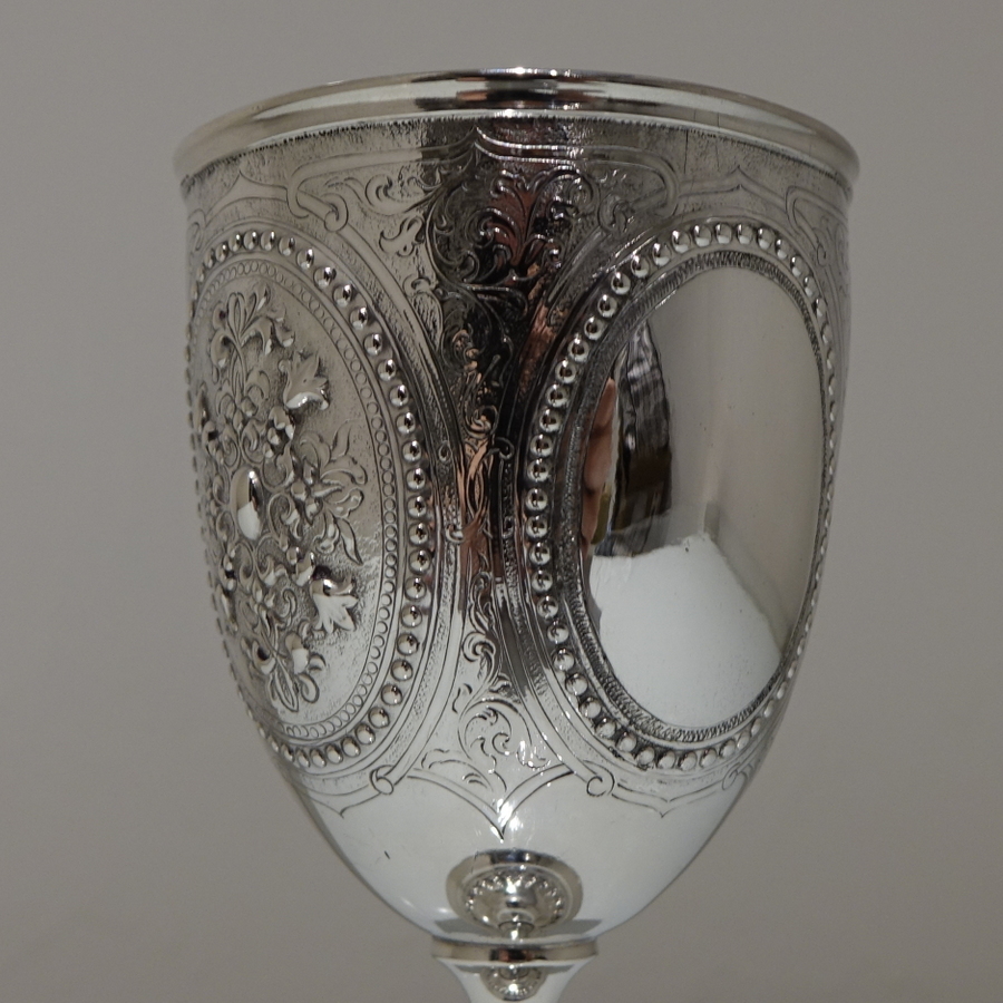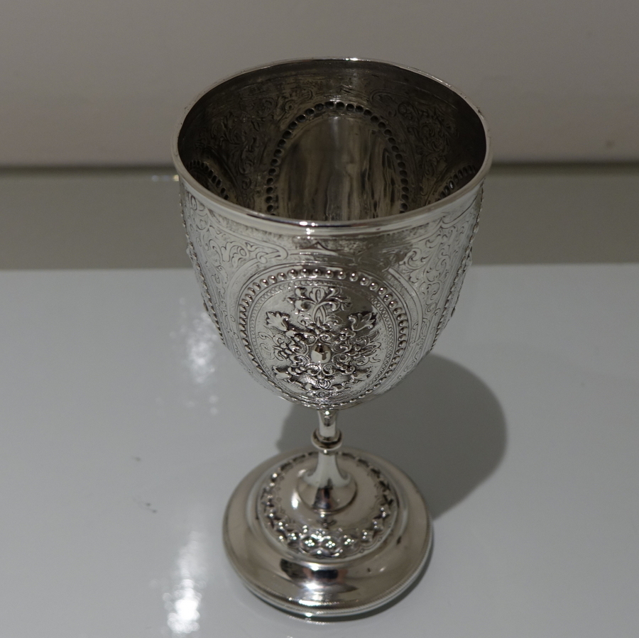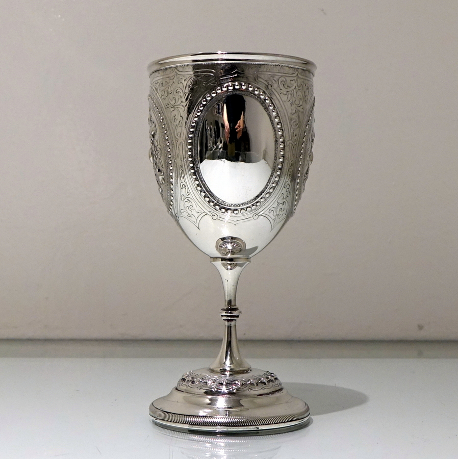 A wonderful 19th century Victorian silver wine goblet decorated with intricate engraving entwined around bead framed oval floral embossed plaques. Â The centre front of the bowl has an elegant cartouche.