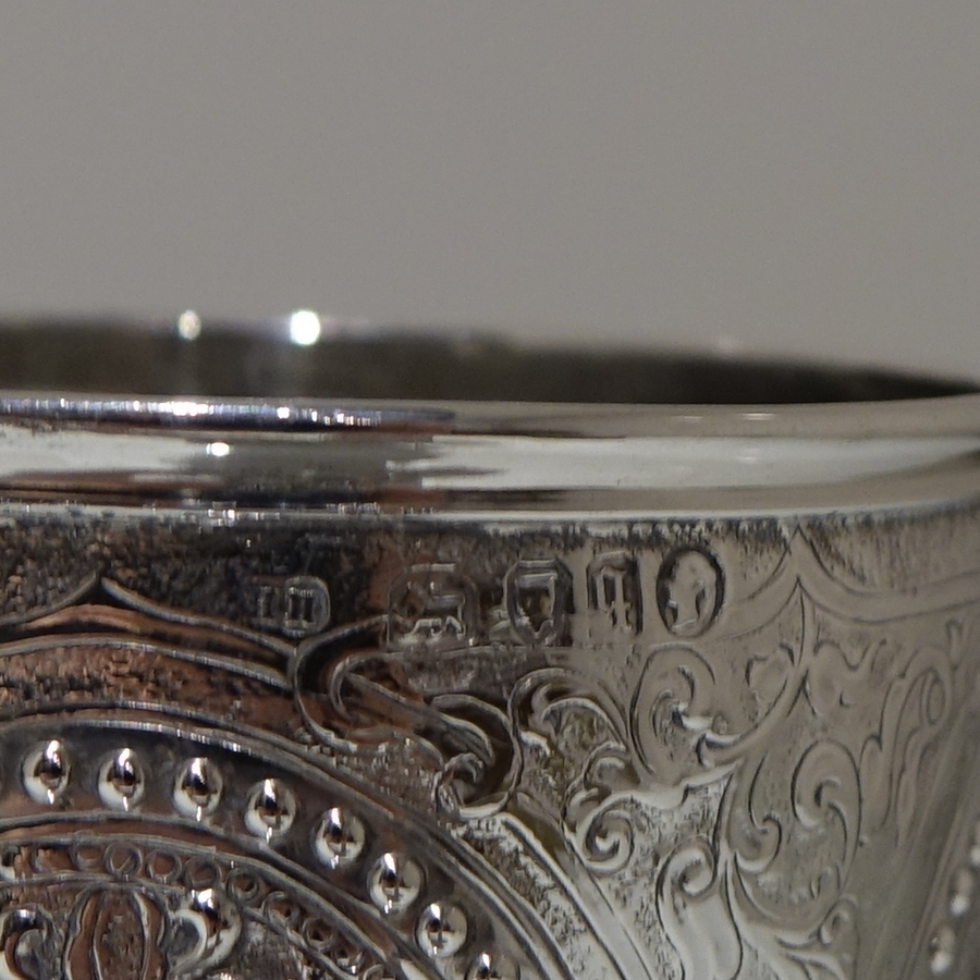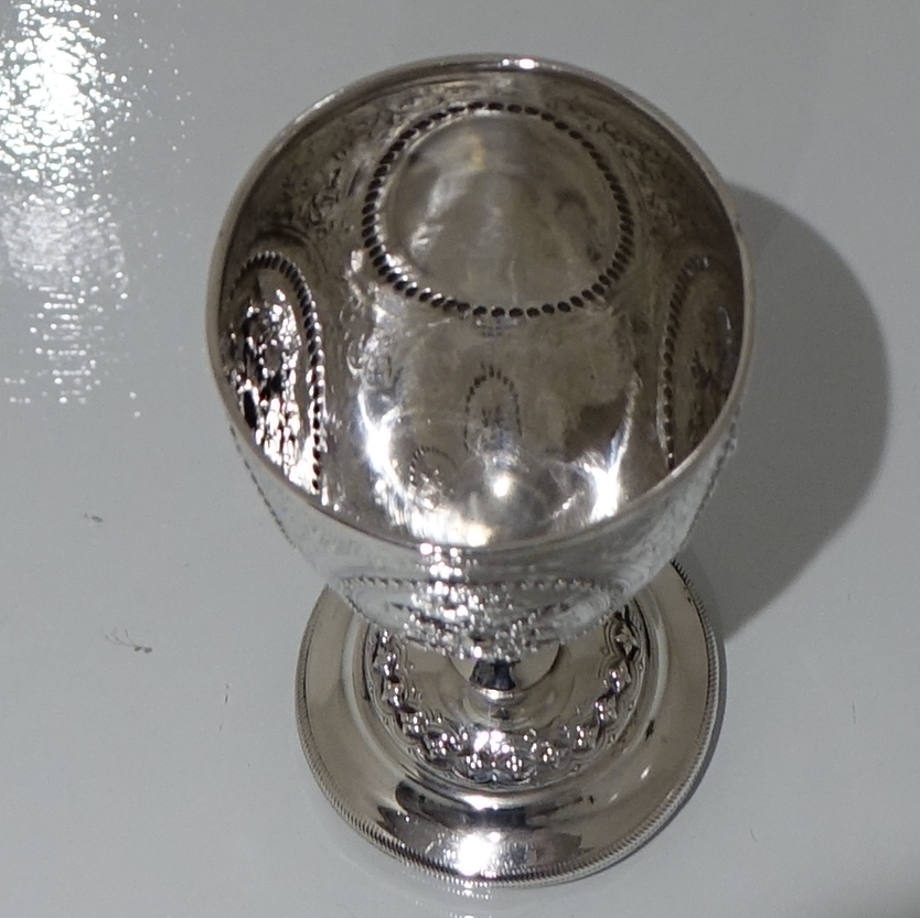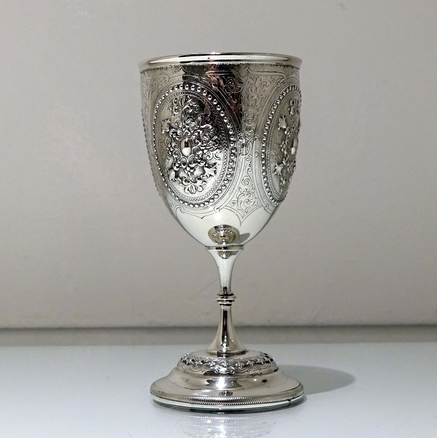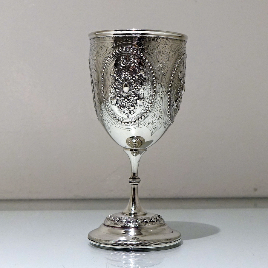 A wonderful 19th century Victorian silver wine goblet decorated with intricate engraving entwined around bead framed oval floral embossed plaques. Â The centre front of the bowl has an elegant cartouche.