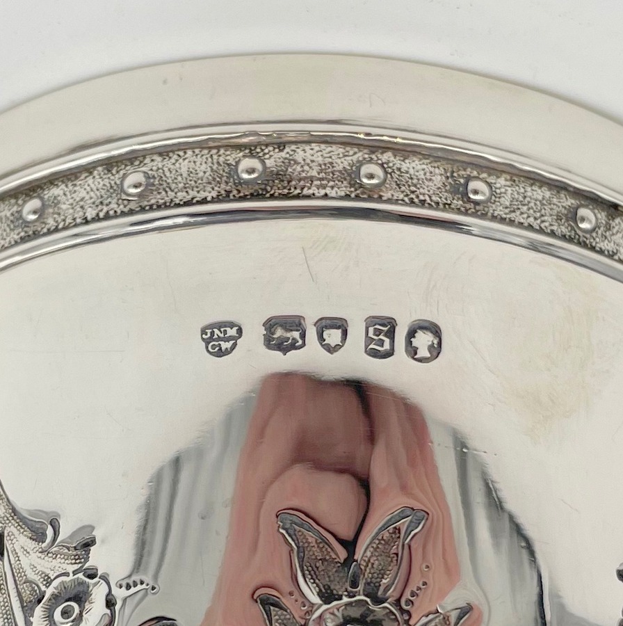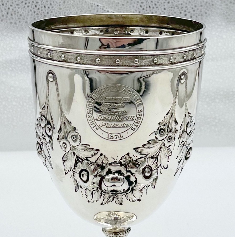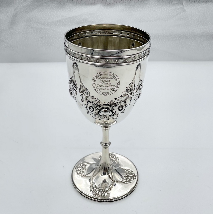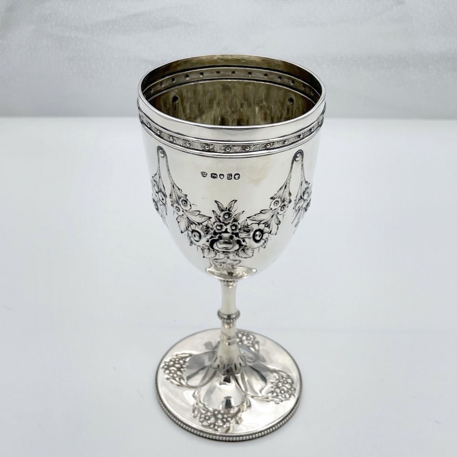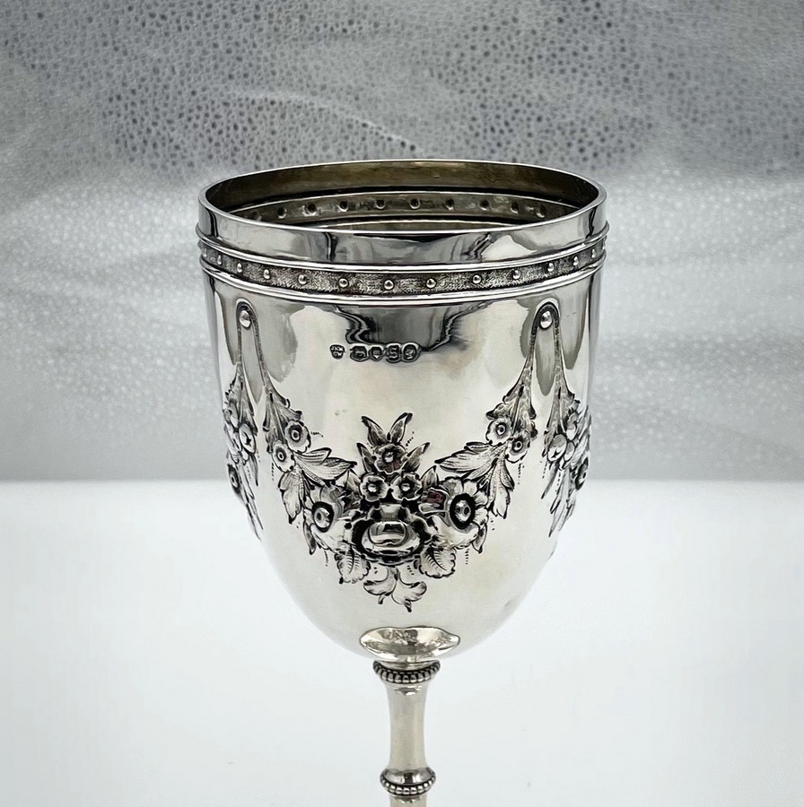A stylish sterling silver Victorian wine goblet decorated with wonderful embossed floral hanging garlands and a stylish upper Celtic style band to the bowl. Â The circular raised pedestal foot has an outer bead wire for lowlights. The centre front of the bowl has an elegant circular cartouche in which sits a contemporary presentational inscription.