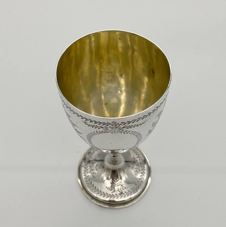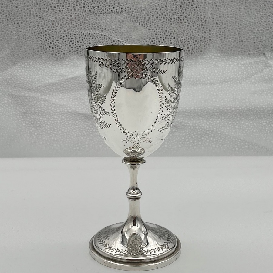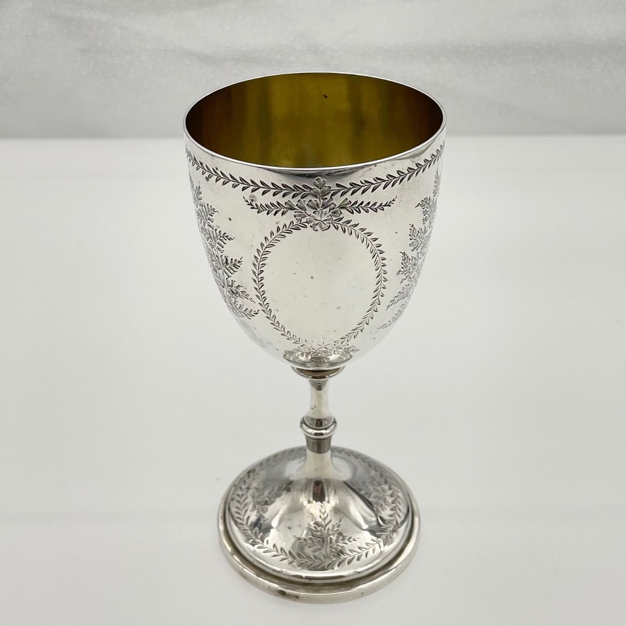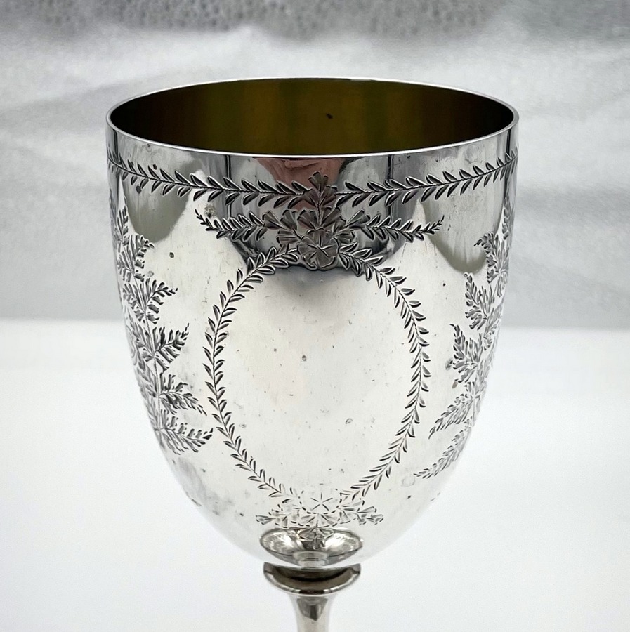 A beautiful Victorian silver wine goblet decorated with elegant fern engraving and a delightful double wreath cartouche.  The inside of the bowl has been gilt for decorative visual  contrast.