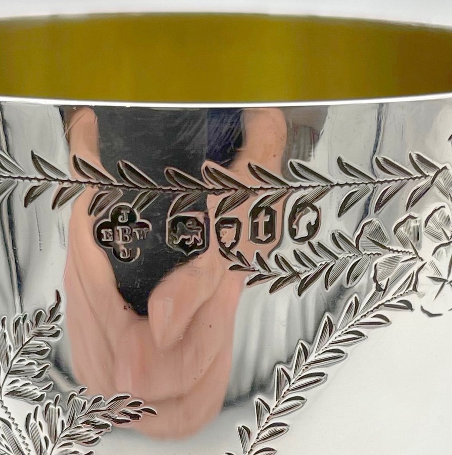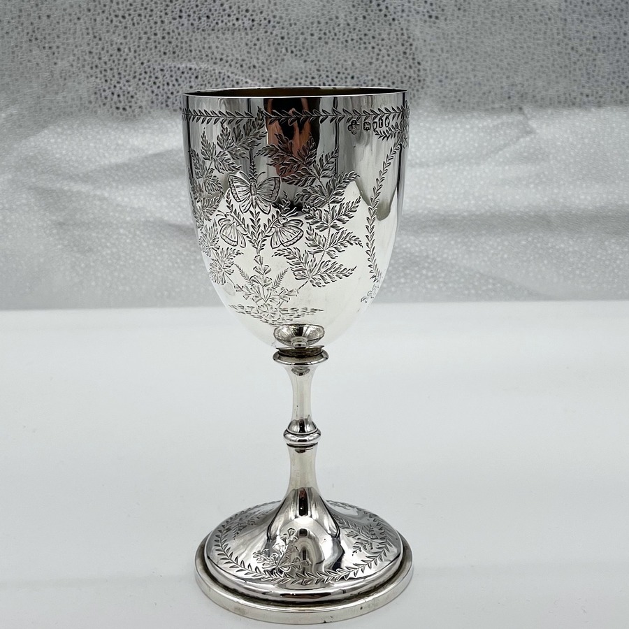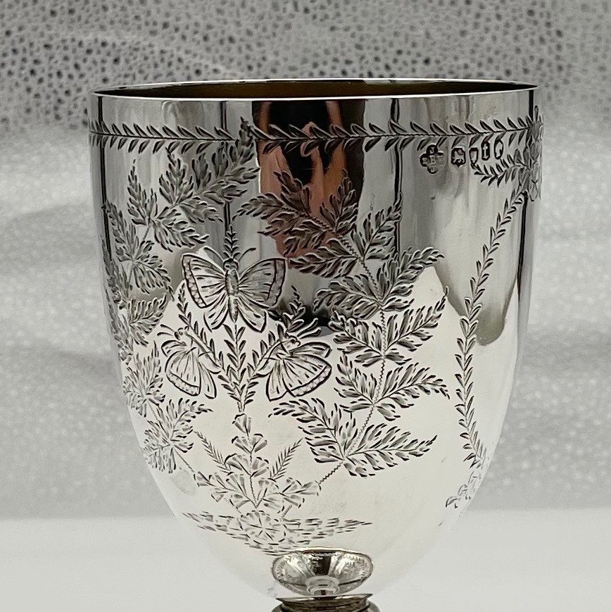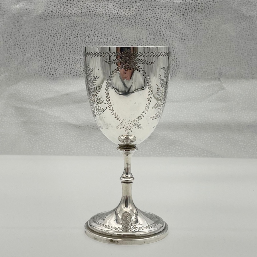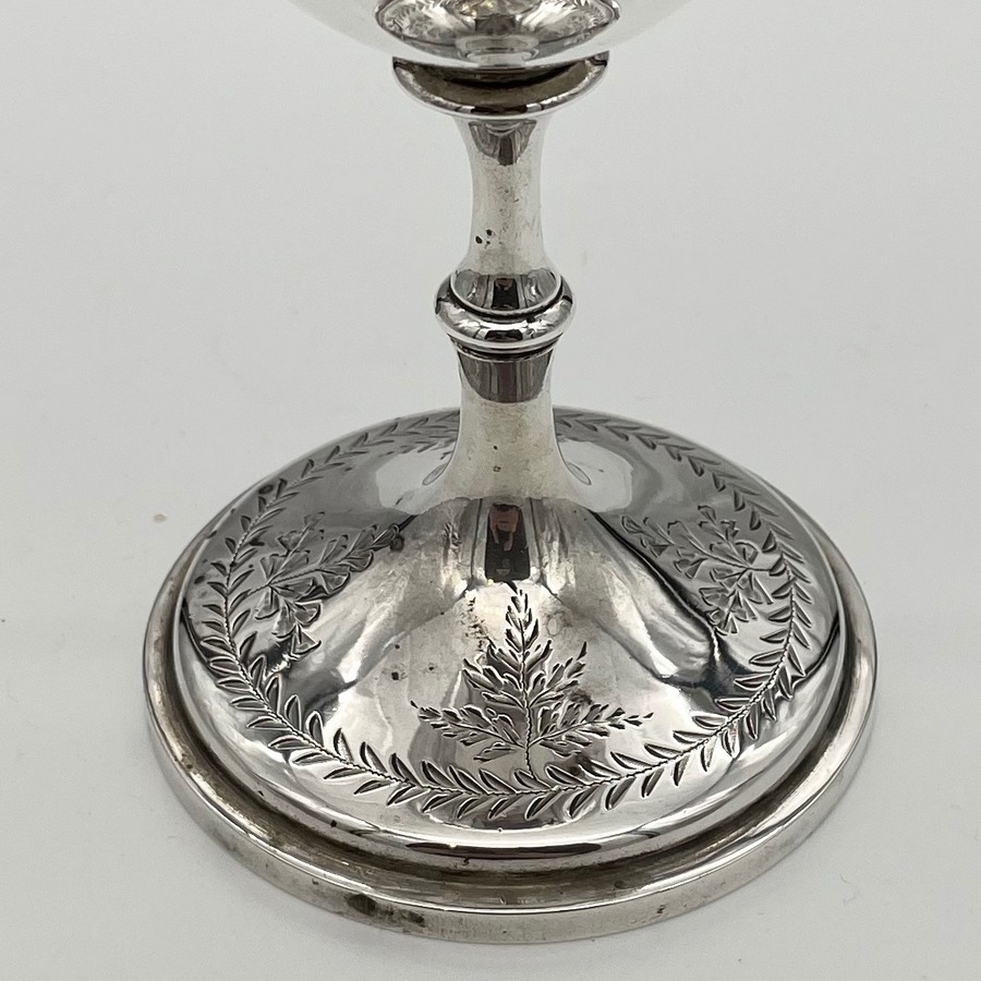 A beautiful Victorian silver wine goblet decorated with elegant fern engraving and a delightful double wreath cartouche.  The inside of the bowl has been gilt for decorative visual  contrast.