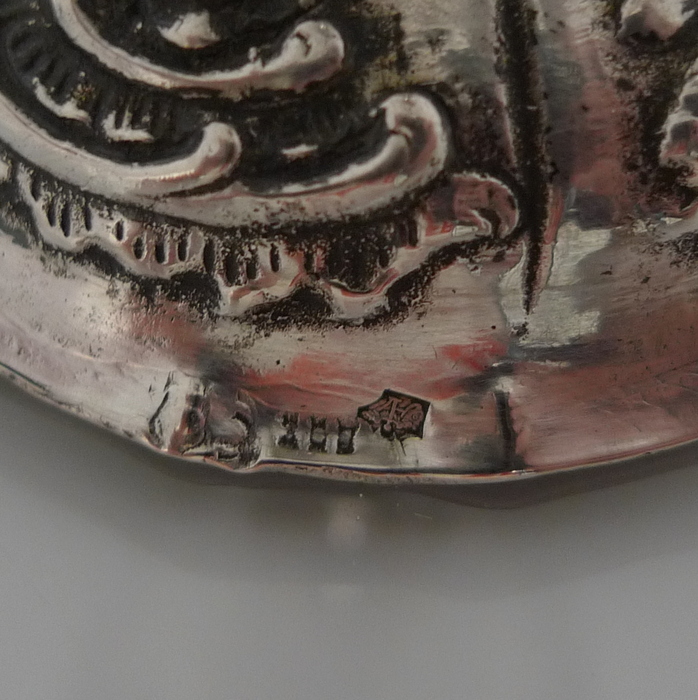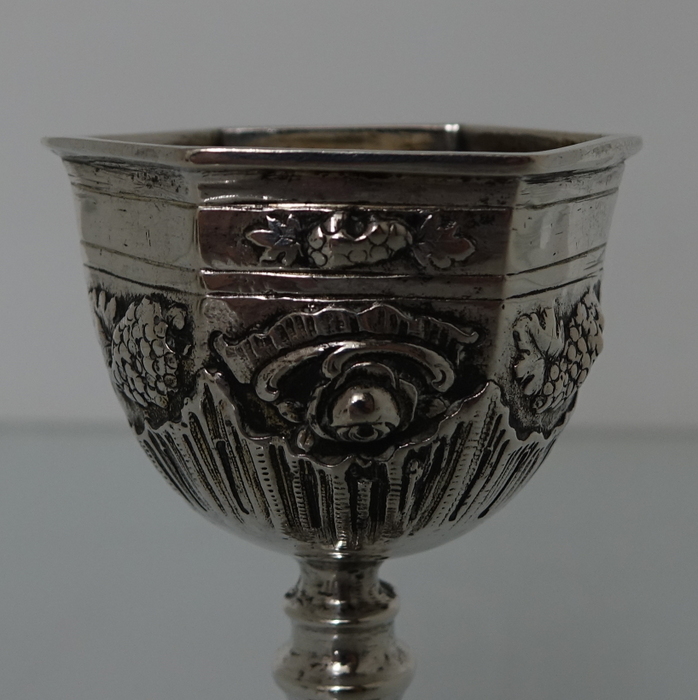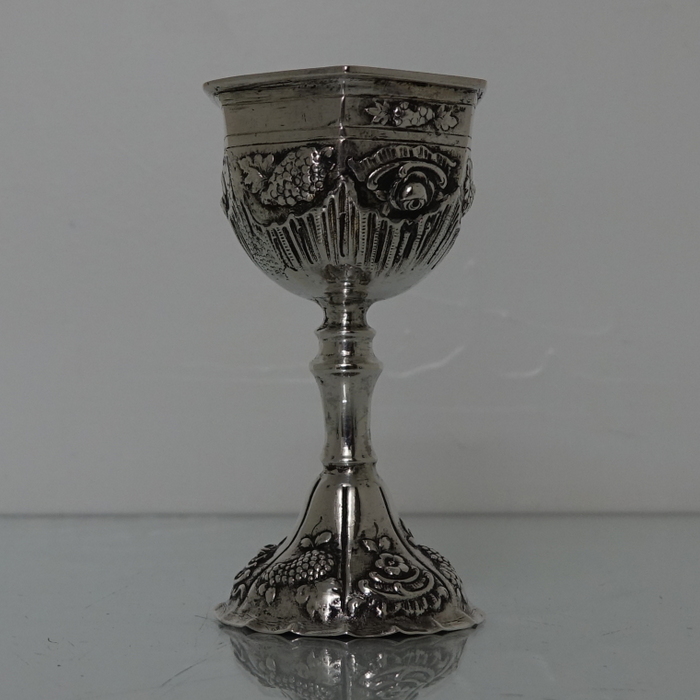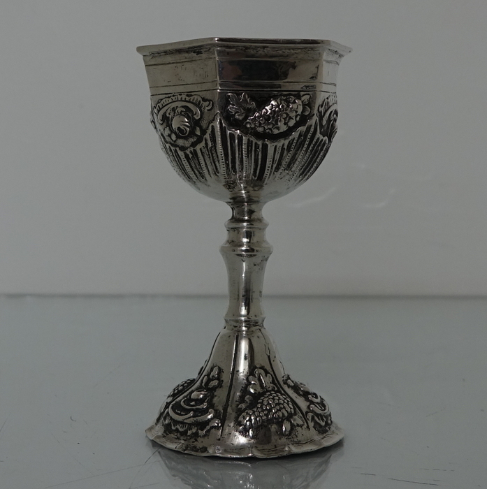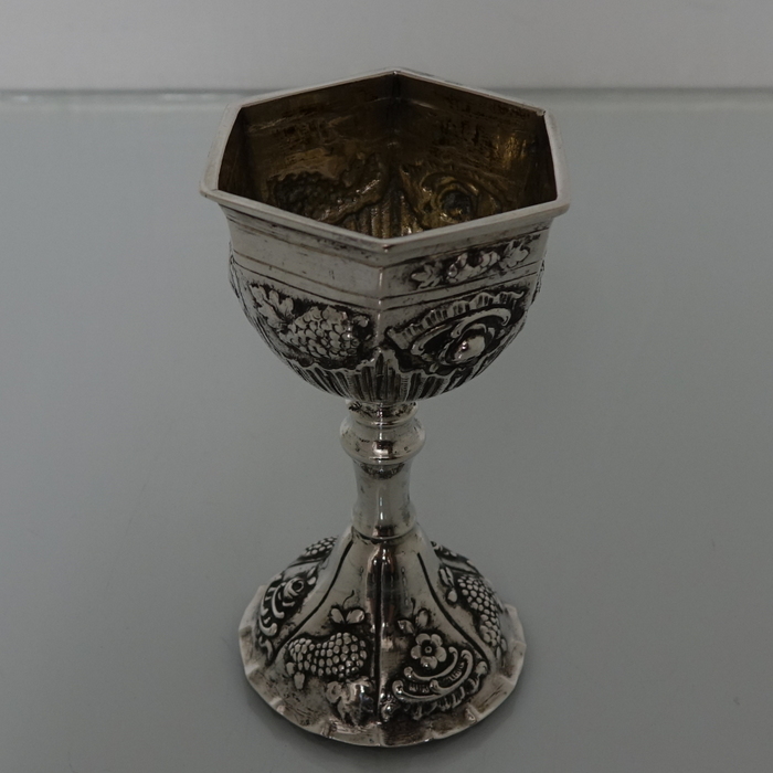 A very elegant antique cast formed kiddush cup. Â The bowl of the cup is octagonal in design and has floral motifs set on a matt background. Â The foot is circular with additional floral motifs for stunning lowlights.