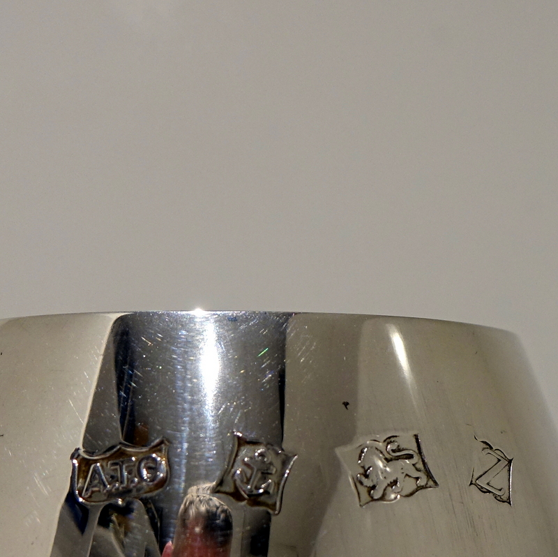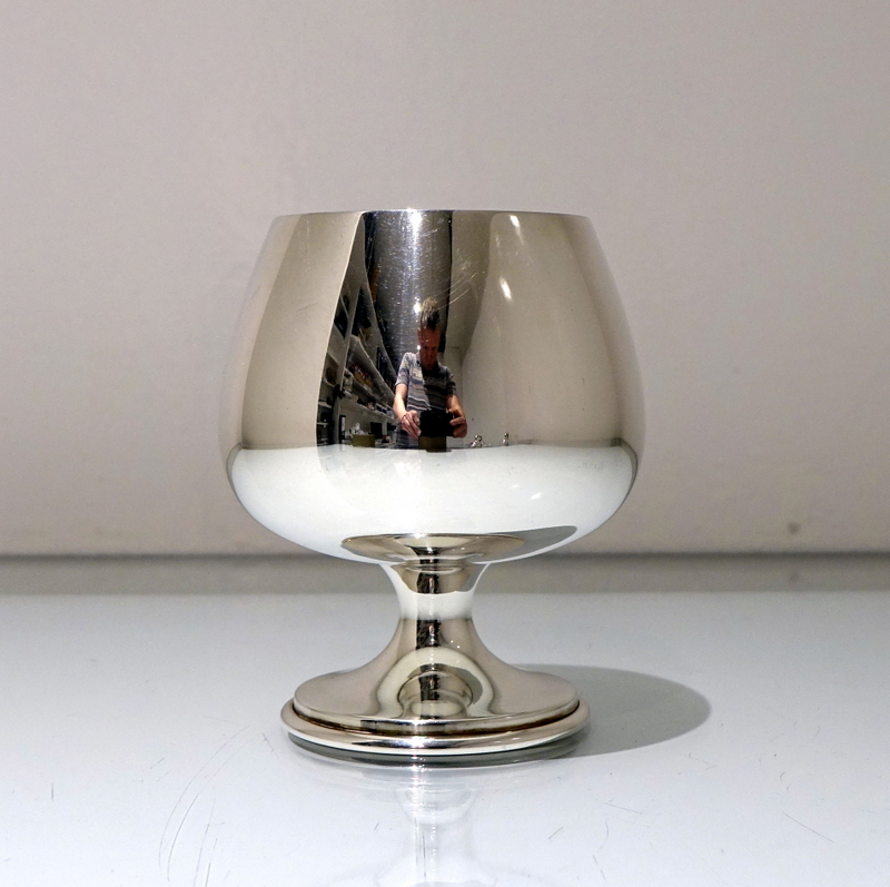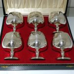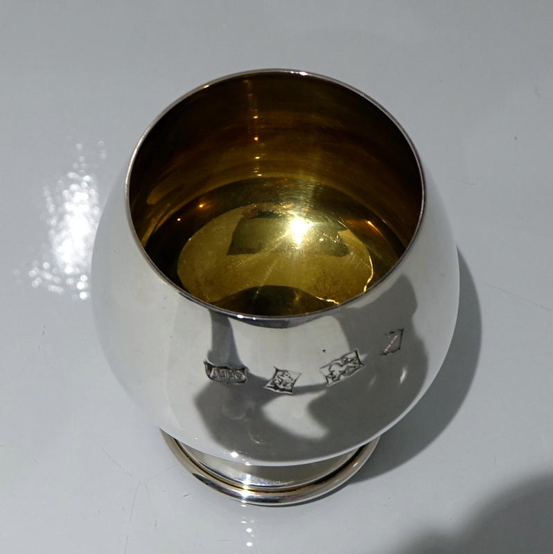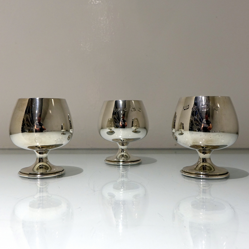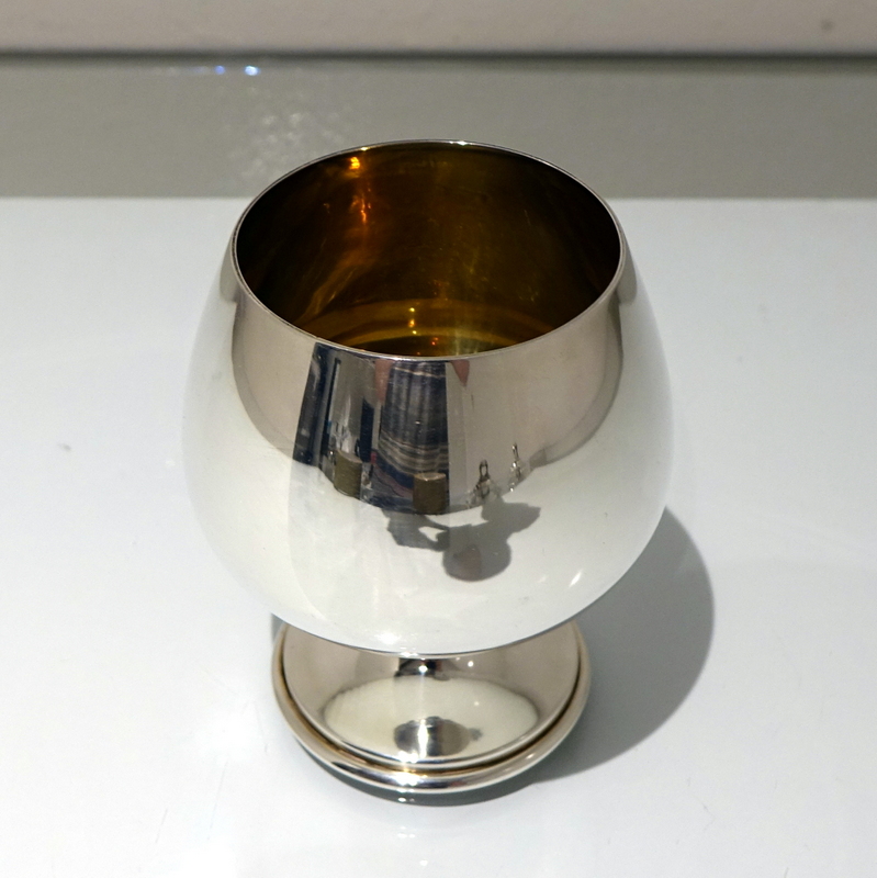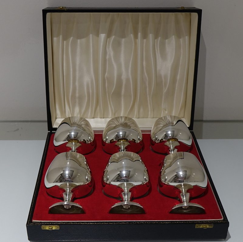 A splendid set of six plain formed sterling silver brandy goblets designed with bulbous bowls and highly visible “featured” hallmarks set in a red and white velvet lined presentation case.