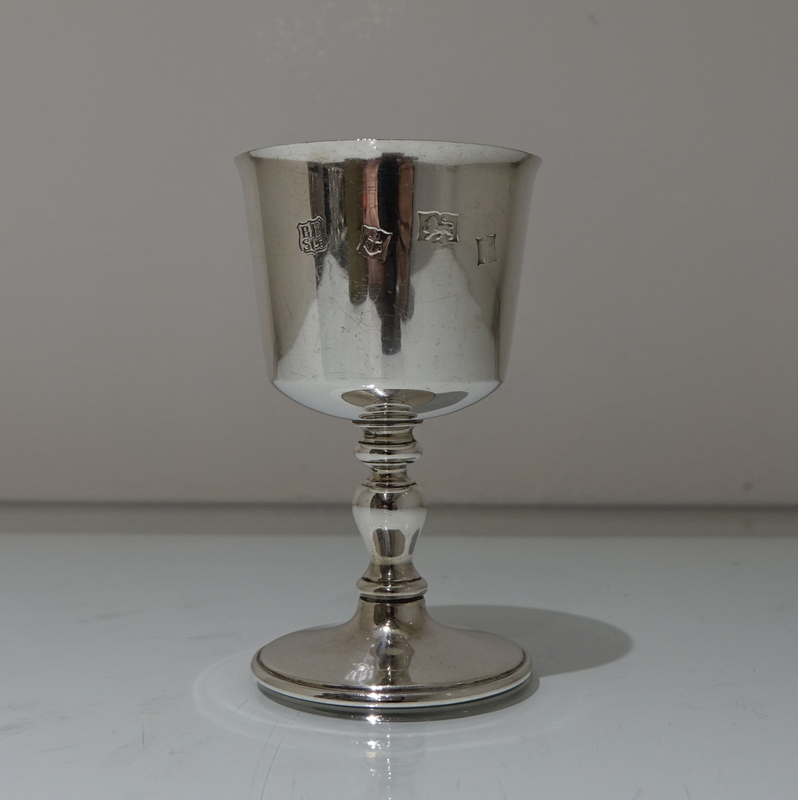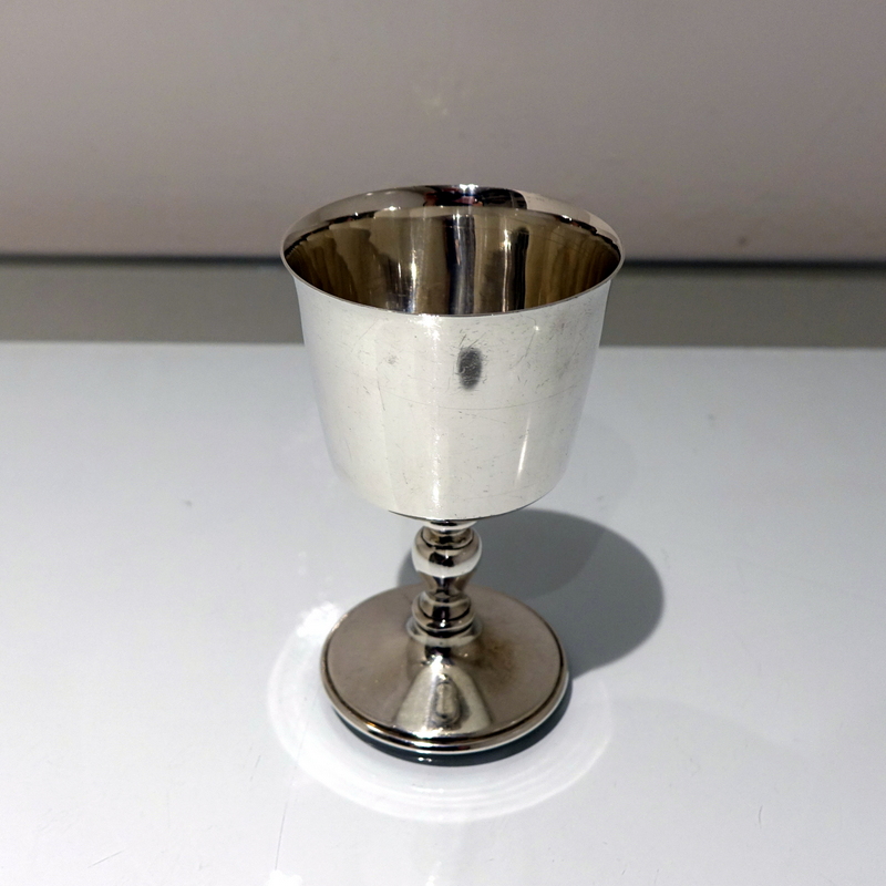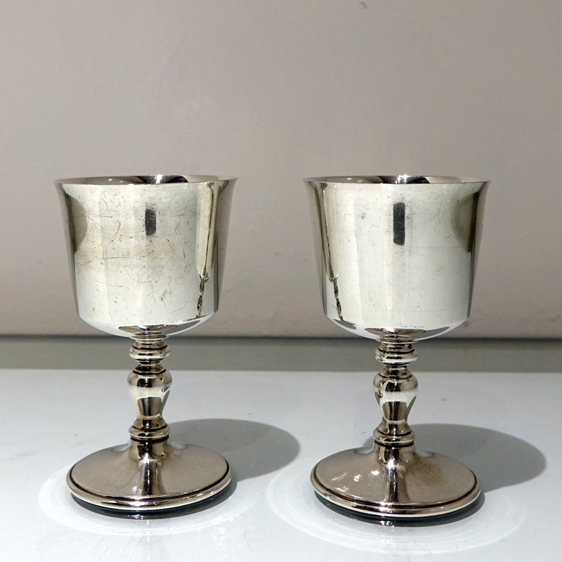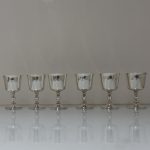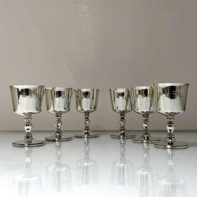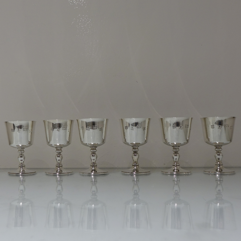 A sweet set of six plain formed silver wine goblets sitting on a raised circular pedestal foot. Â The bowls of the goblets are centrally hallmarked for decoration.