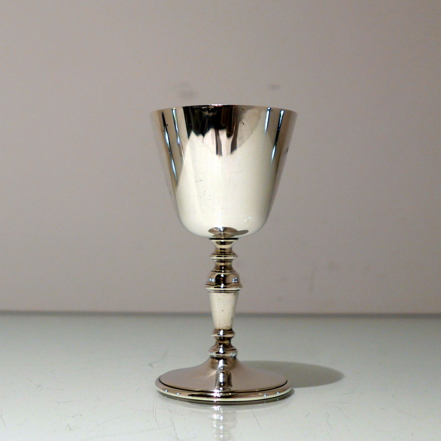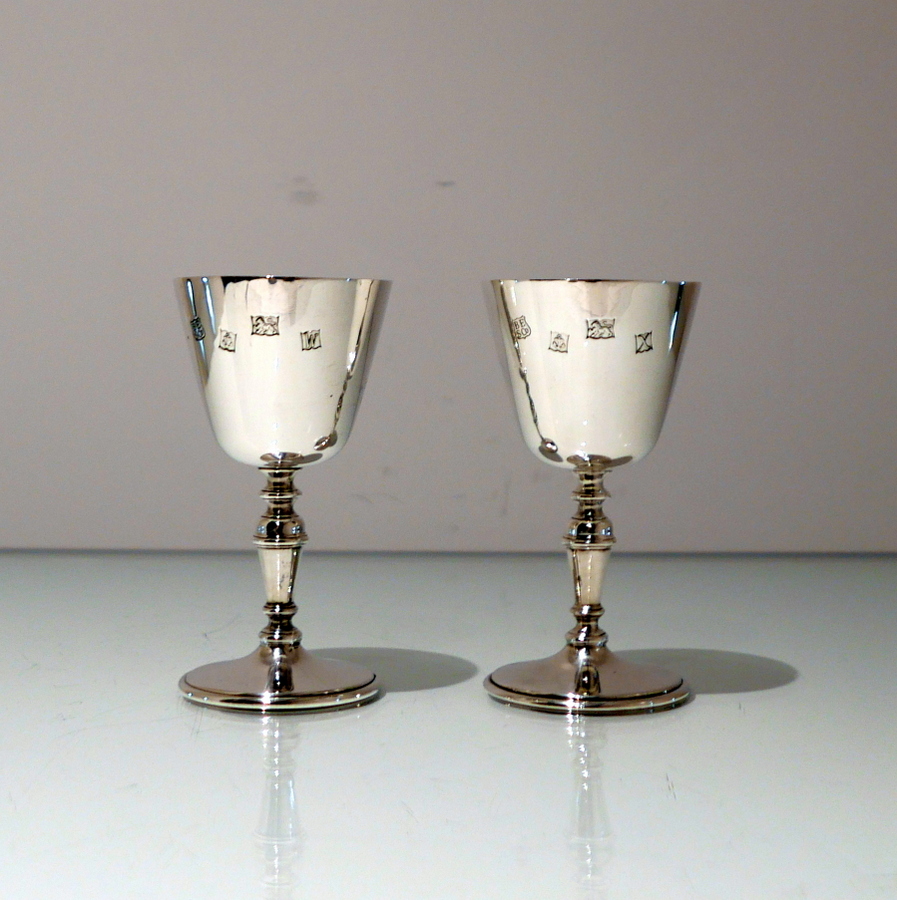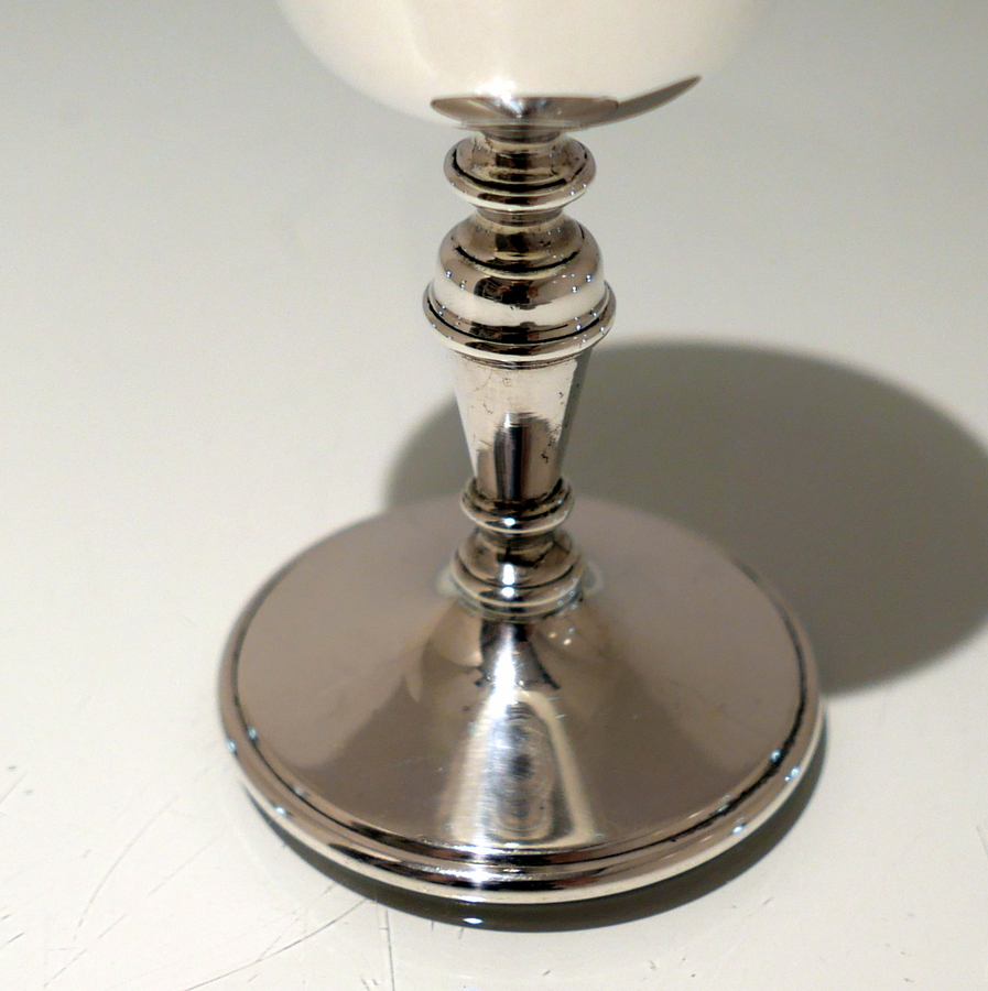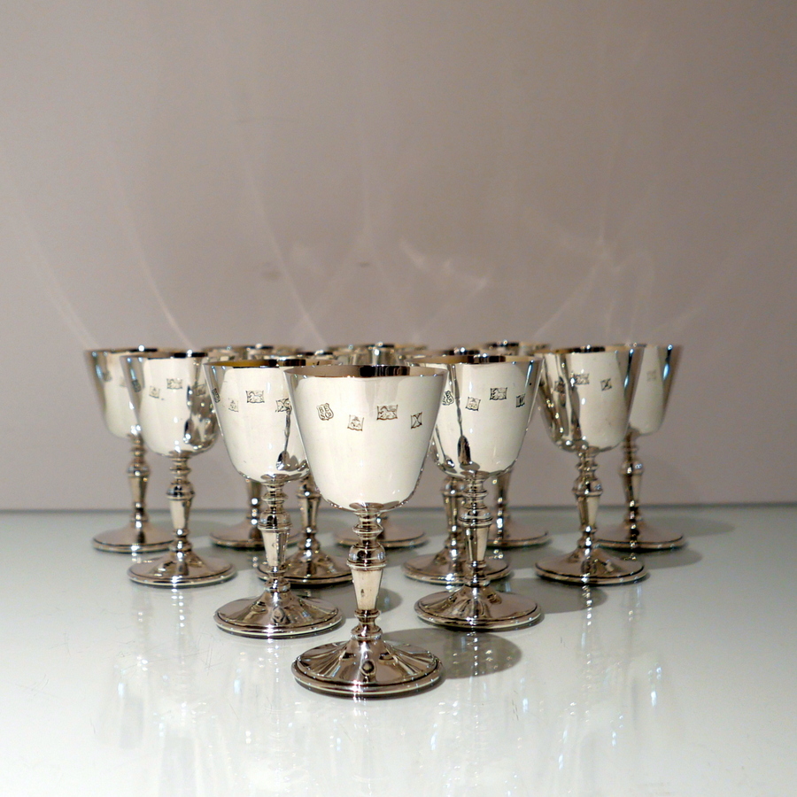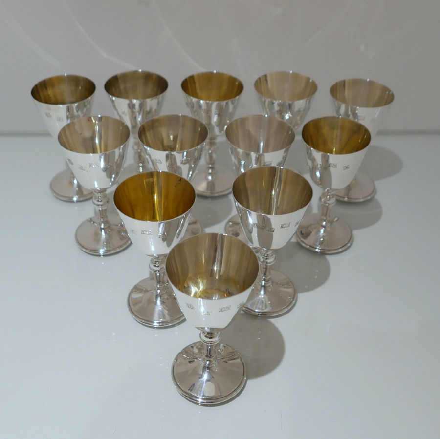 A delightful suite of twelve sterling silver wine goblets designed with elegant tapering bowls which sit on a stylish circular raised pedestal foot.