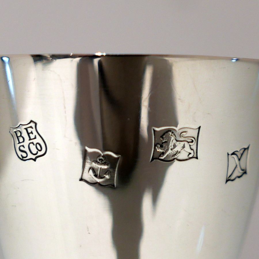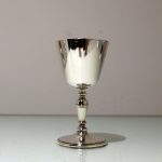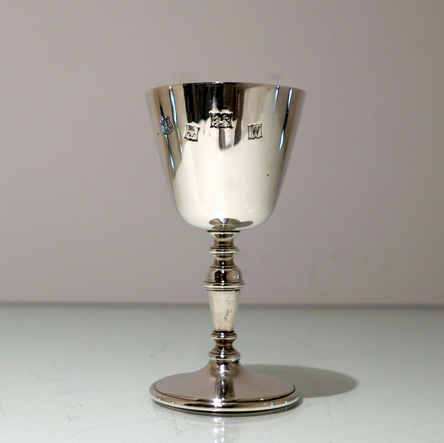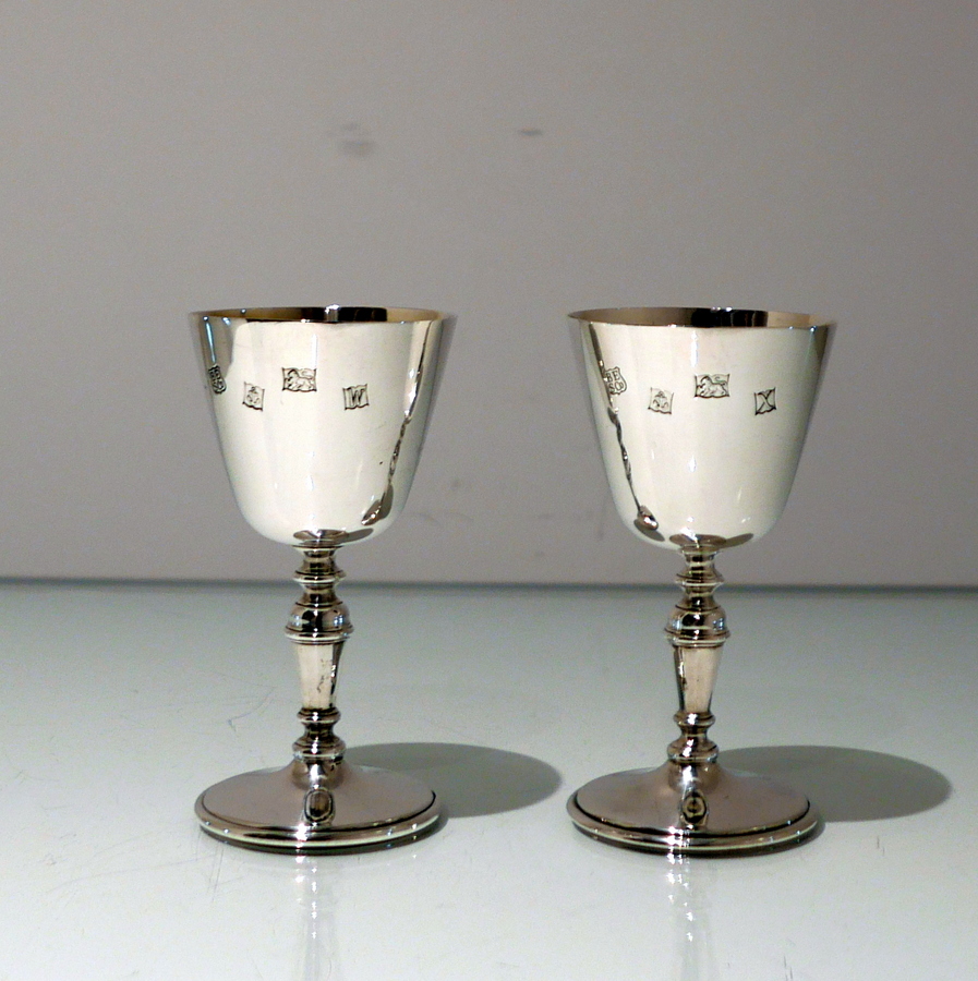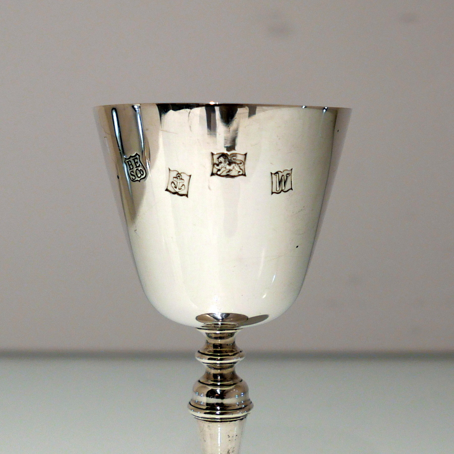 A delightful suite of twelve sterling silver wine goblets designed with elegant tapering bowls which sit on a stylish circular raised pedestal foot.