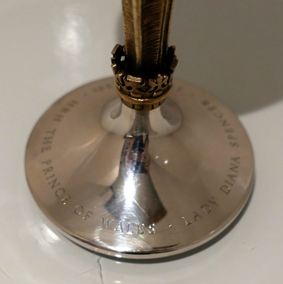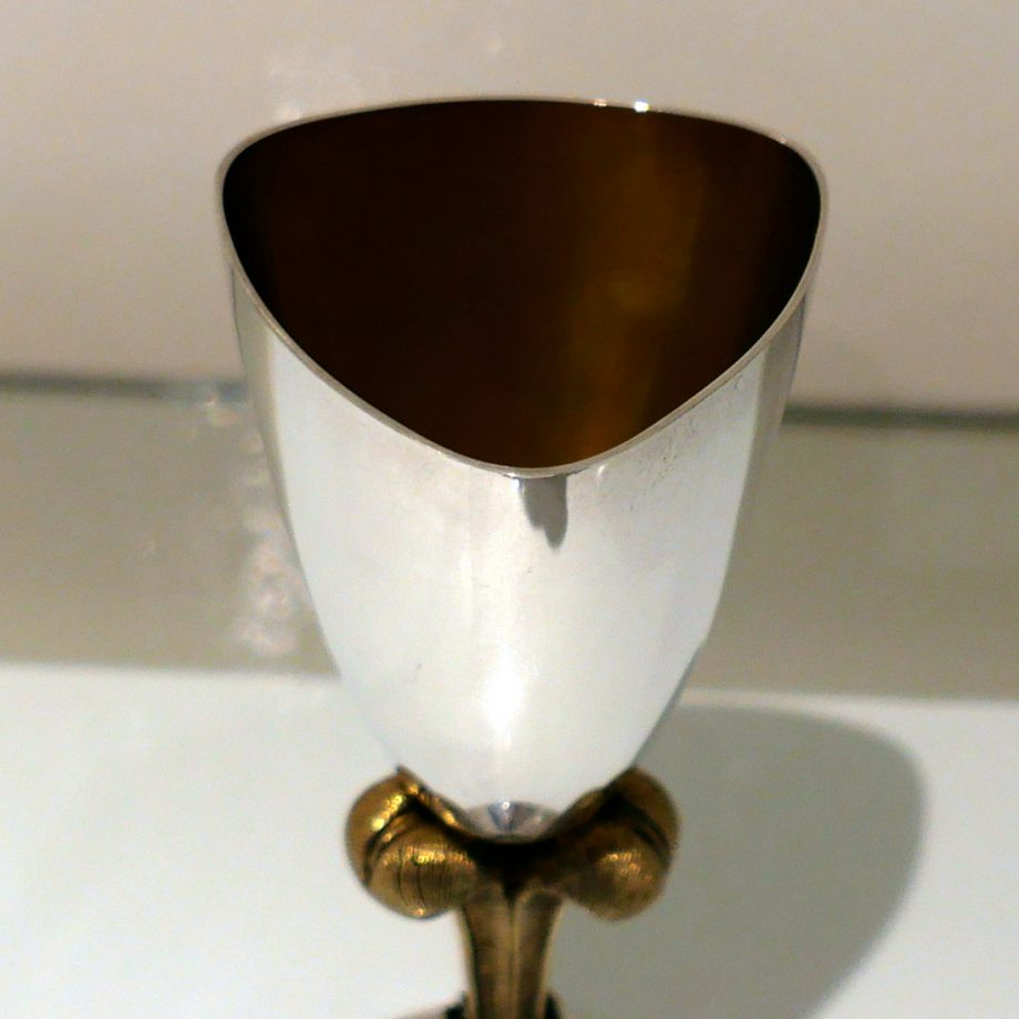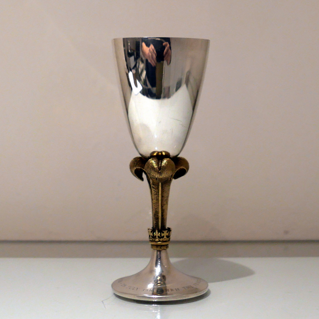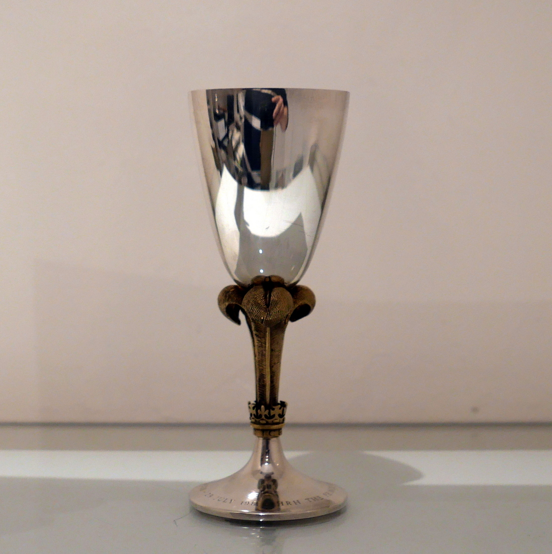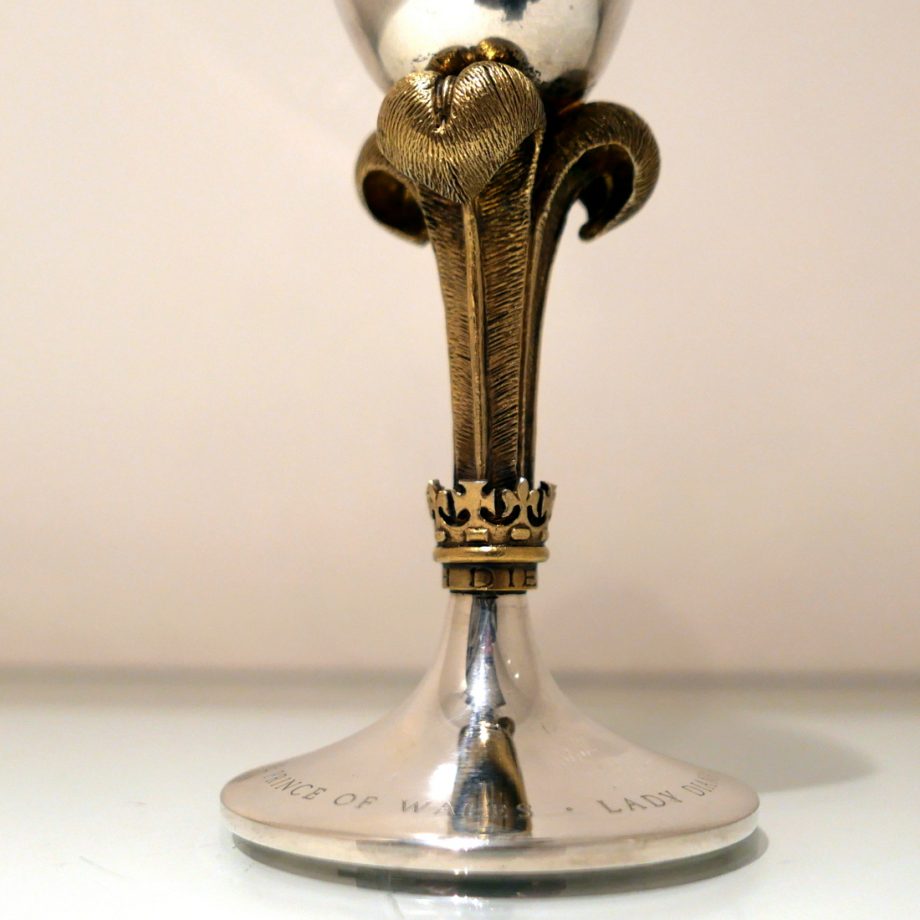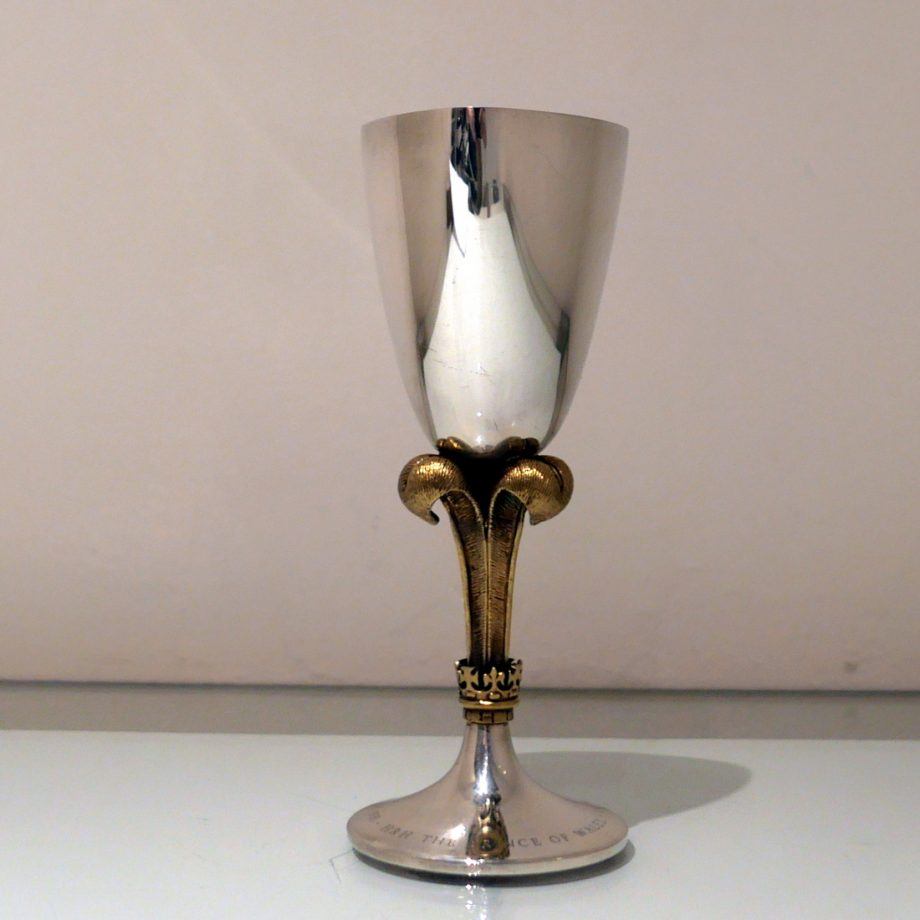A stunning and highly collectable Stuart Devlin commemorative silver wine goblet designed with an unusual shaped bowl and stylish Prince of Wales feathers stem which is taken (copied) from the heraldic badge of the Prince of Wales.