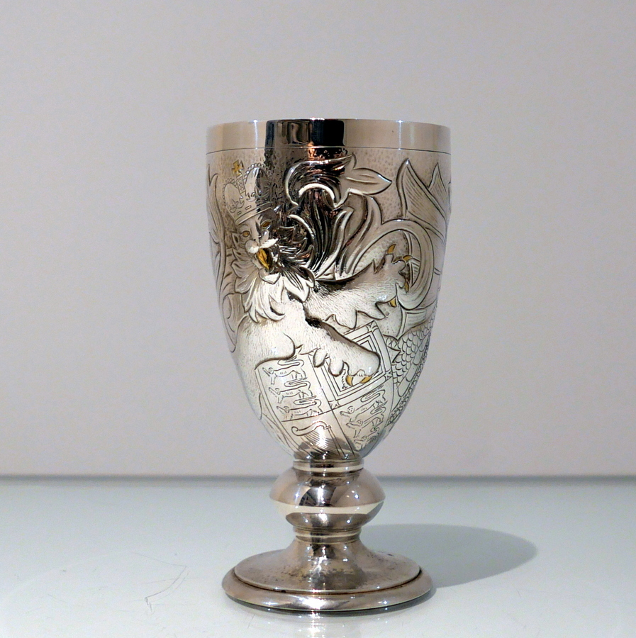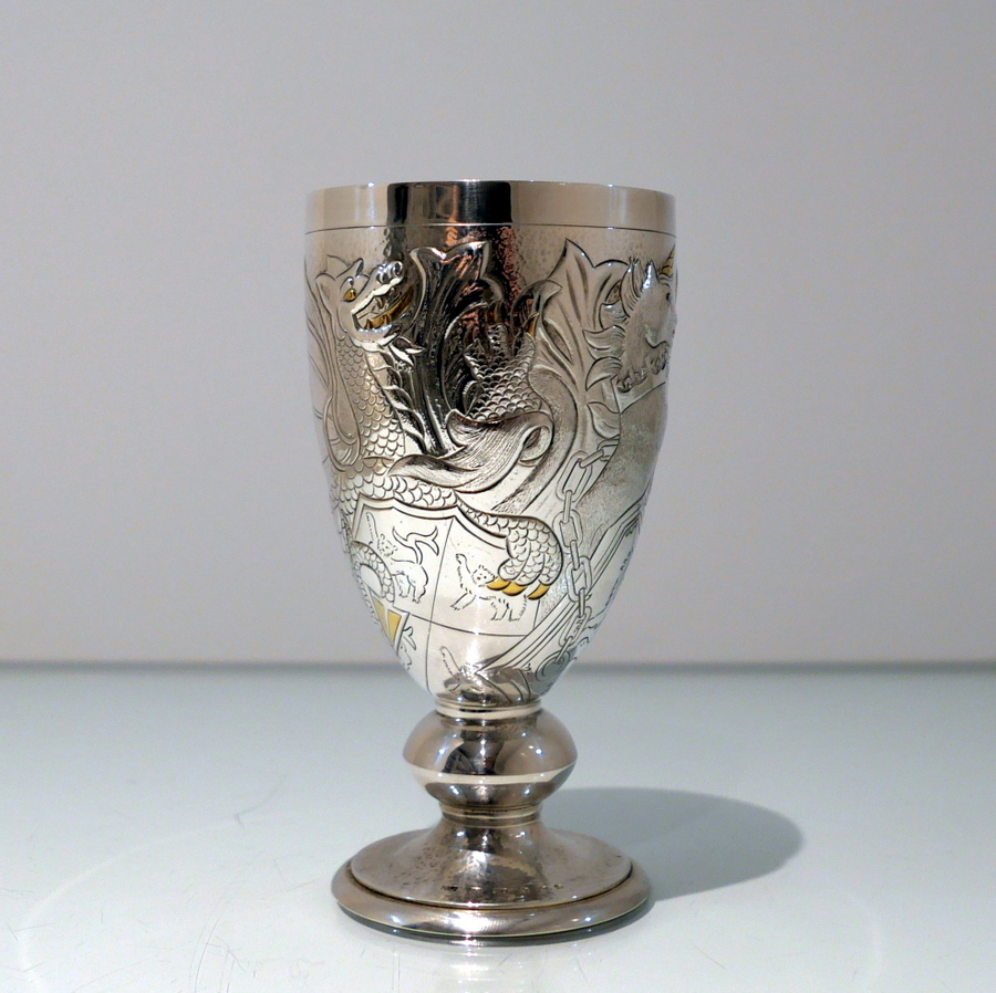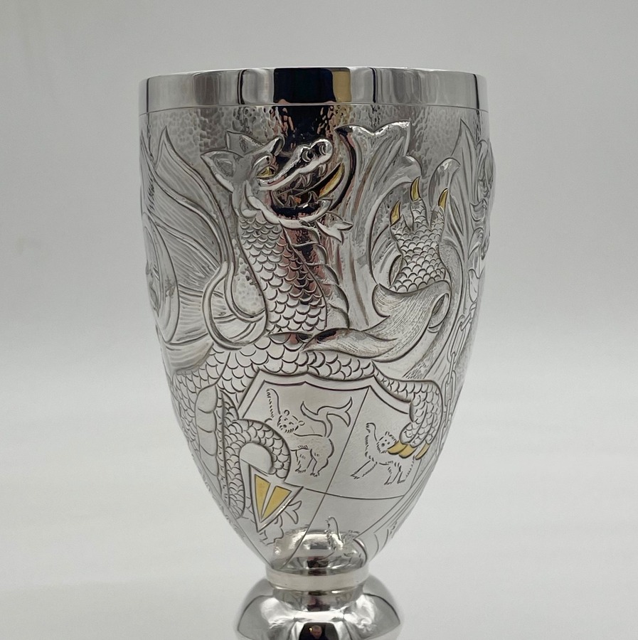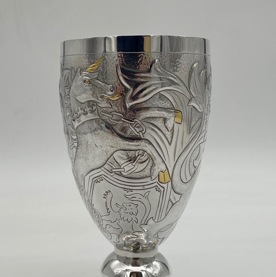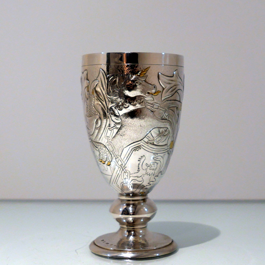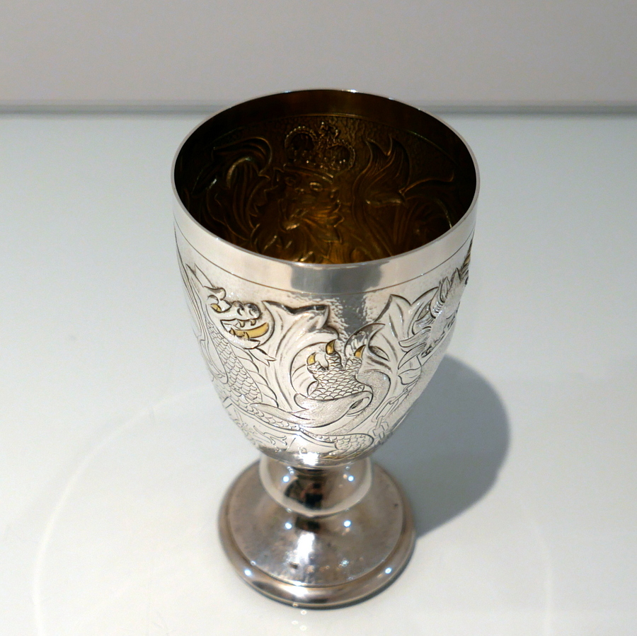 A silver parcel gilt commemorative goblet, London 2002, Richard Jarvis, the Golden Jubilee of Queen Elizabeth II, with chased heraldic decoration, The Lion of England, The Red Dragon of Wales and The Unicorn of Scotland, limited edition of 250.