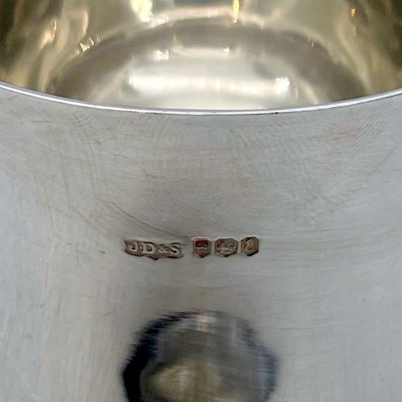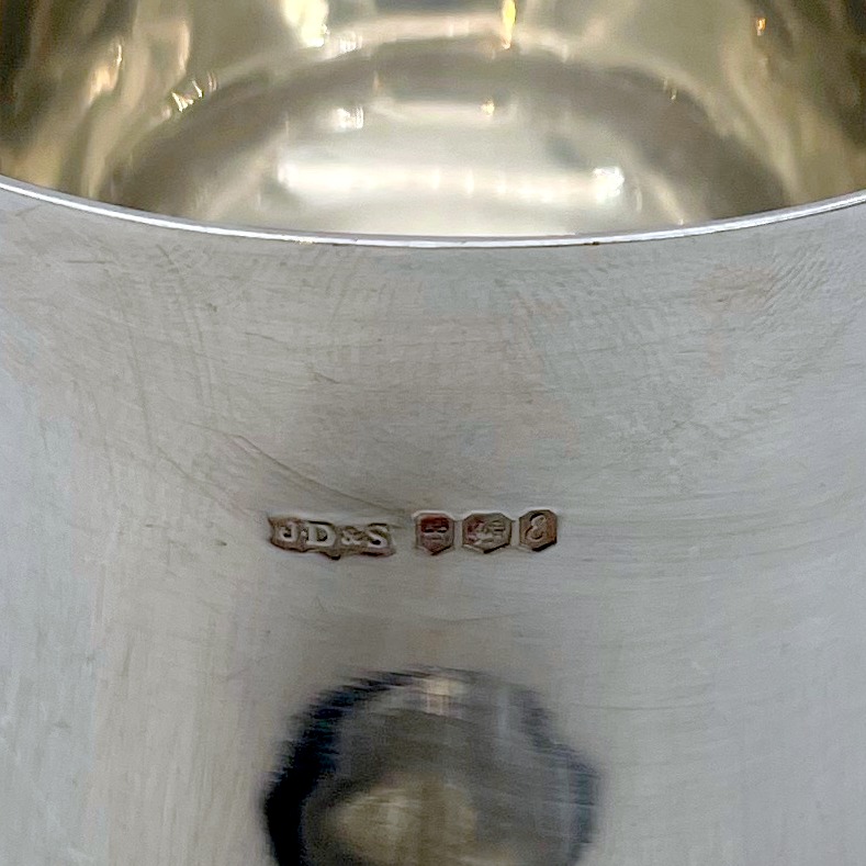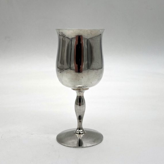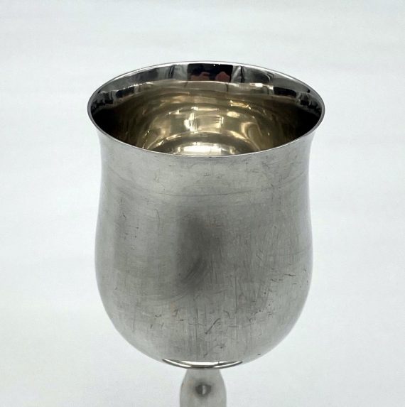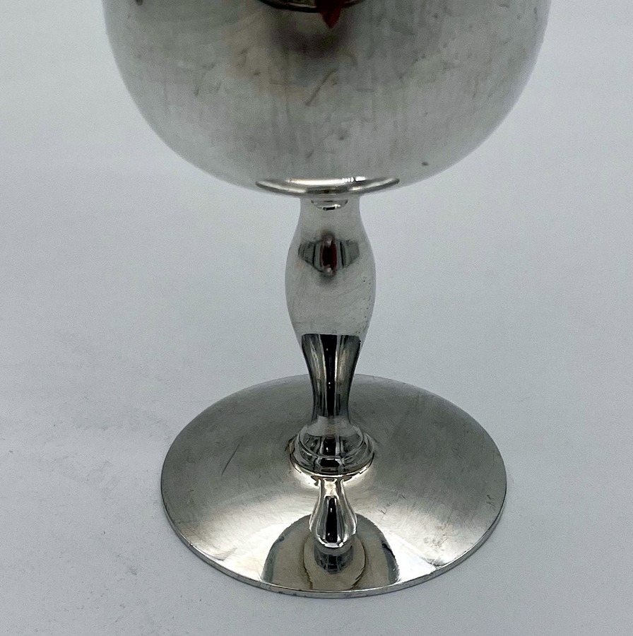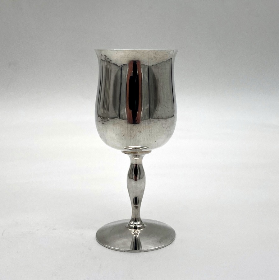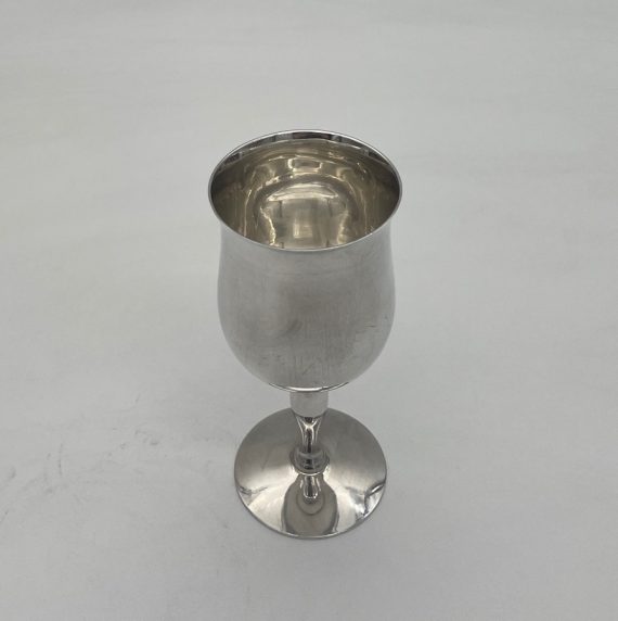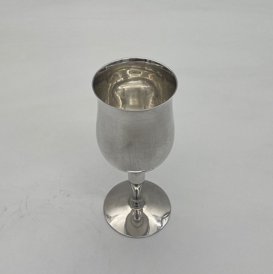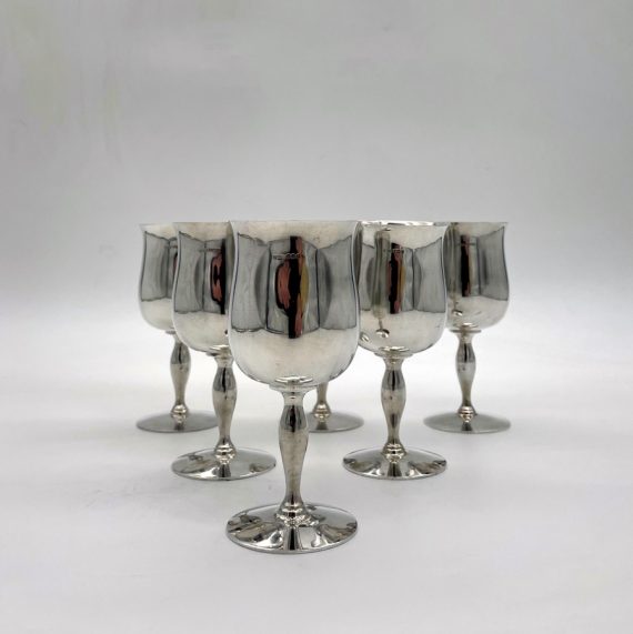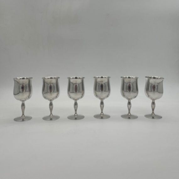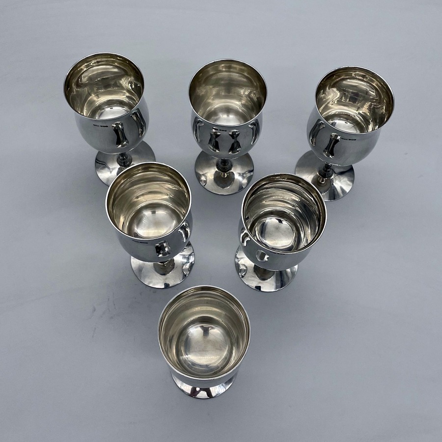 Stunning set of six plain formed sterling silver wine goblets designed with wonderful shaped tulip style bowls and raised circular pedestal feet.