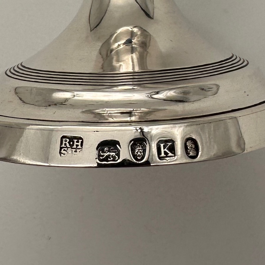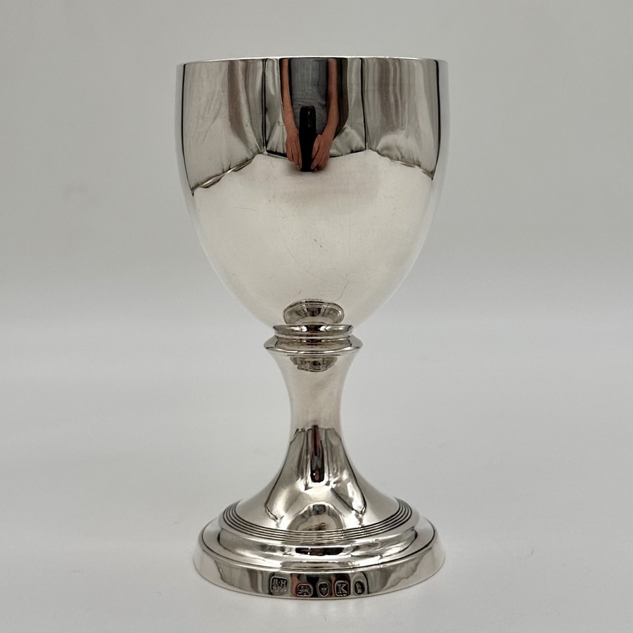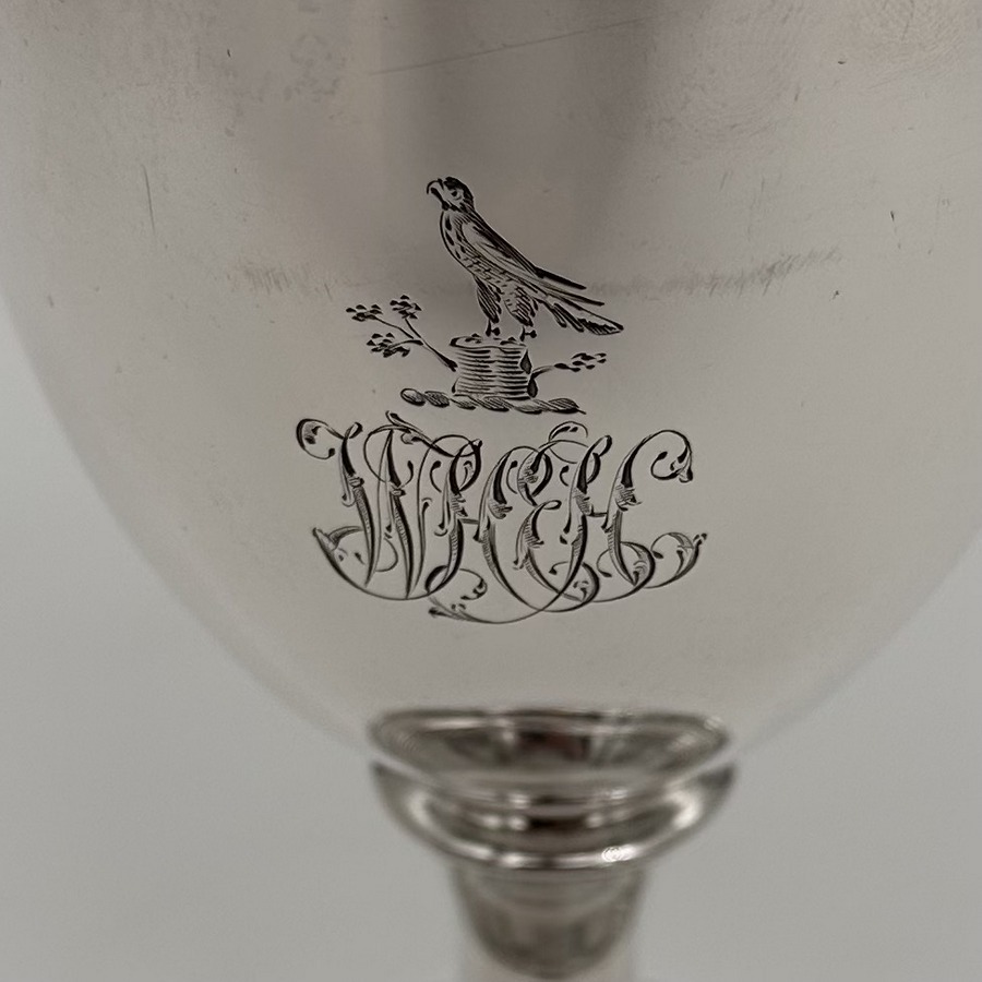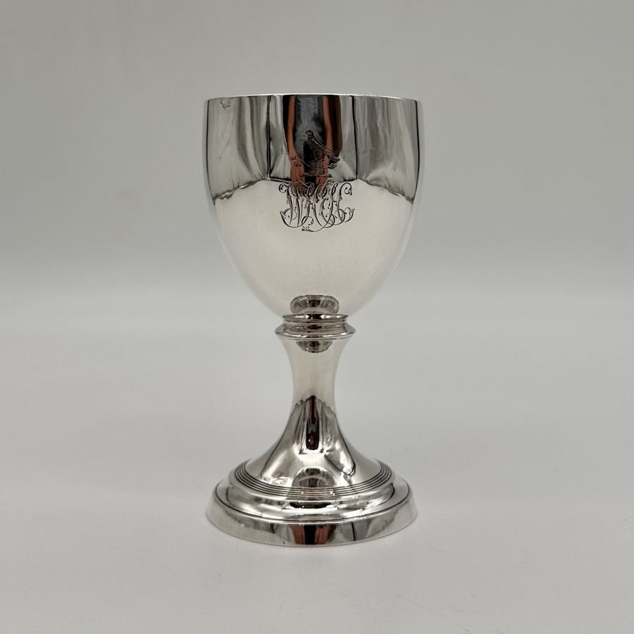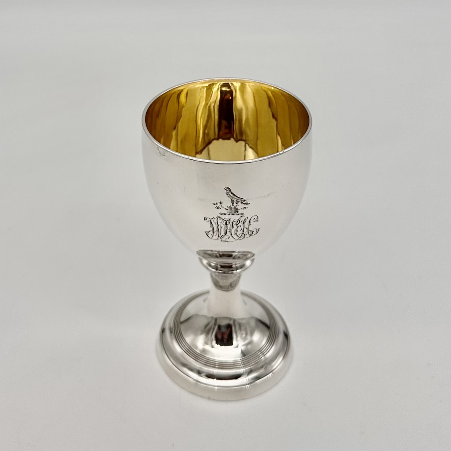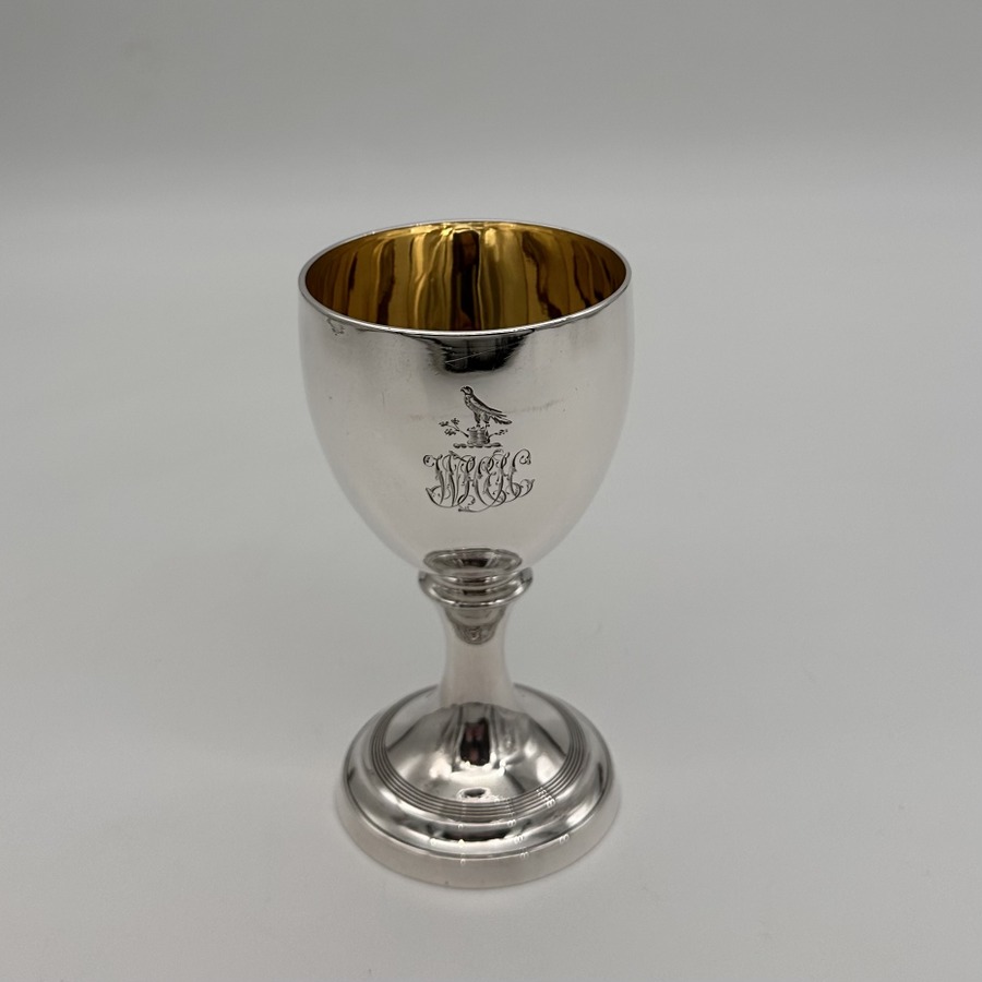 Beautiful Georgian silver wine goblet decorated with a superb hand engraved contemporary crest underwhich sits stylish entwined initials for eye catching visual importance. The foot has an elegant band of reeding for lowlights and the interior of the bowl has been gilt.