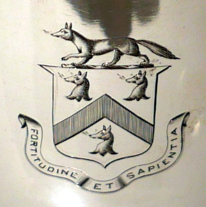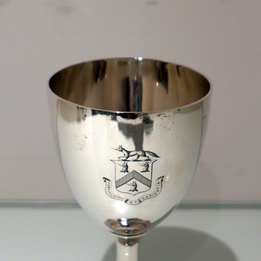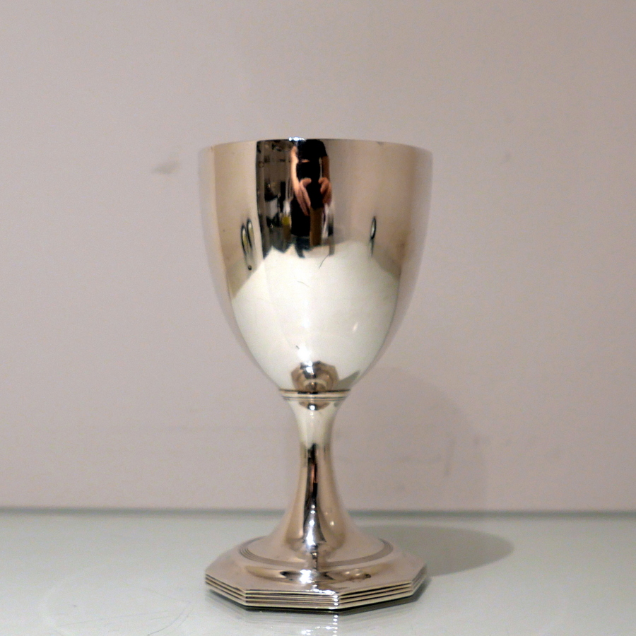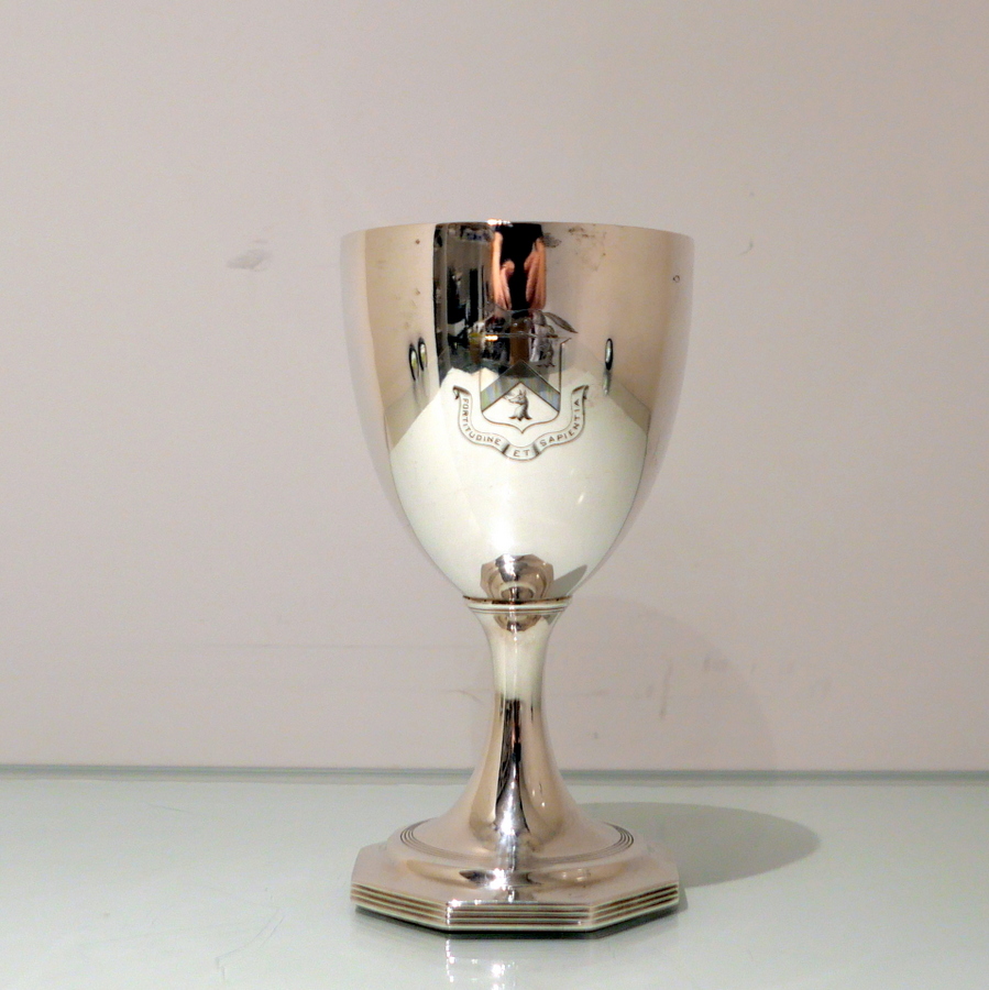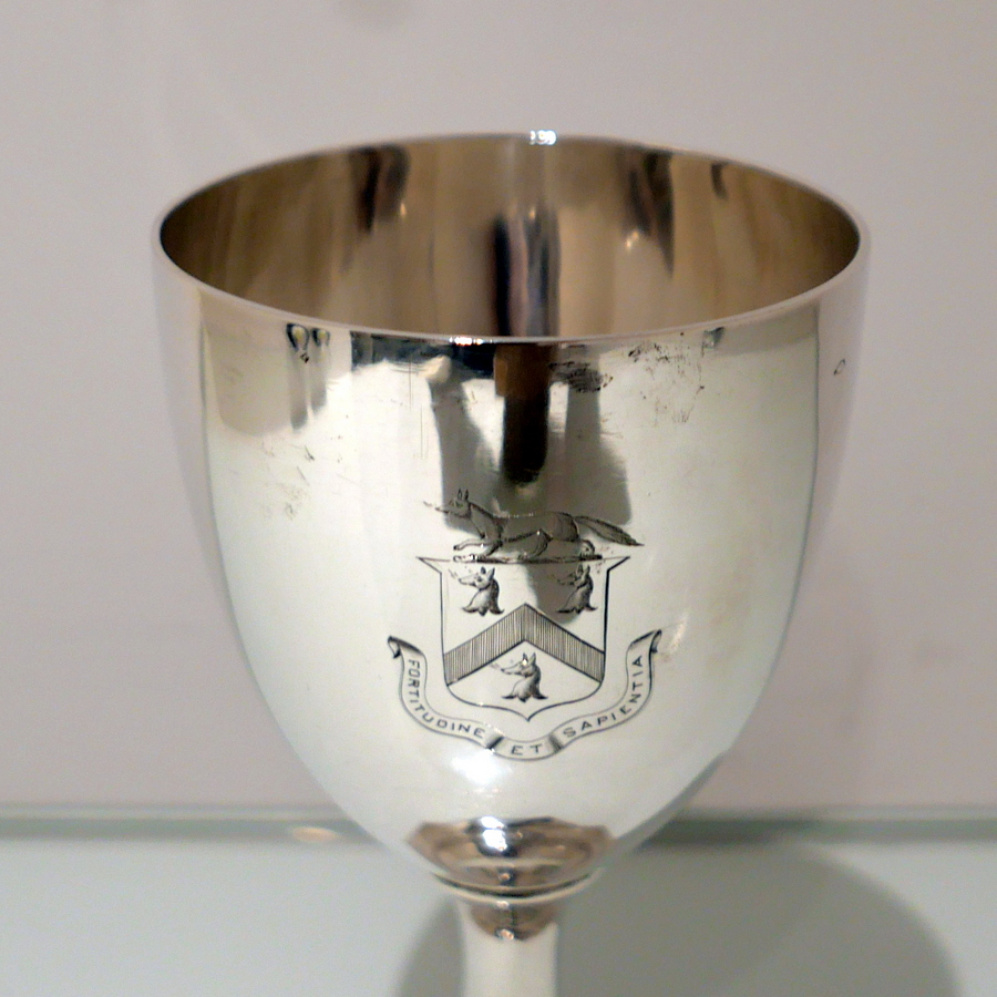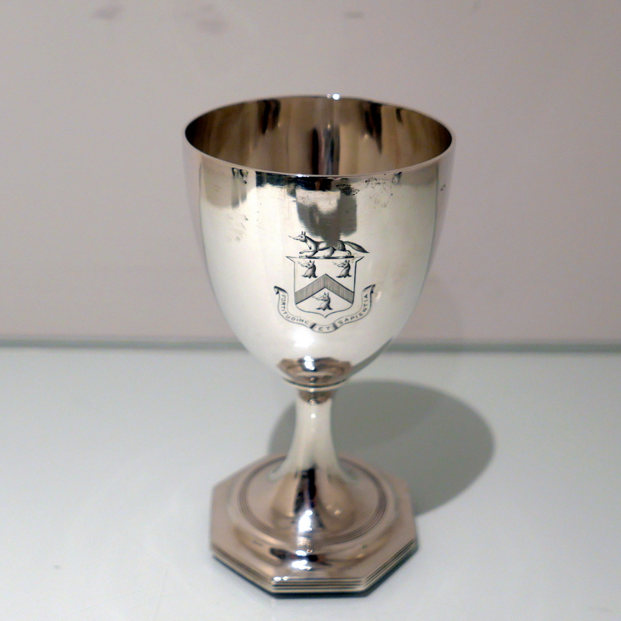A beautiful sterling silver plain formed Georgian wine goblet designed with a stylish hand engraved contemporary armorial which is the decorative focus point of the bowl. Â The raised octagonal pedestal foot has reed decoration for lowlights.