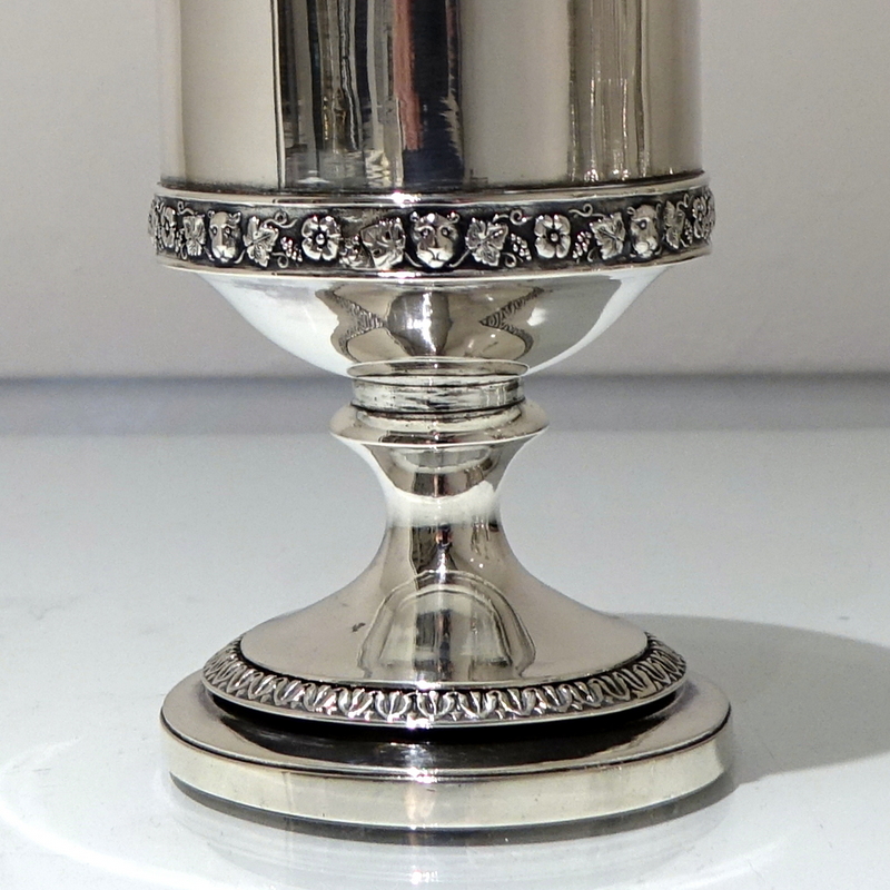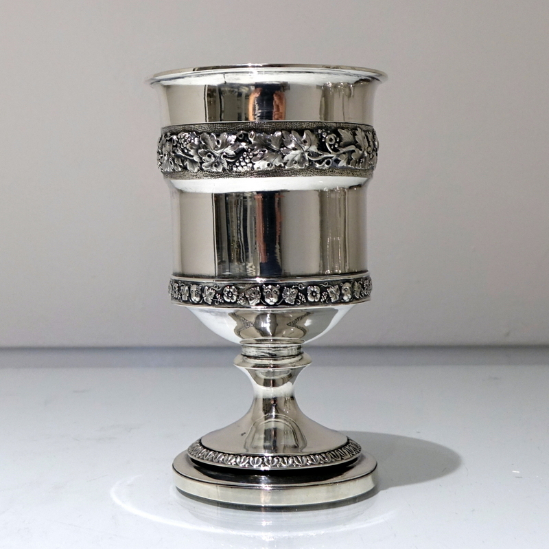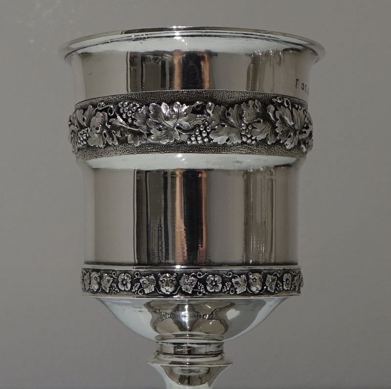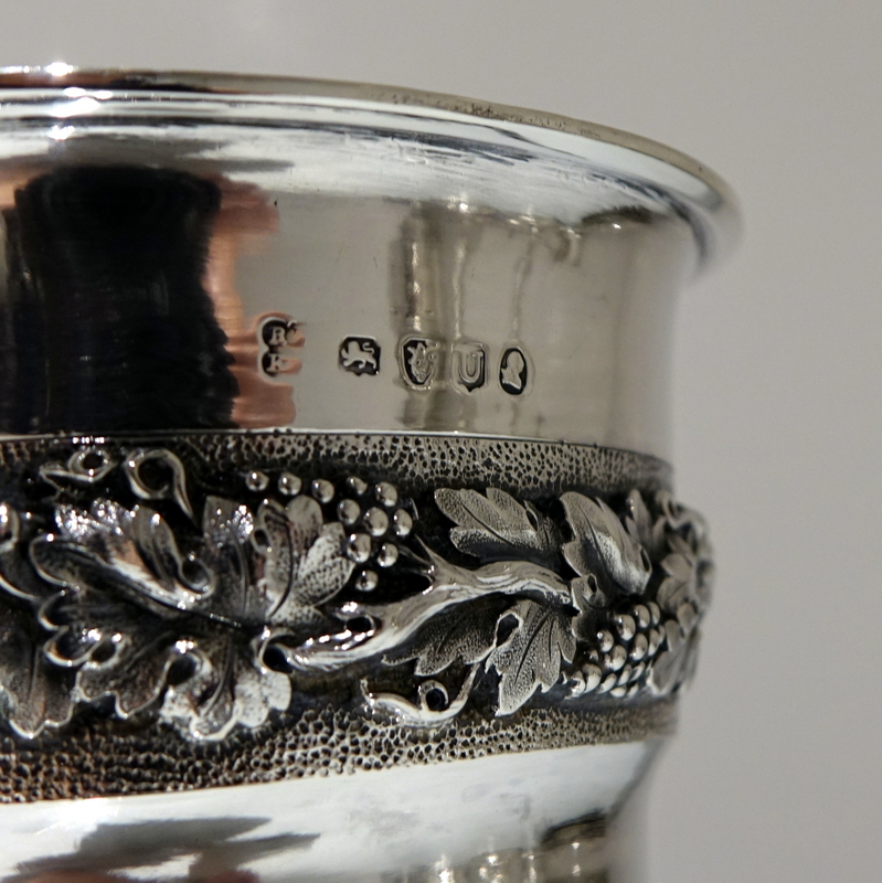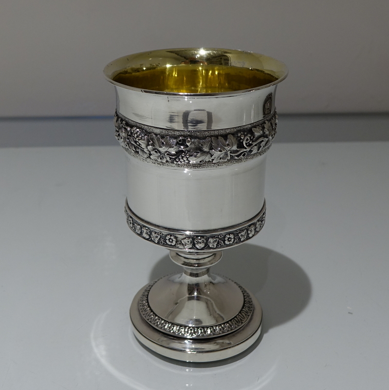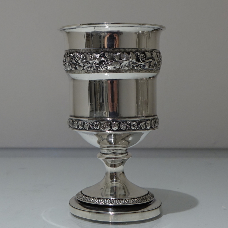 A splendid quality Georgian wine goblet decorated with two bands of applied grape and vine motifs to bowl which are set on a matt background for contrast. Â The raised pedestal foot has an additional band of decoration for lowlights.