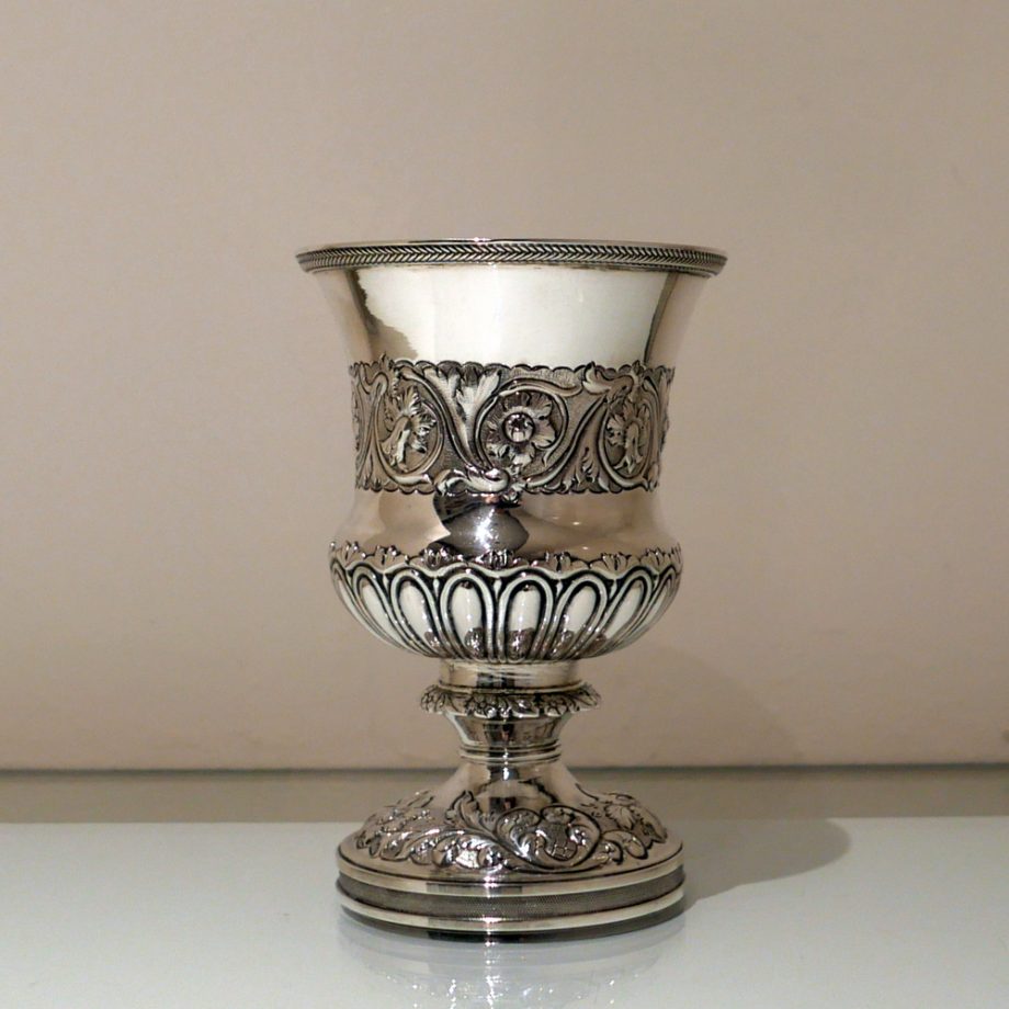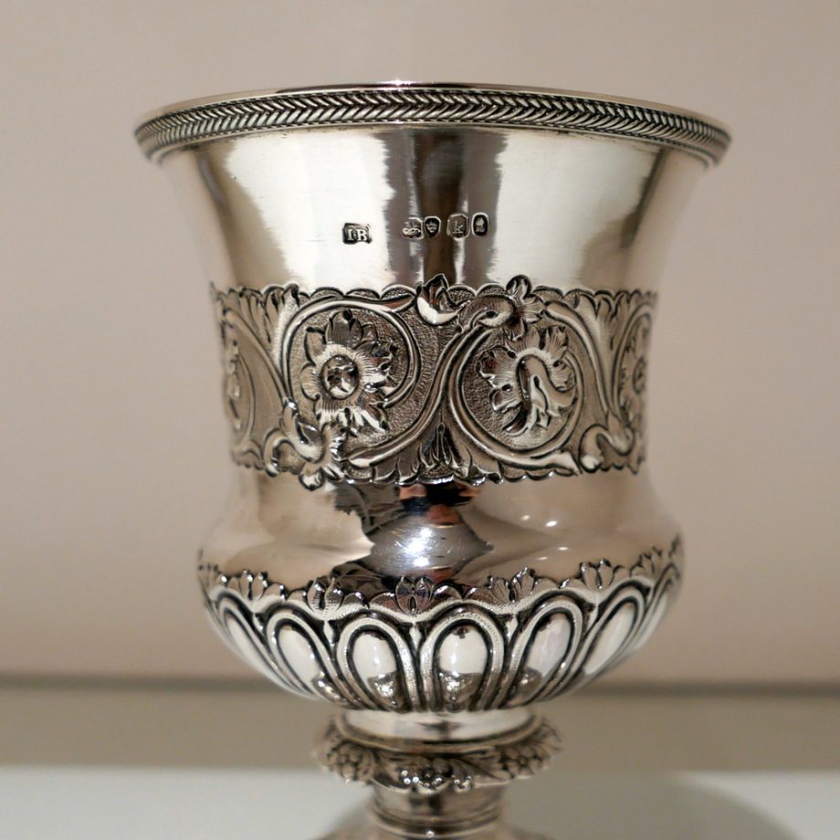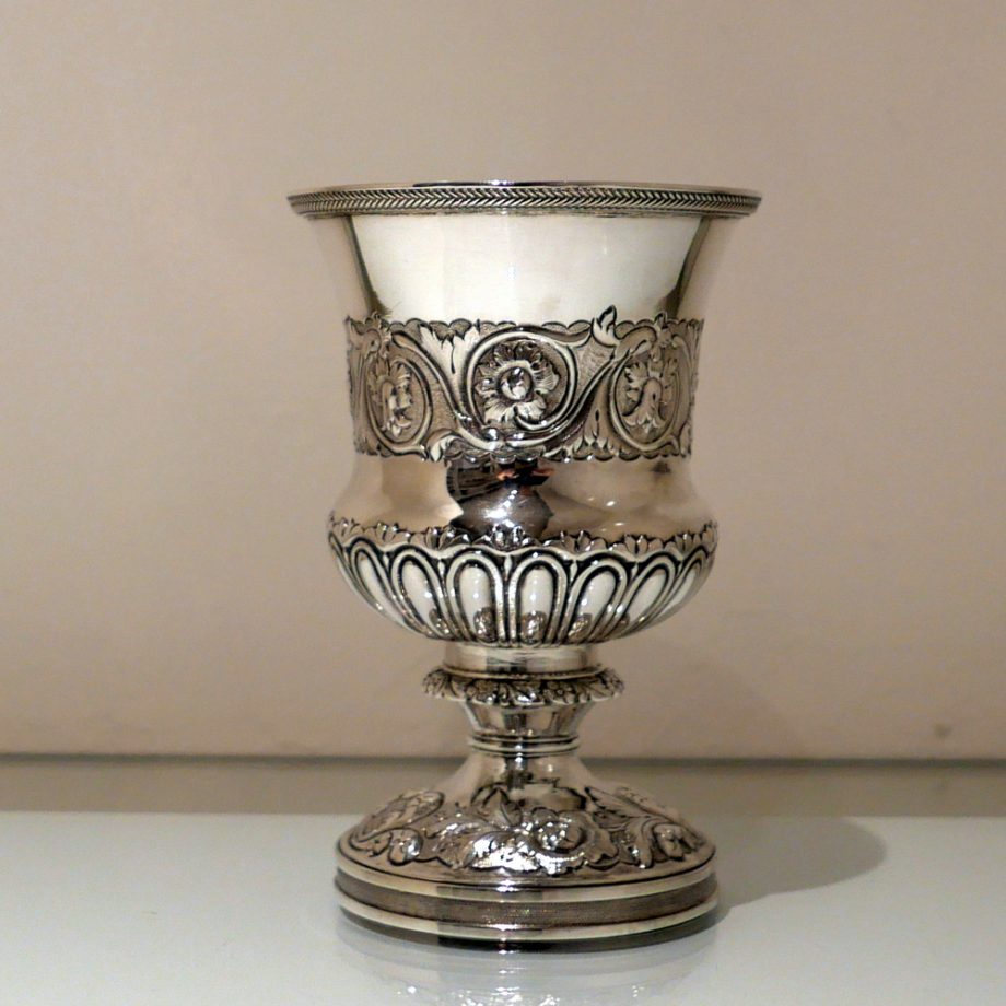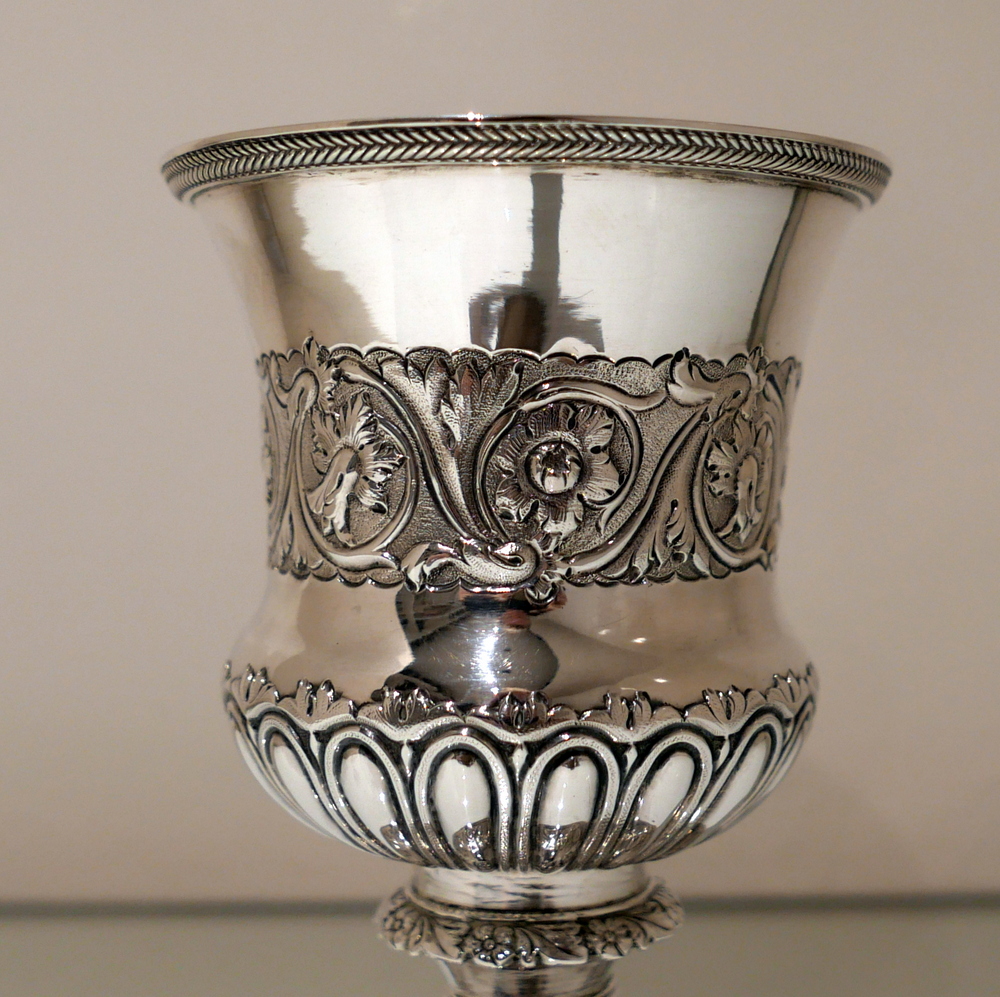 A beautiful early 19th century “campana” shaped silver goblet sitting on a circular raised pedestal foot. Â The middle section of the bowl has an elegant band of floral embossing sitting on a matt background for decorative contrast. Â The lower section has stylish fluting and the inside of the bowl is gilt.