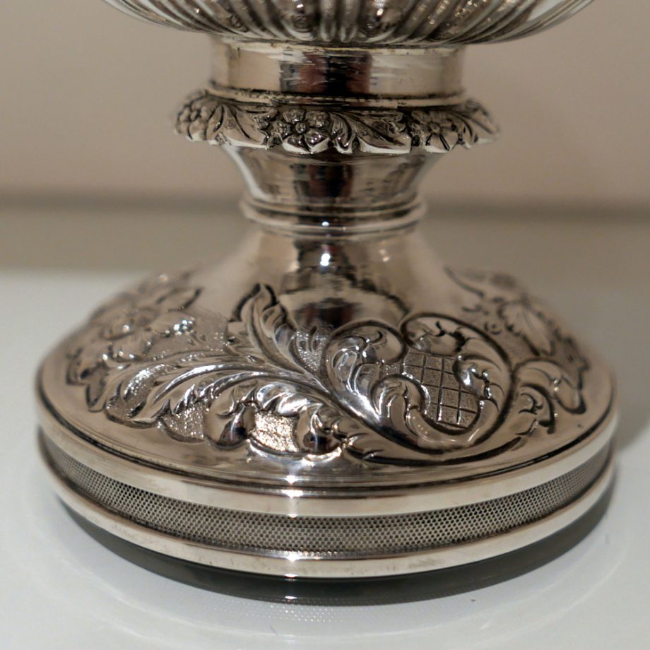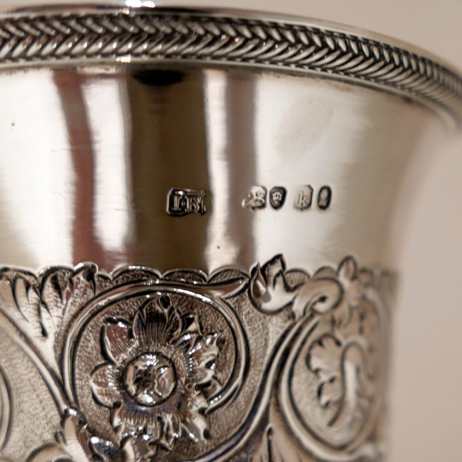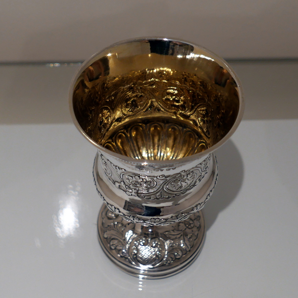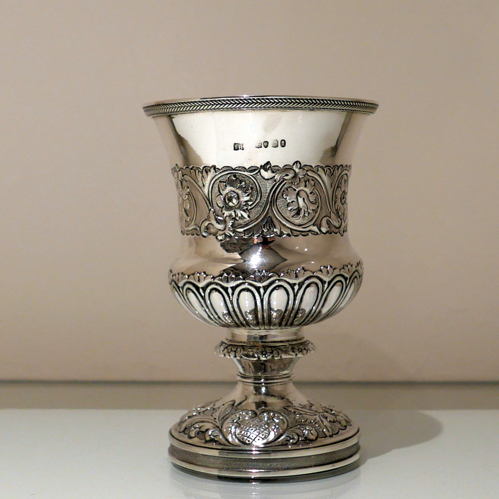 A beautiful early 19th century “campana” shaped silver goblet sitting on a circular raised pedestal foot. Â The middle section of the bowl has an elegant band of floral embossing sitting on a matt background for decorative contrast. Â The lower section has stylish fluting and the inside of the bowl is gilt.