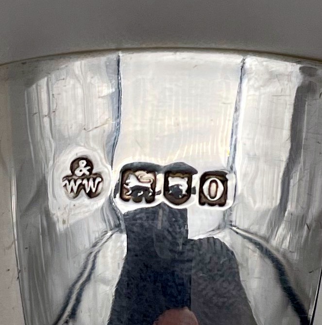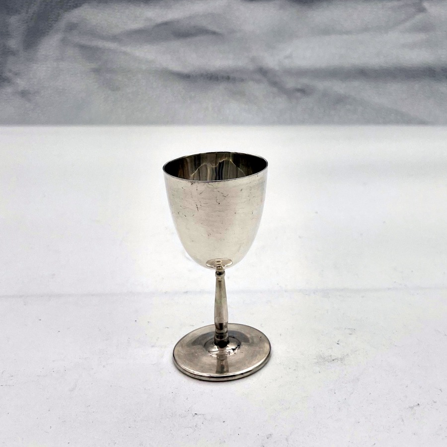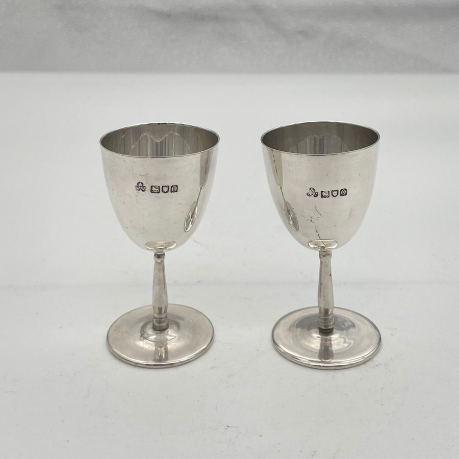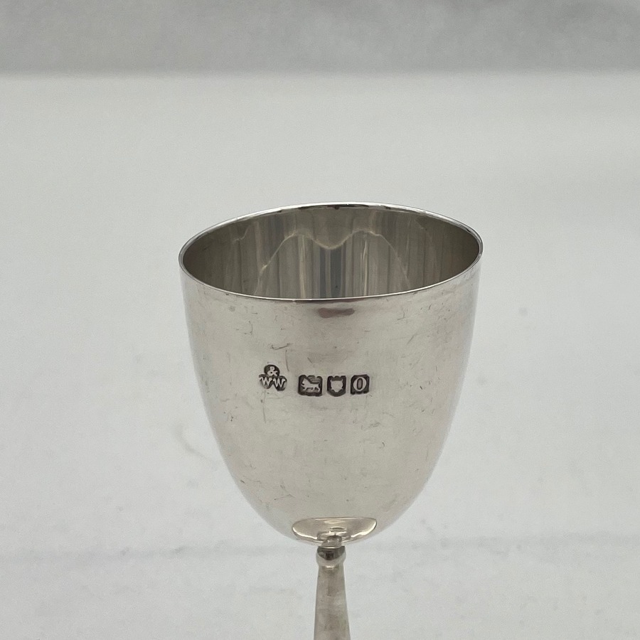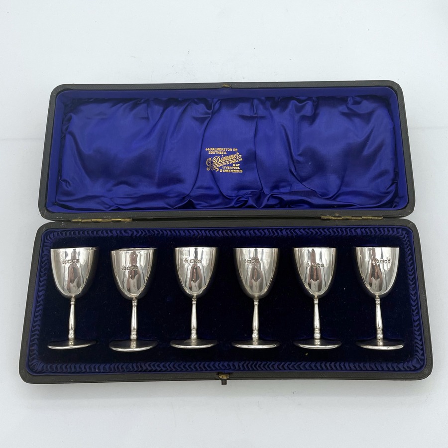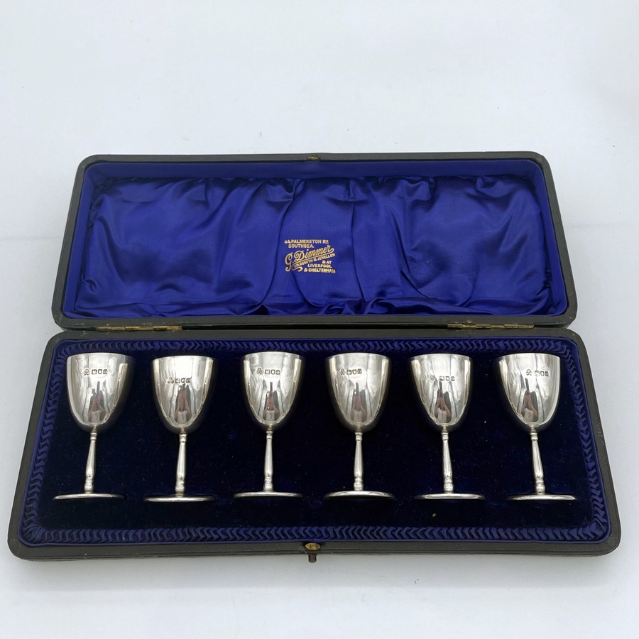 A very stylish set of six sterling silver liquor cups modelled on miniature versions of traditional wine goblets complete with elegant tapering bowls and circular raised pedestal feet which have been displayed in a fabulous blue lined presentation case.