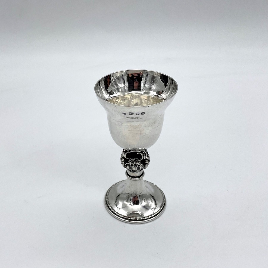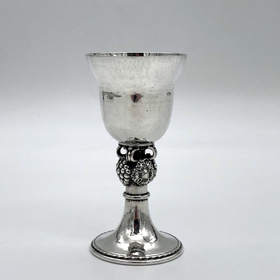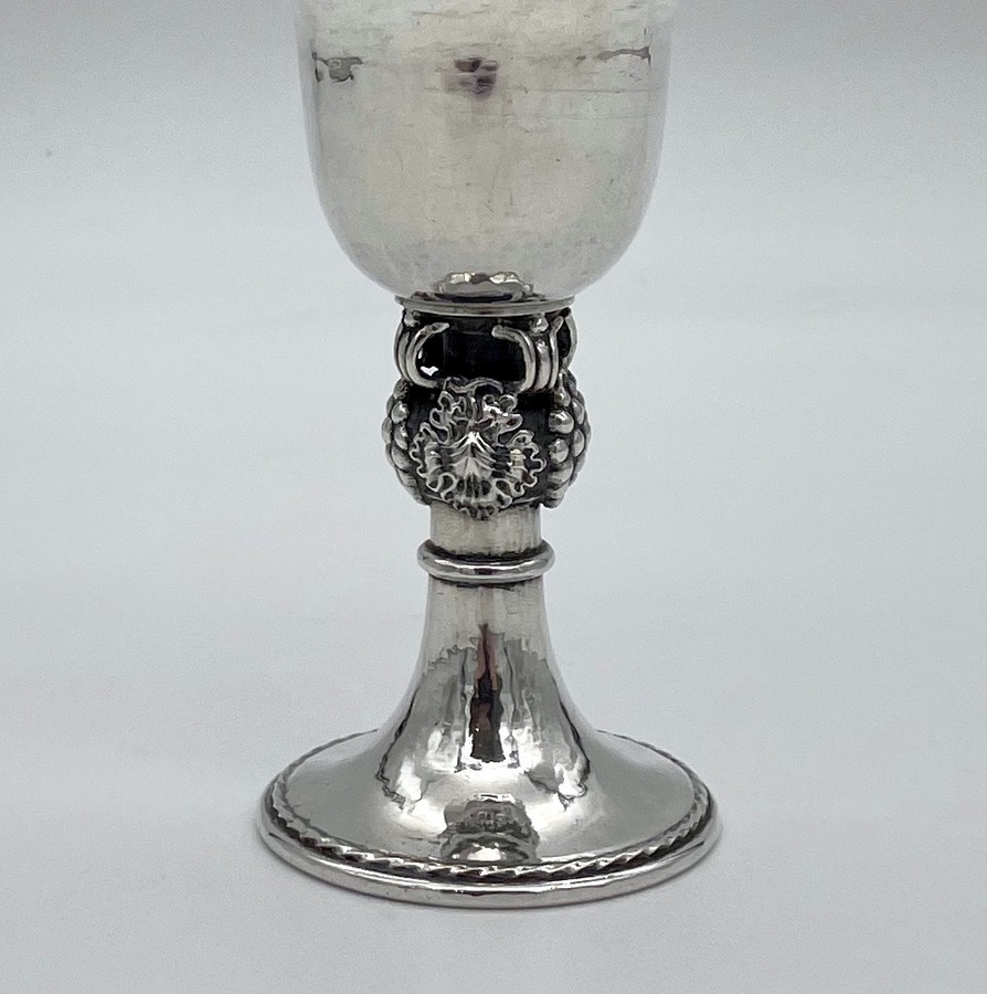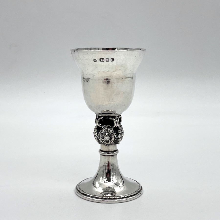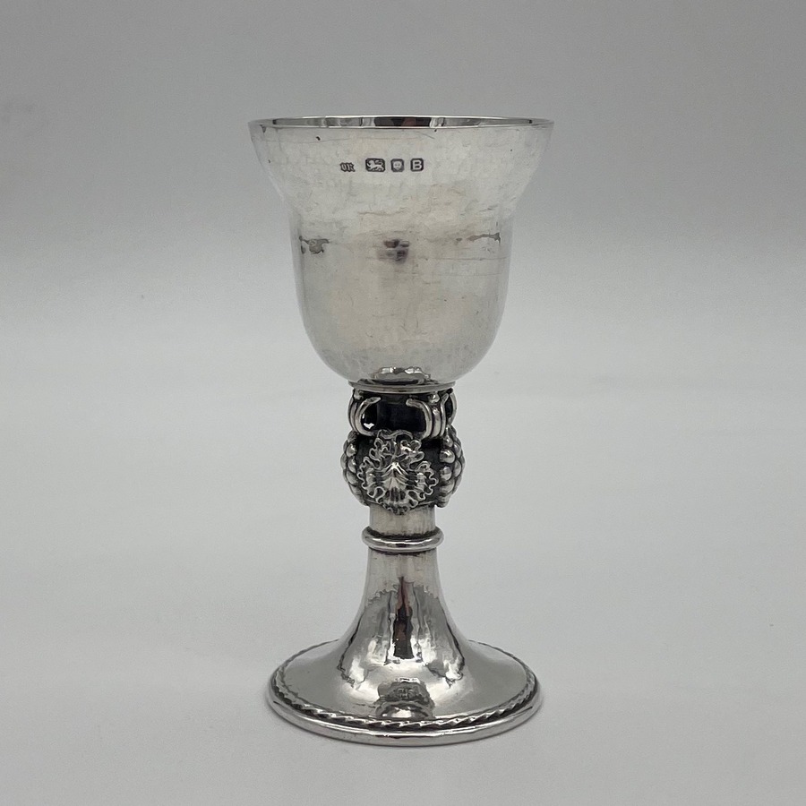 Fine and incredibly stylish Omar Ramsden sterling silver wine goblet designed with a beautiful hammered curvaceous tapering bowl and a wonderful cast decorative grape and vine leaf stem.