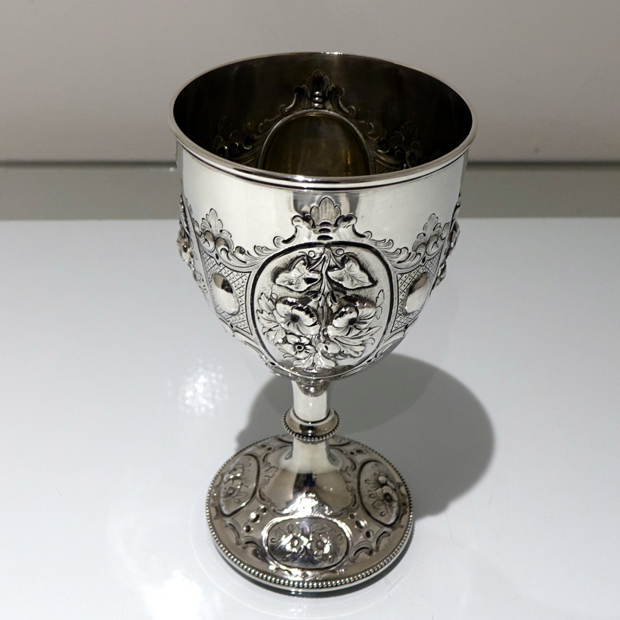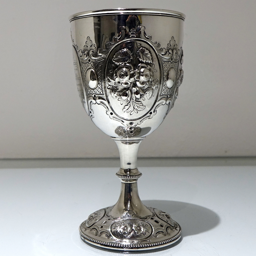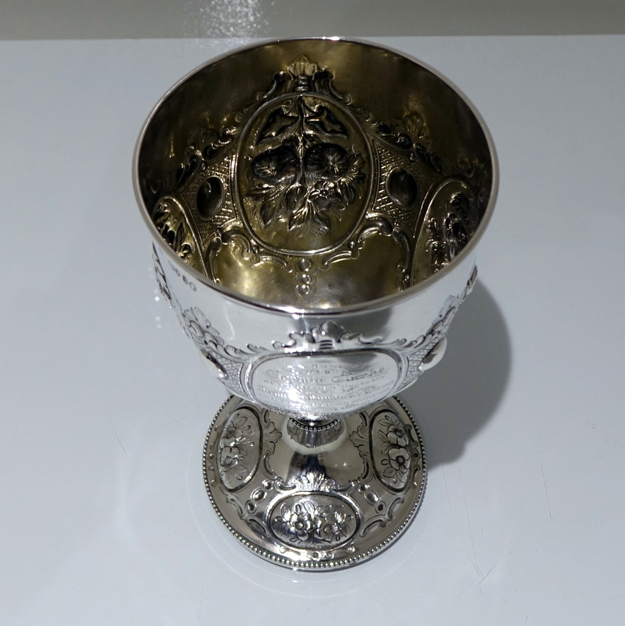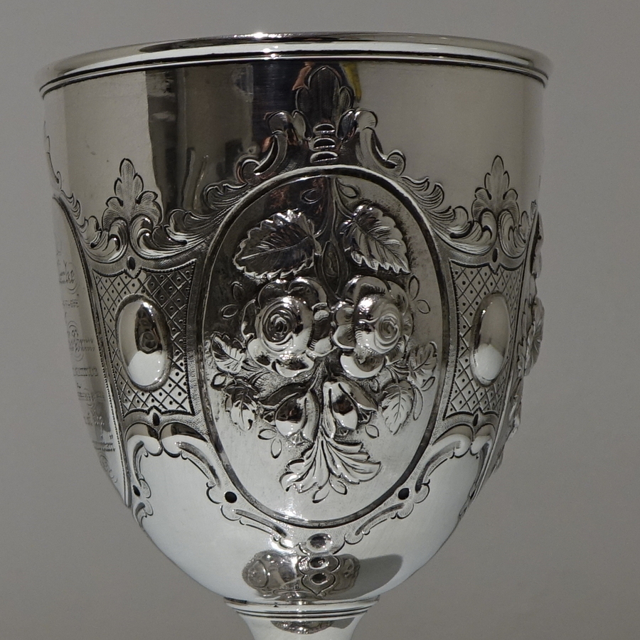 A stunningly beautiful large silver goblet decorated with ornate floral embossing which has been oval “framed” for decorative design. Â The stem and foot have applied bead decoration for lowlights. Â The centre front has a cartouche in which sits a contemporary inscription.