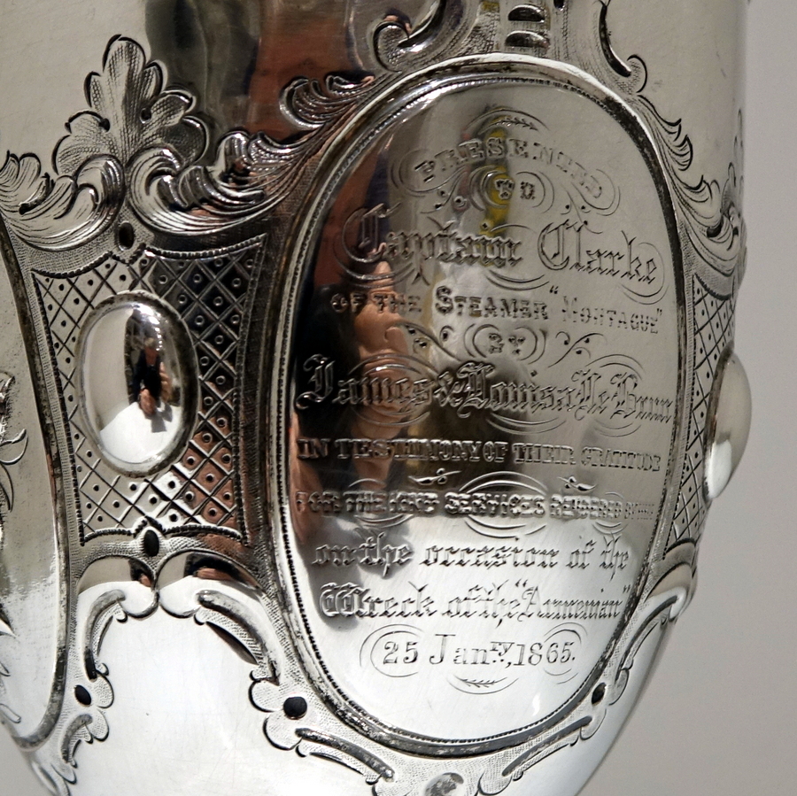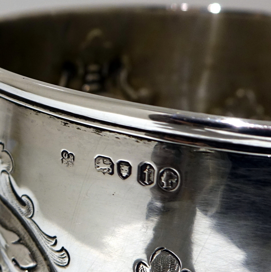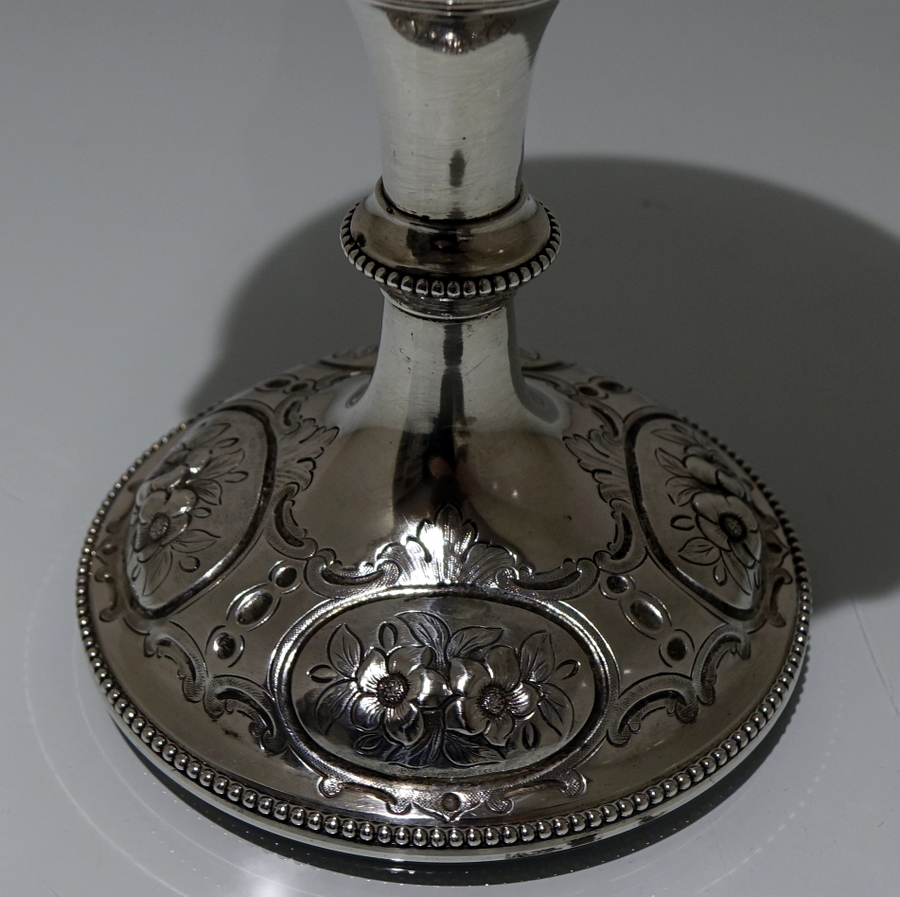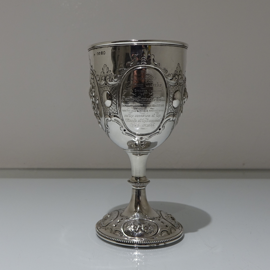 A stunningly beautiful large silver goblet decorated with ornate floral embossing which has been oval “framed” for decorative design. Â The stem and foot have applied bead decoration for lowlights. Â The centre front has a cartouche in which sits a contemporary inscription.