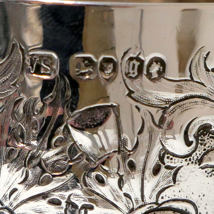 An elegant sterling silver Victorian wine goblet designed with a central double cartouche and elegant floral embossing. Â The foot has additional floral embossing and an outer bead wire for lowlights.