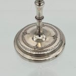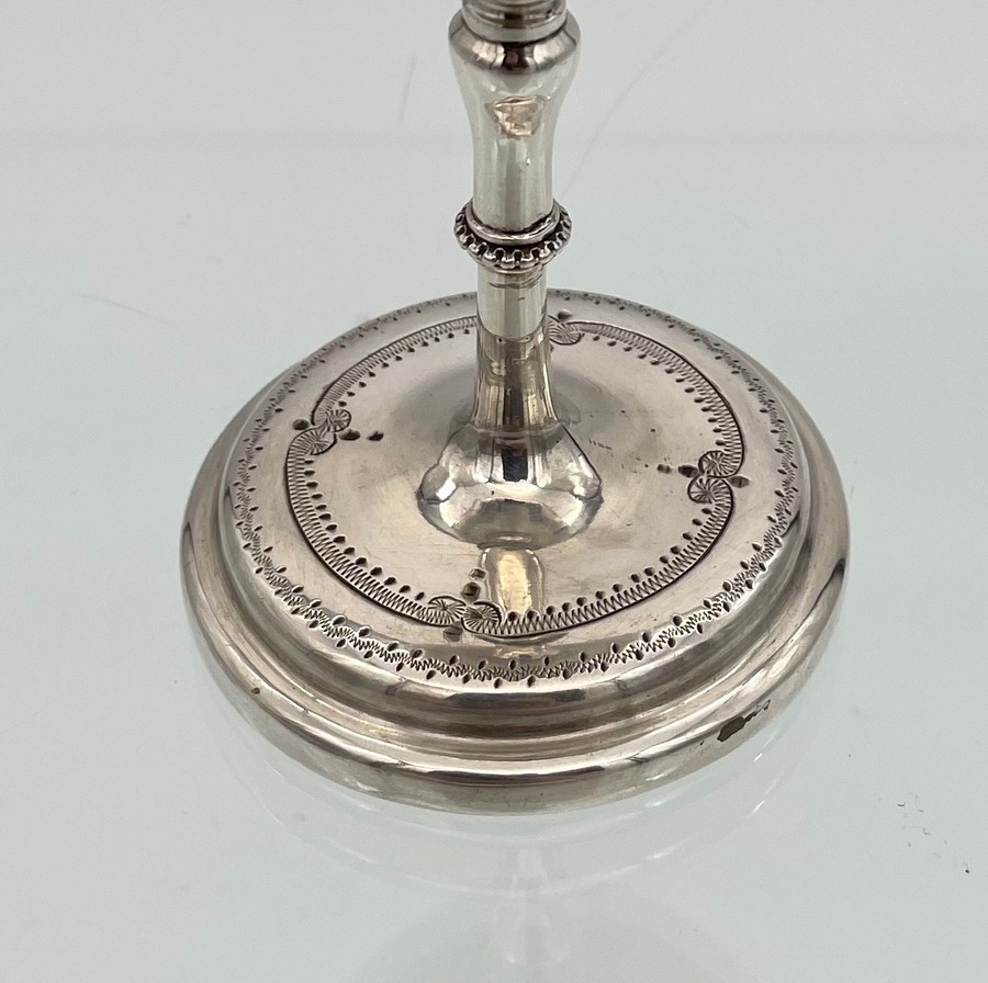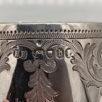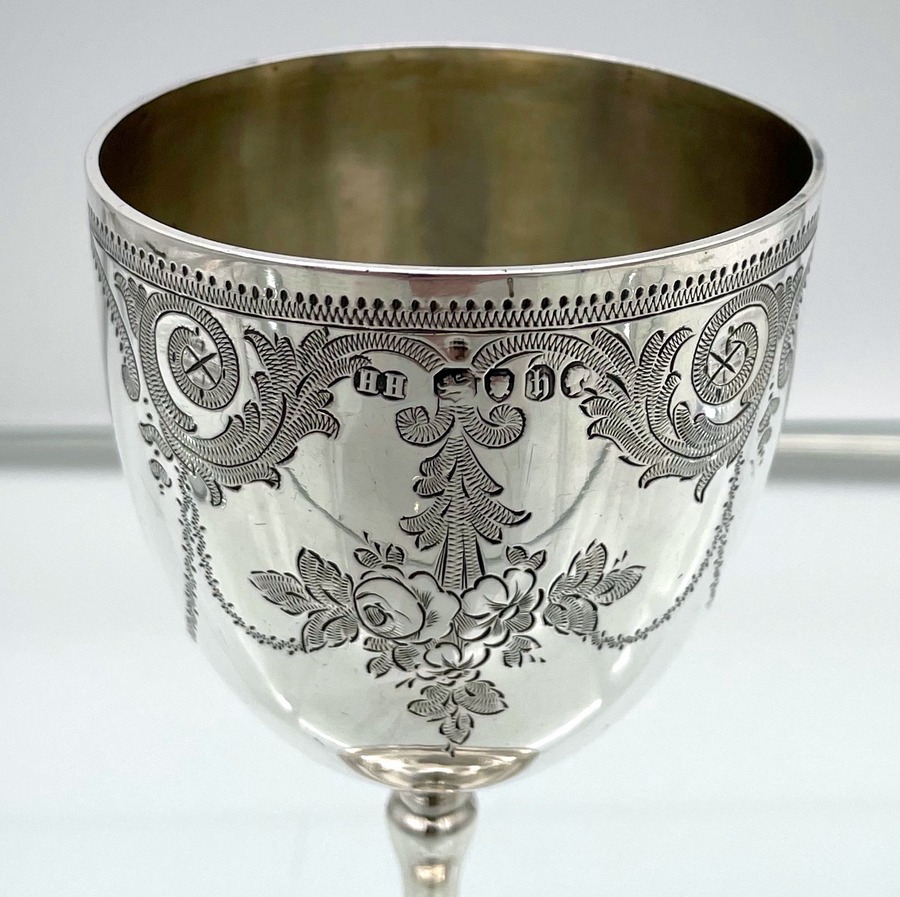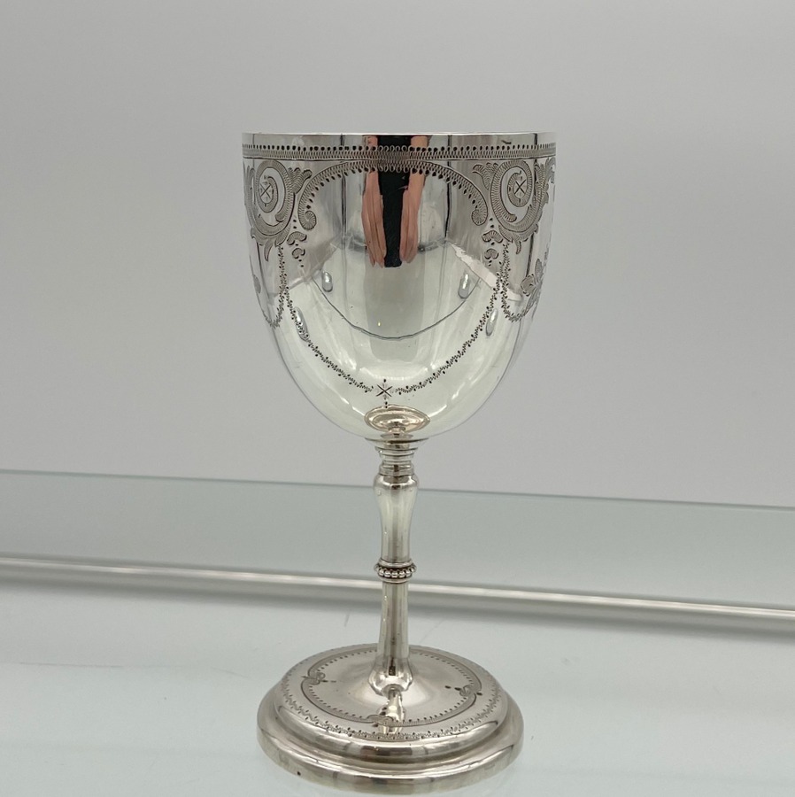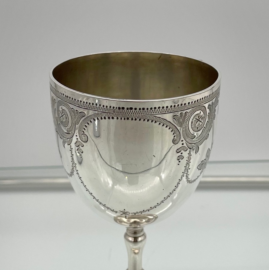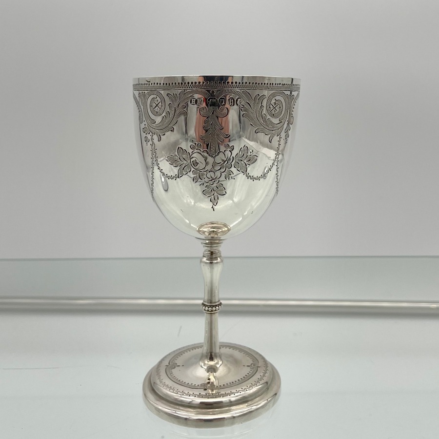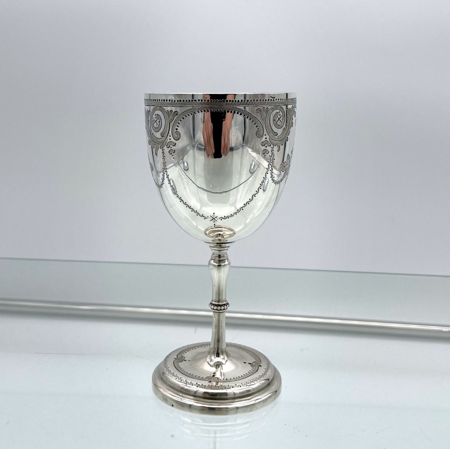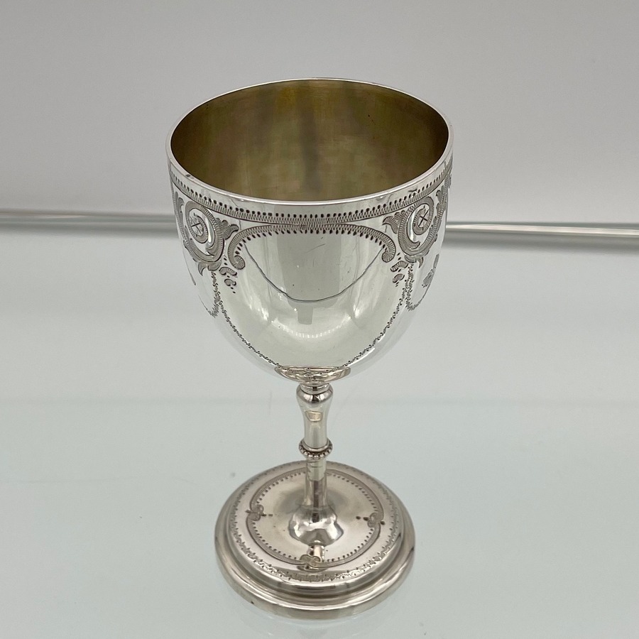 A beautiful mid 19th century sterling silver wine goblet elegantly bright cut engraved with floral swirls and hanging garlands. Â The bowl sits on a raised pedestal foot and has additional bright cut engraving for lowlights.