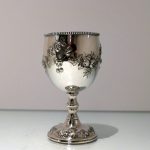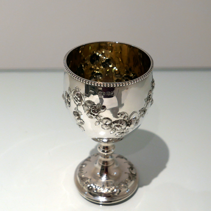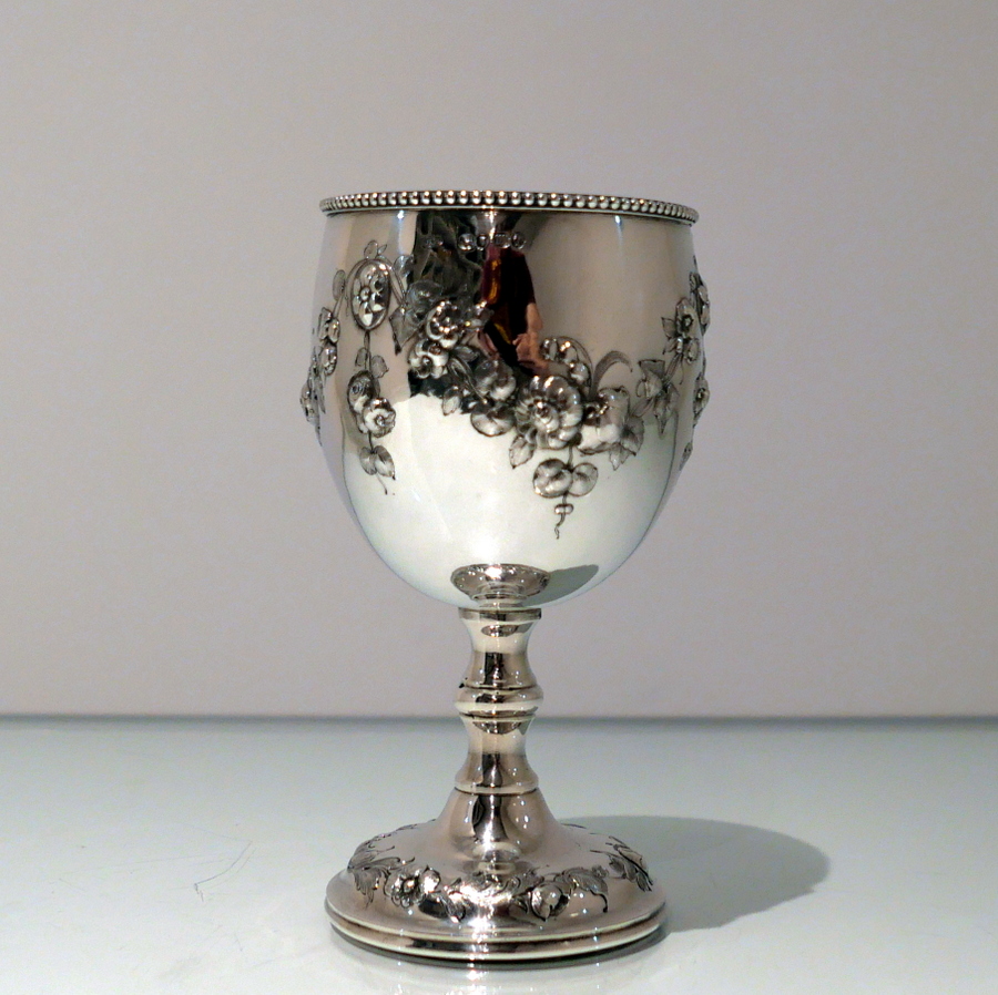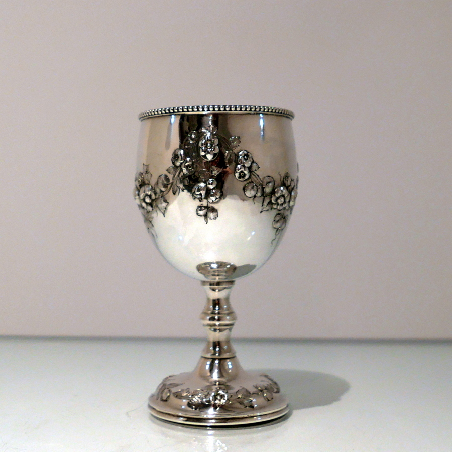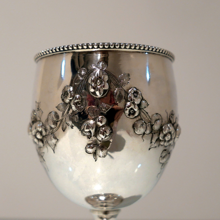 A fine quality Victorian silver wine goblet made by the highly renowned silversmith Robert Harper.The bowl has a stylish upper bead wire and lower embellishments of elegant floral hanging garlands. Â The raised pedestal foot is circular and has additional outer floral embellishing for decorative lowlights.