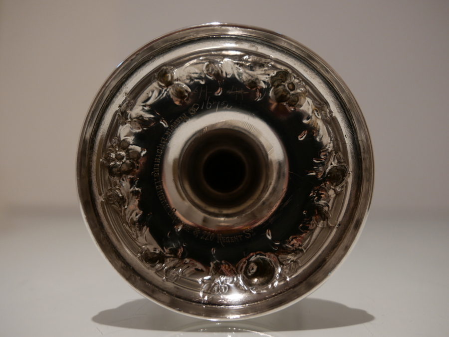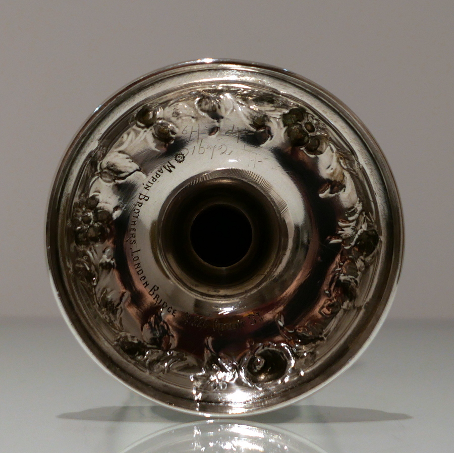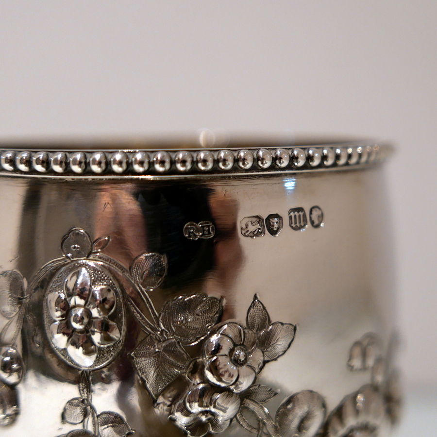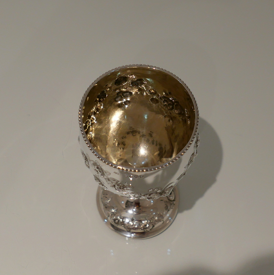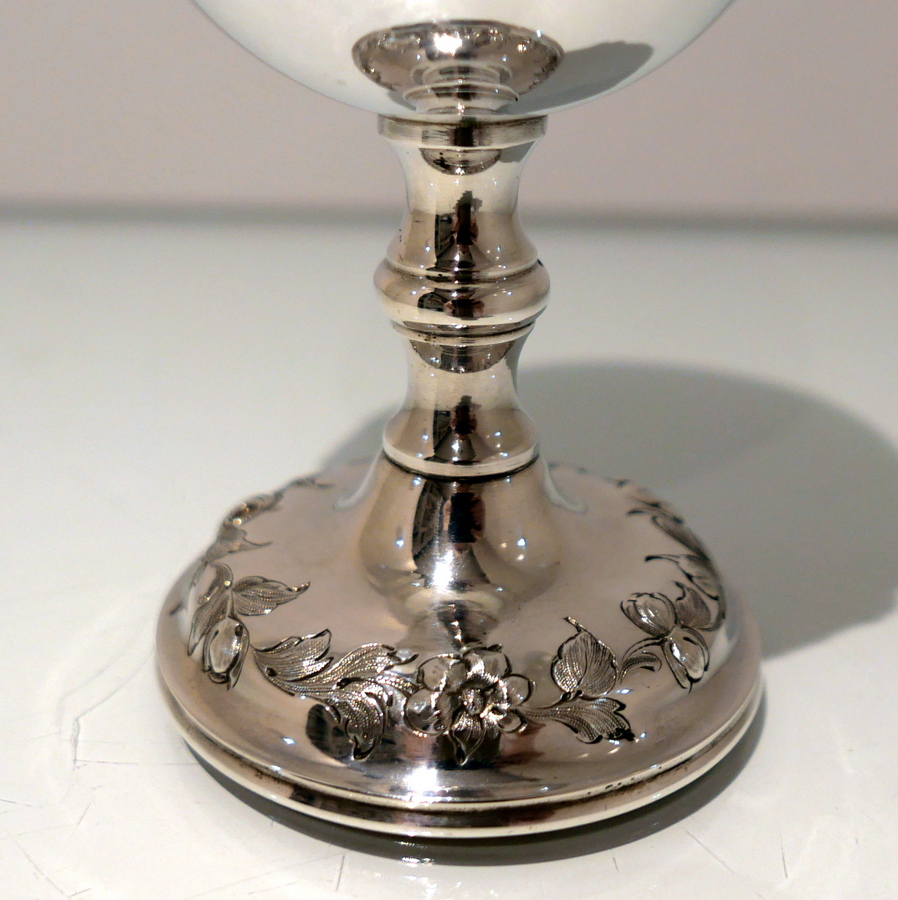 A fine quality Victorian silver wine goblet made by the highly renowned silversmith Robert Harper.The bowl has a stylish upper bead wire and lower embellishments of elegant floral hanging garlands. Â The raised pedestal foot is circular and has additional outer floral embellishing for decorative lowlights.