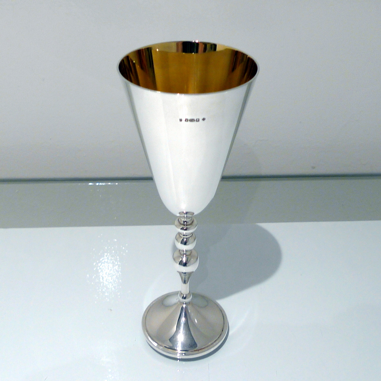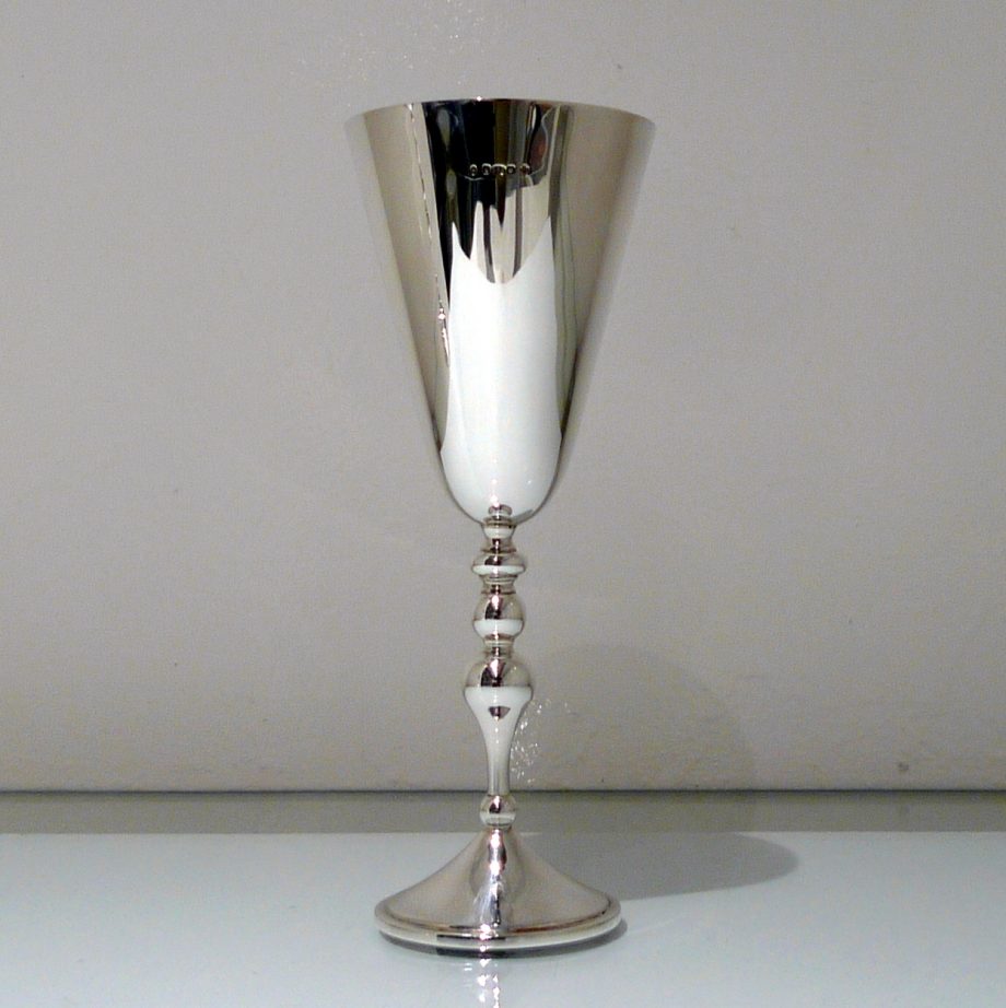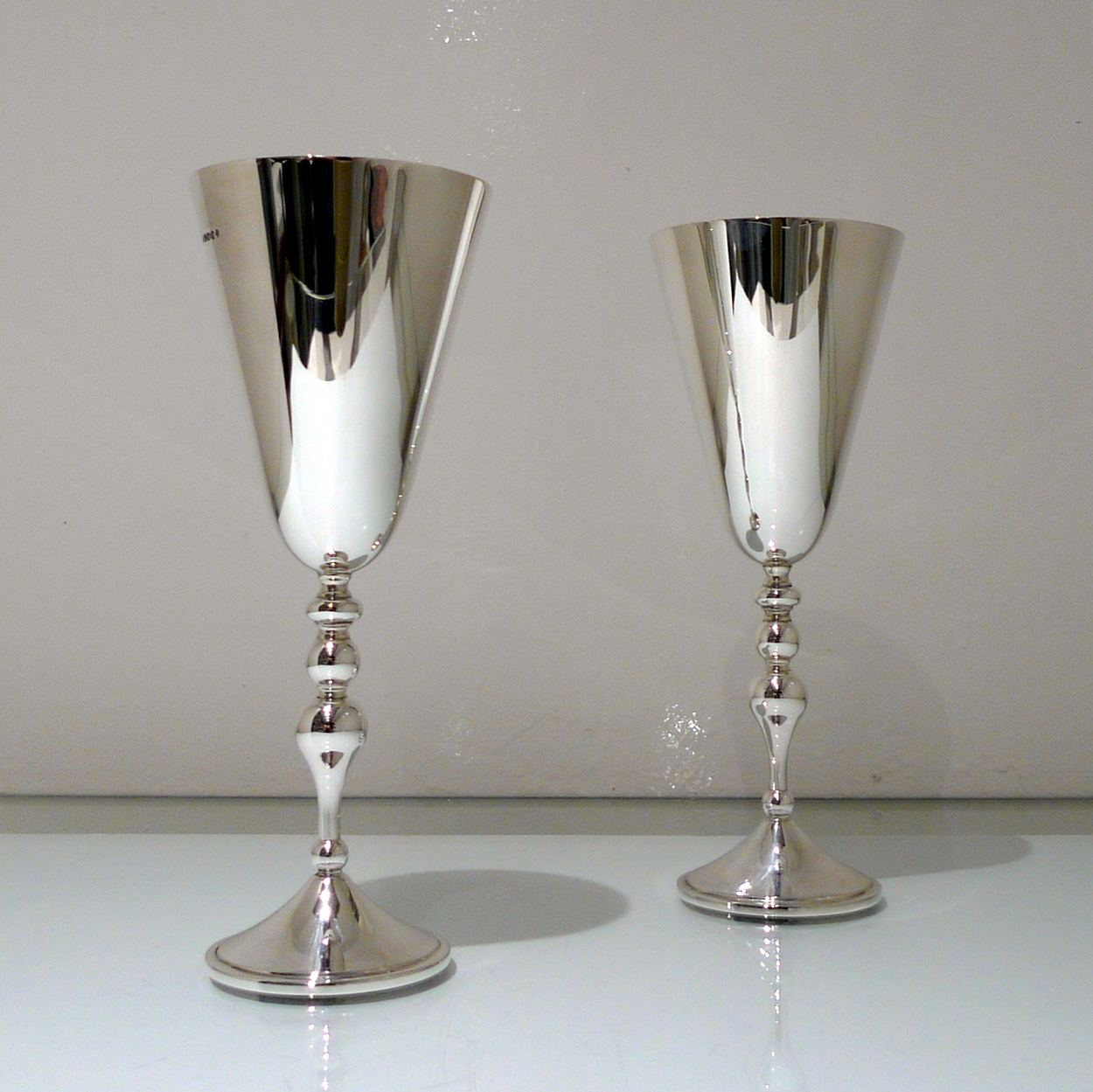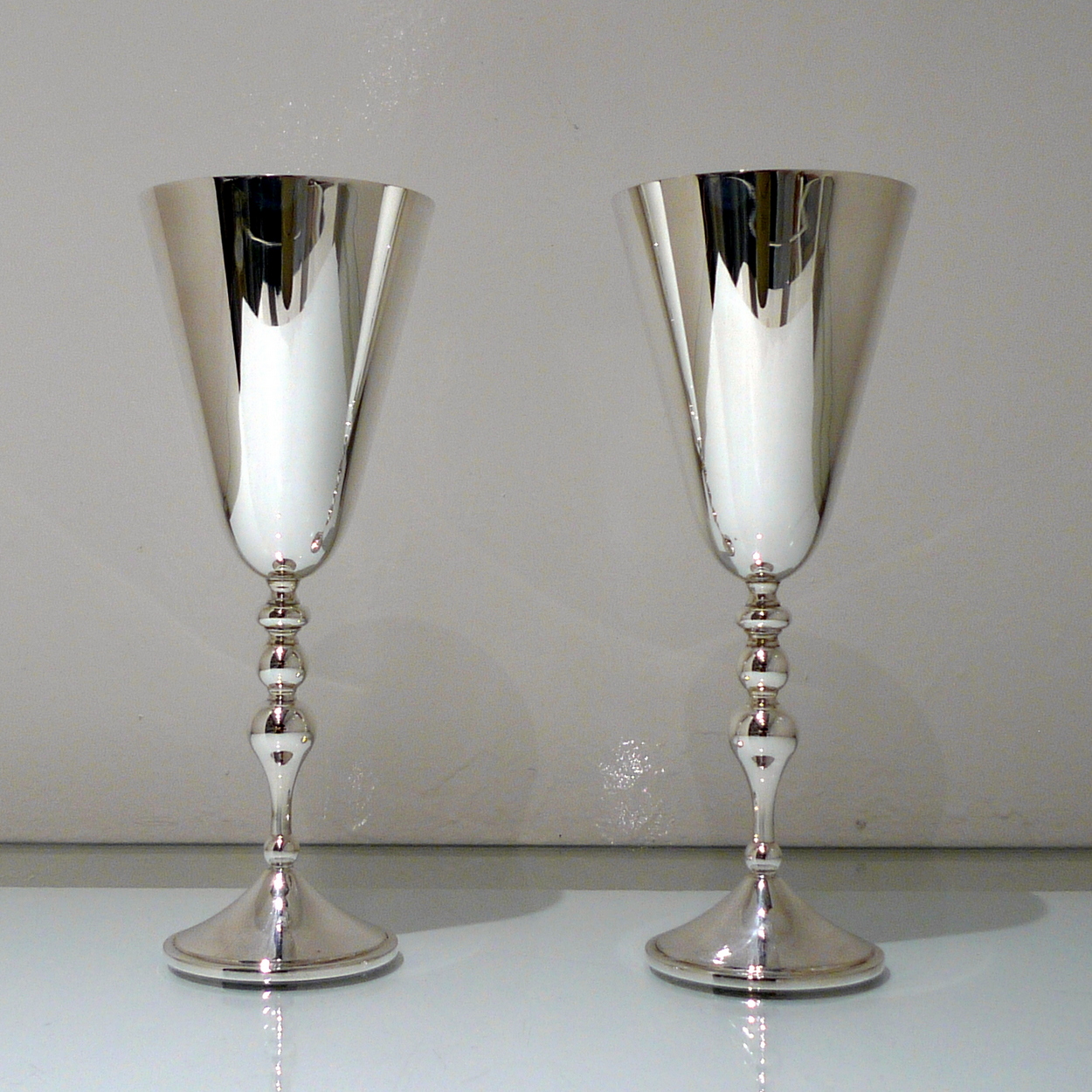 An incredibly stylish pair of highly collectable champagne flutes, superb quality in design and gauge, and decorated with gilt interior bowls for contrast and beautiful knopped stems for lowlights.