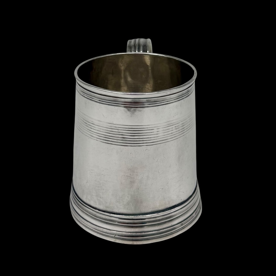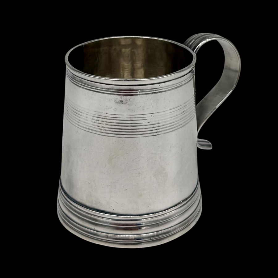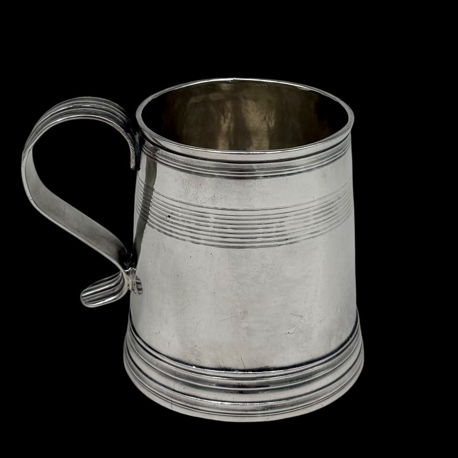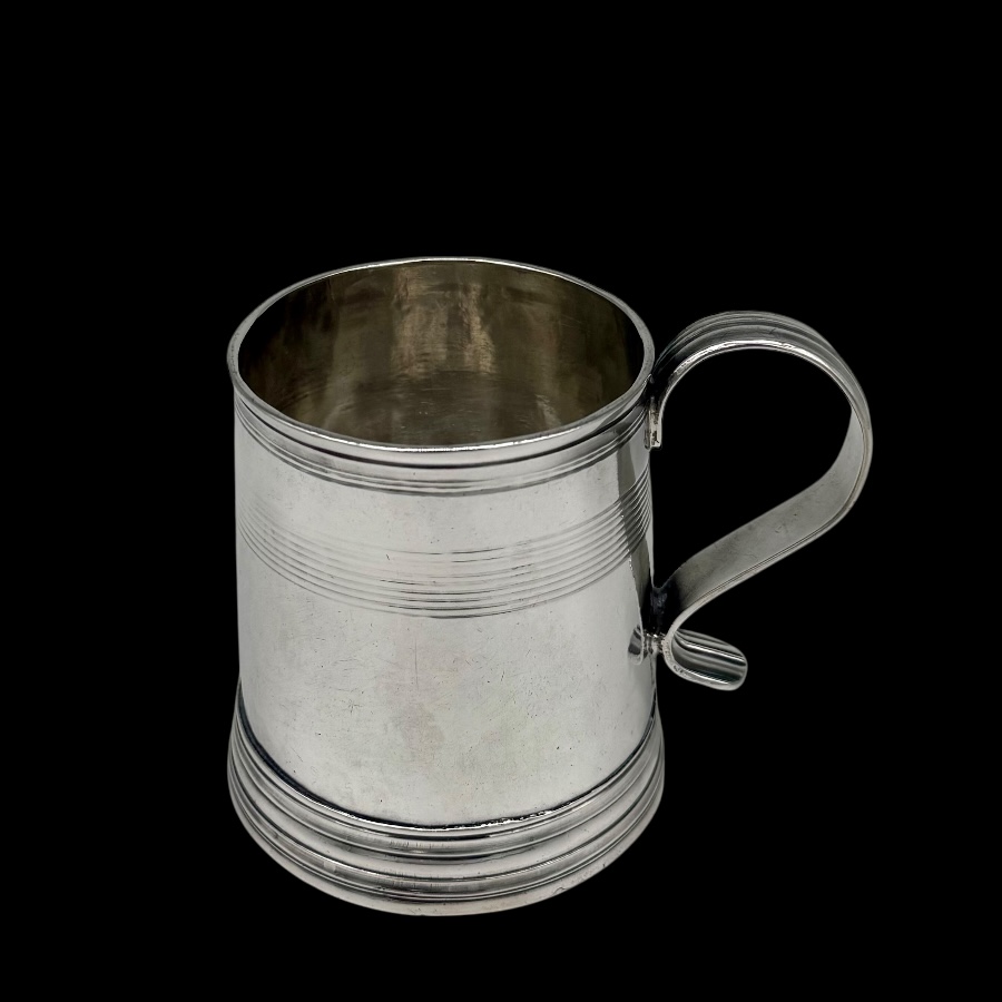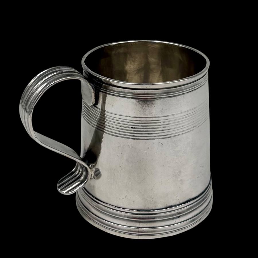 Splendid James II silver 3/4 pint mug decorated with elegant turnings and a delightfully ornate scroll handle. The mug sits on a short skirt wire foot and has a beautiful patina.