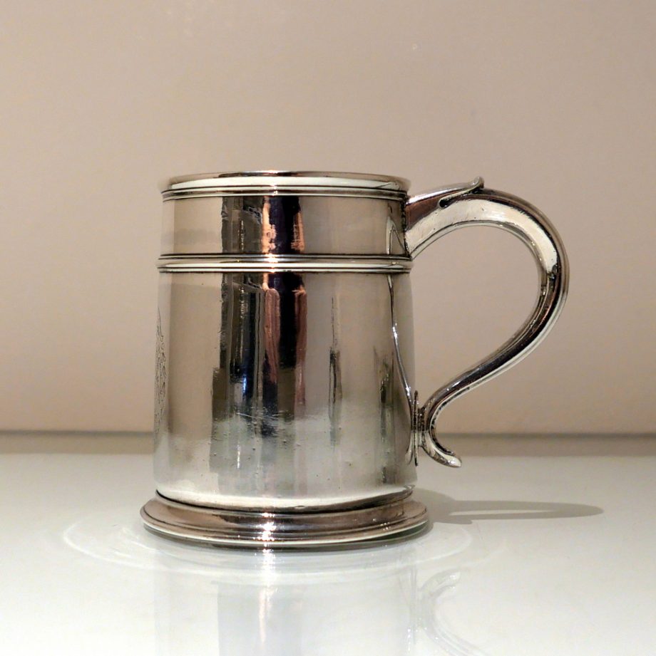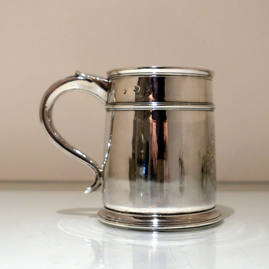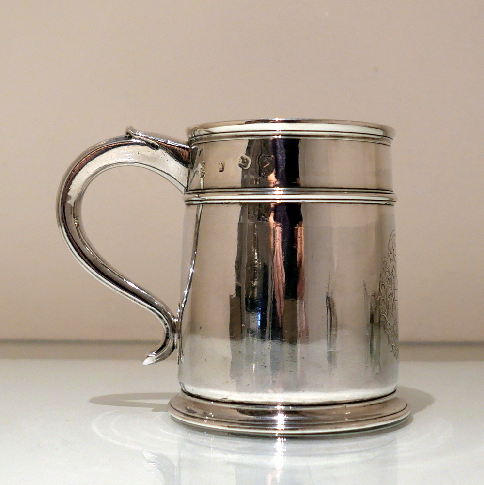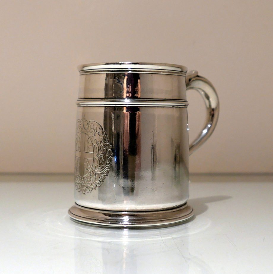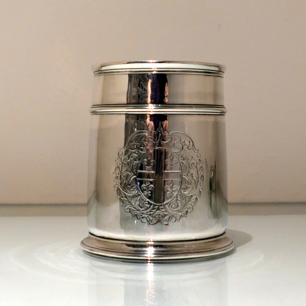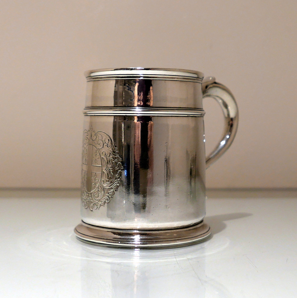 A fine and incredibly good quality 17th century silver ‘straight’ sided pint mug. Â The upper section of the bowl has a strap work belt for highlights and below this sits a beautifully engraved contemporary armorial.