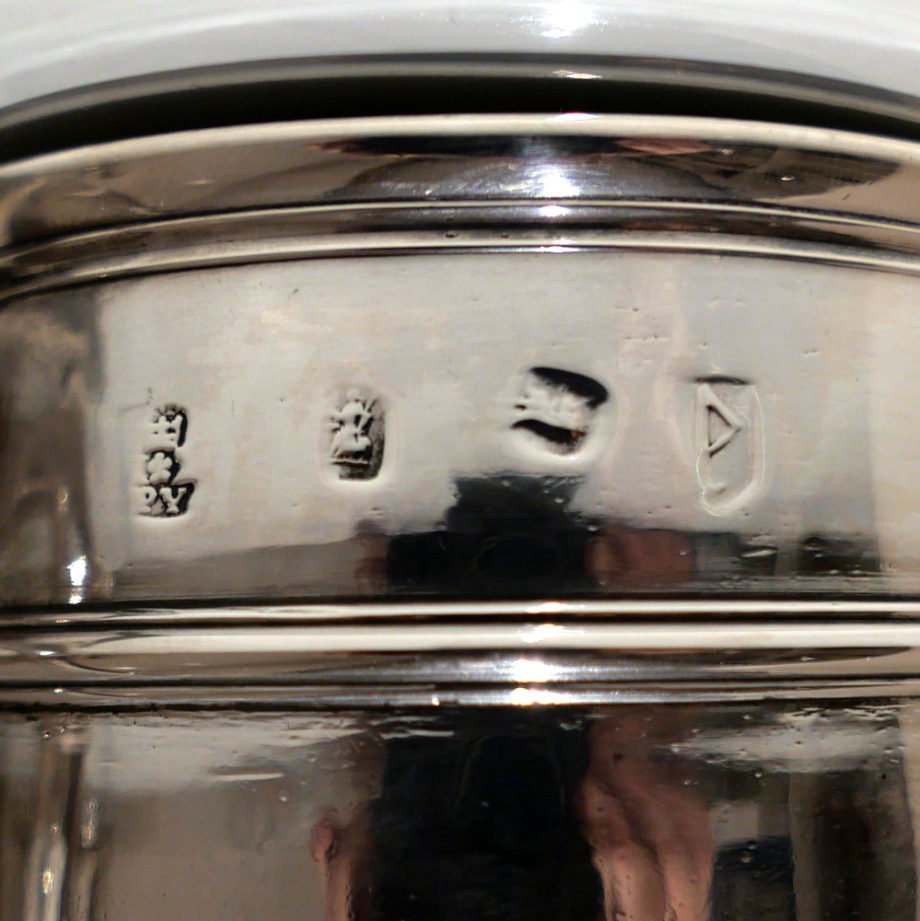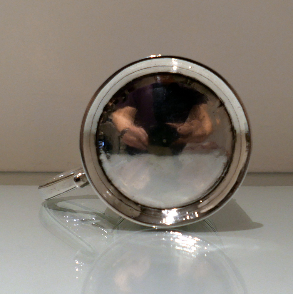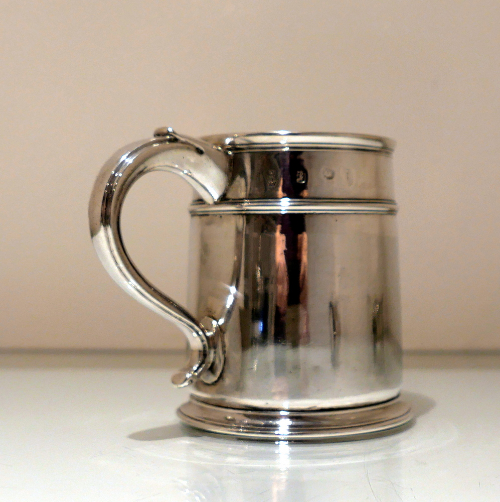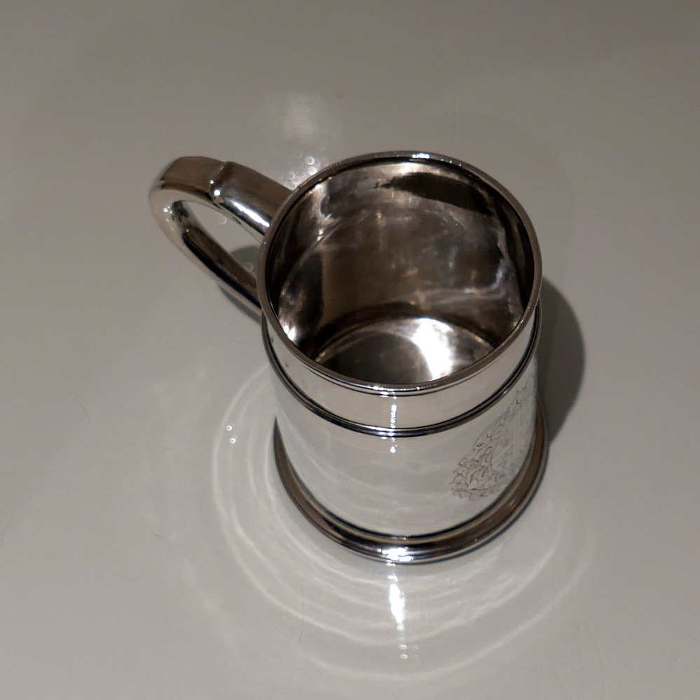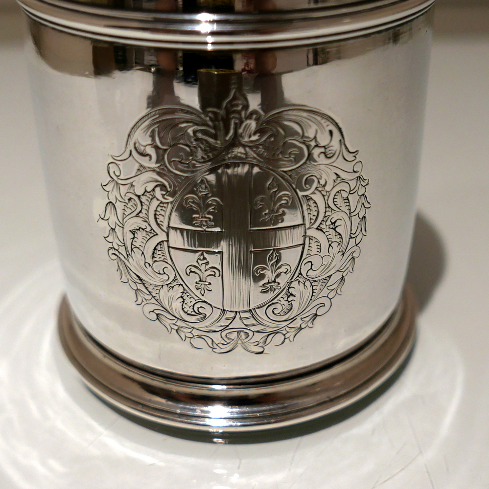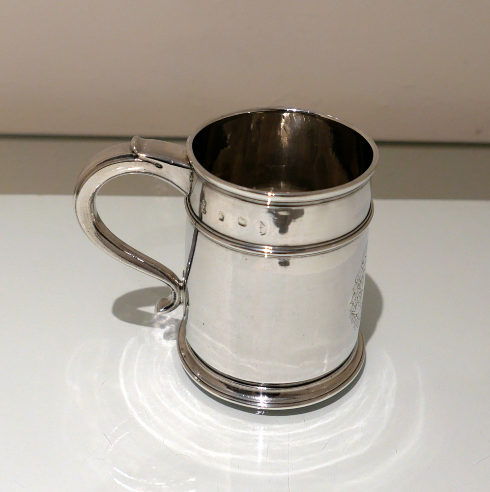 A fine and incredibly good quality 17th century silver ‘straight’ sided pint mug. Â The upper section of the bowl has a strap work belt for highlights and below this sits a beautifully engraved contemporary armorial.