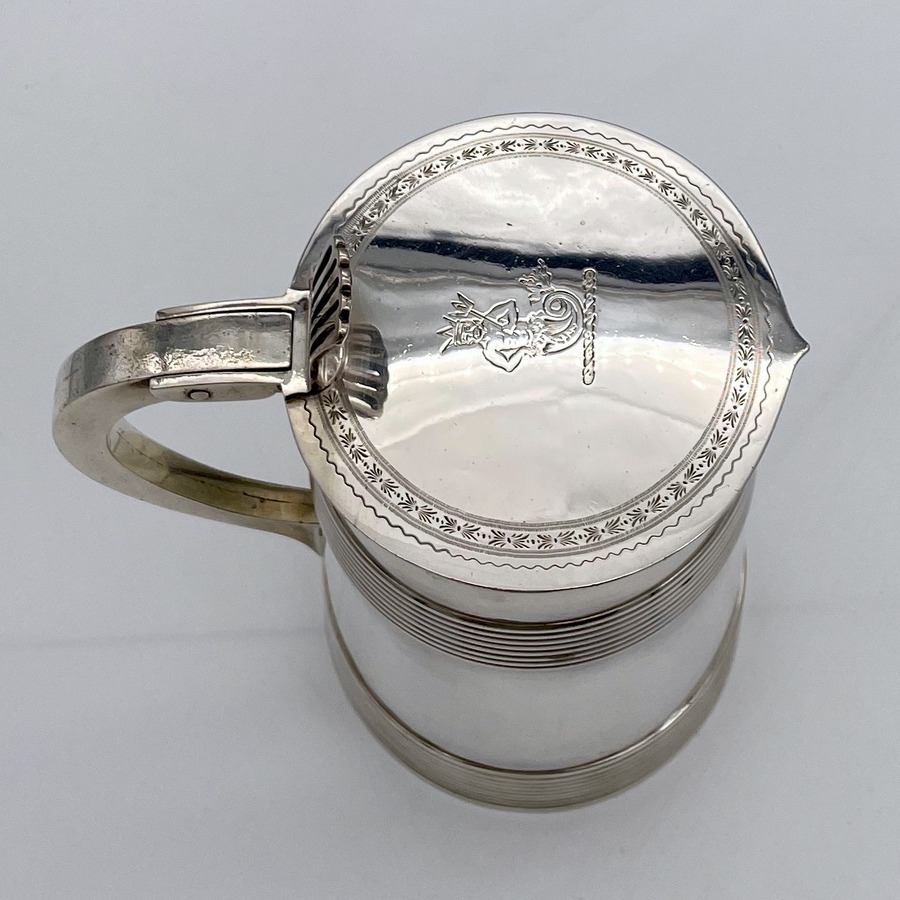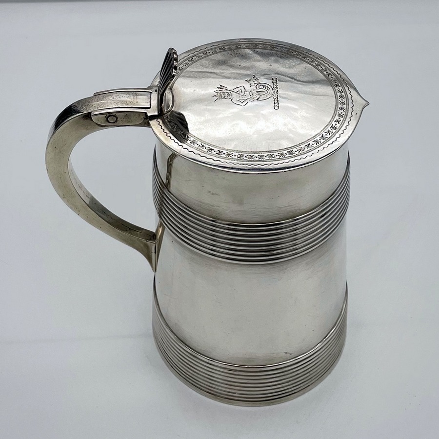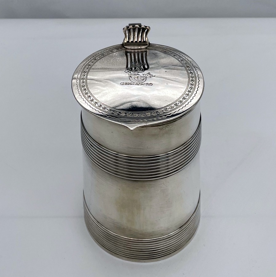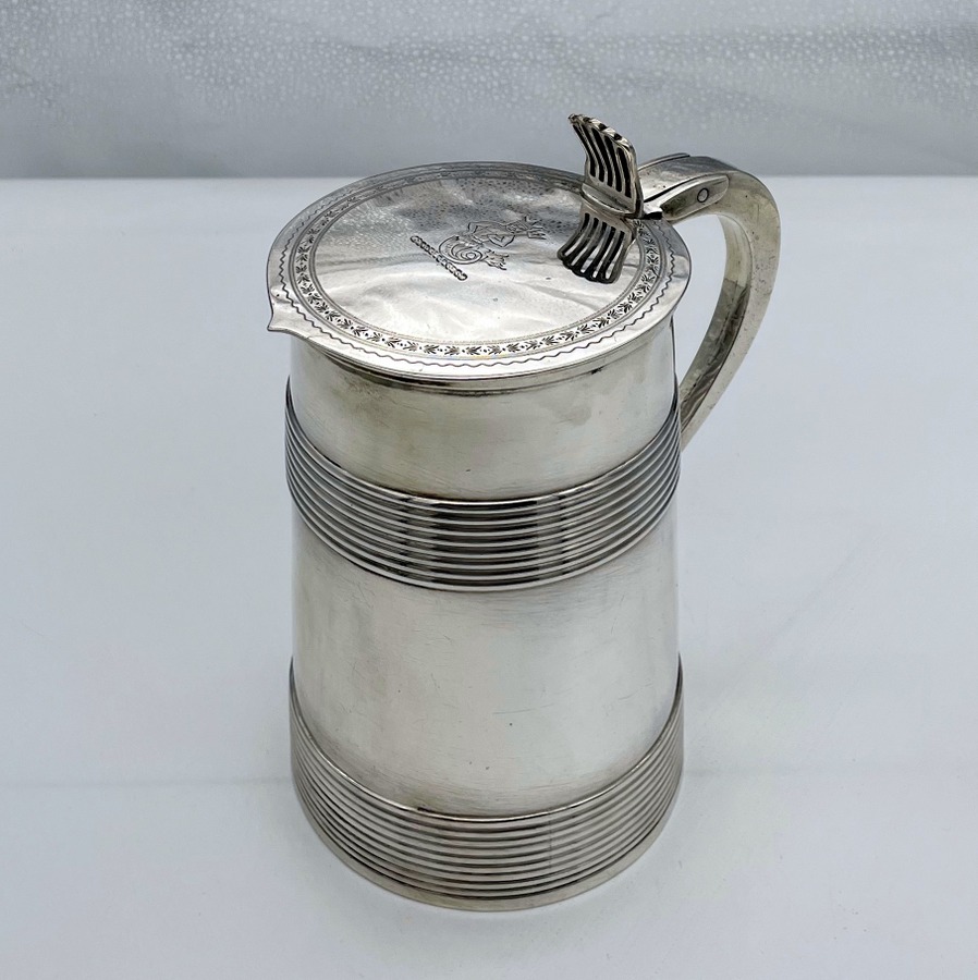 A rare and highly collectable Georgian silver cylindrical tankard and cover designed with a slight tapering bowl and decorated with two elegant bands of reed themed galleries. Â The hinged lid has elegant outer bright cut workmanship and the centre front has a stylish contemporary hand engraved armorial for importance.