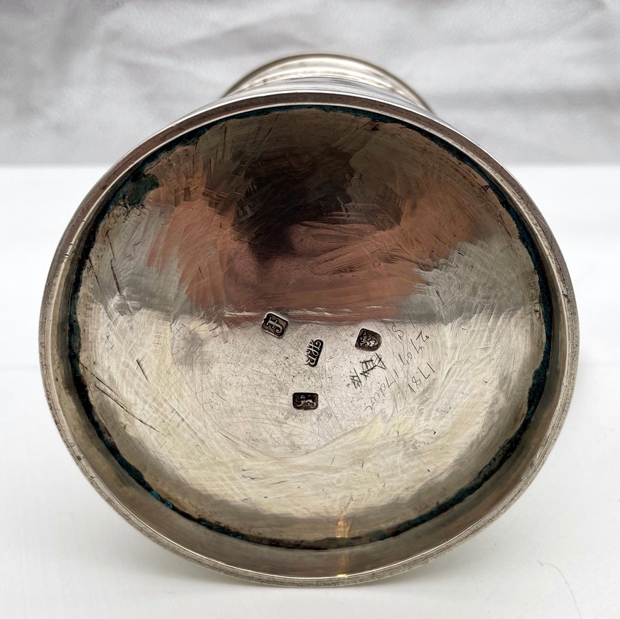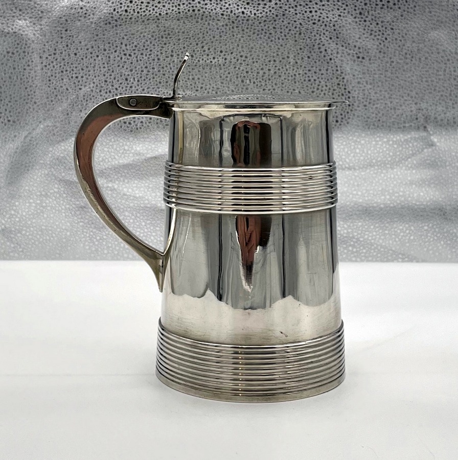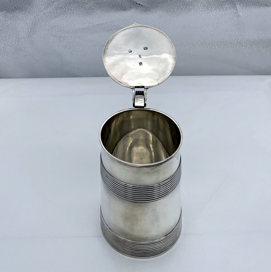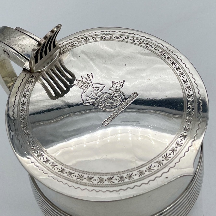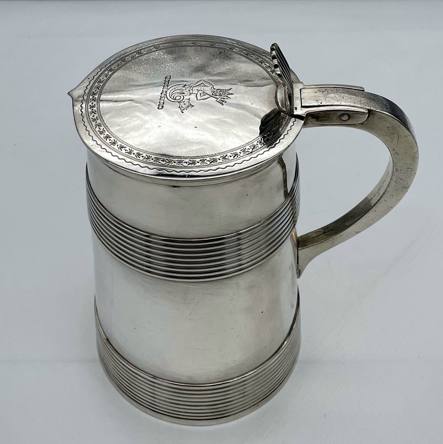 A rare and highly collectable Georgian silver cylindrical tankard and cover designed with a slight tapering bowl and decorated with two elegant bands of reed themed galleries. Â The hinged lid has elegant outer bright cut workmanship and the centre front has a stylish contemporary hand engraved armorial for importance.