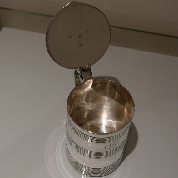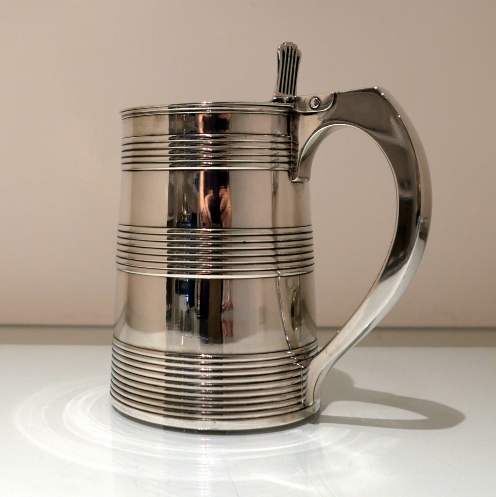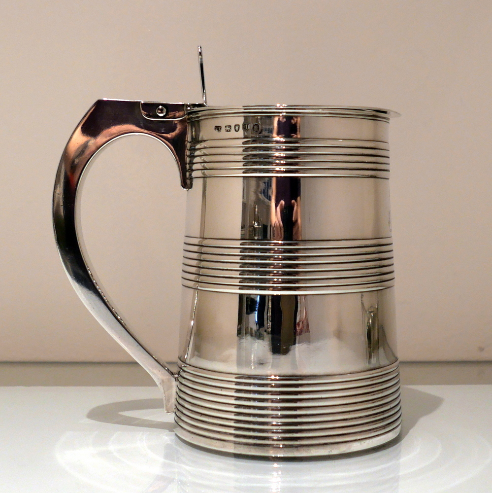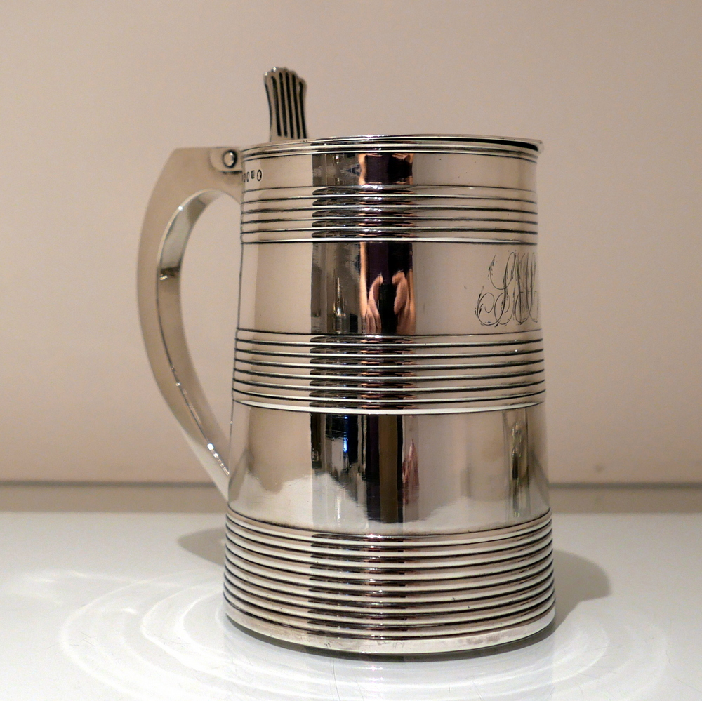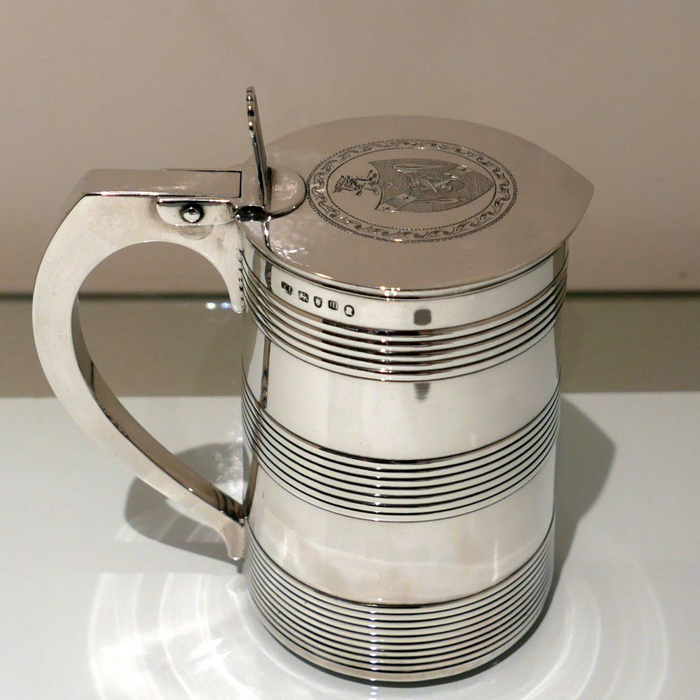 A stunning quality straight sided tapering form silver tankard decorated with three bands of reed which alternates plain formed silver for decorative contrast to the body. Â The hinged lid has a pristine contemporary armorial for importance, with an additional script entwined initial to the upper section of the body.