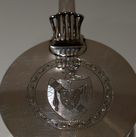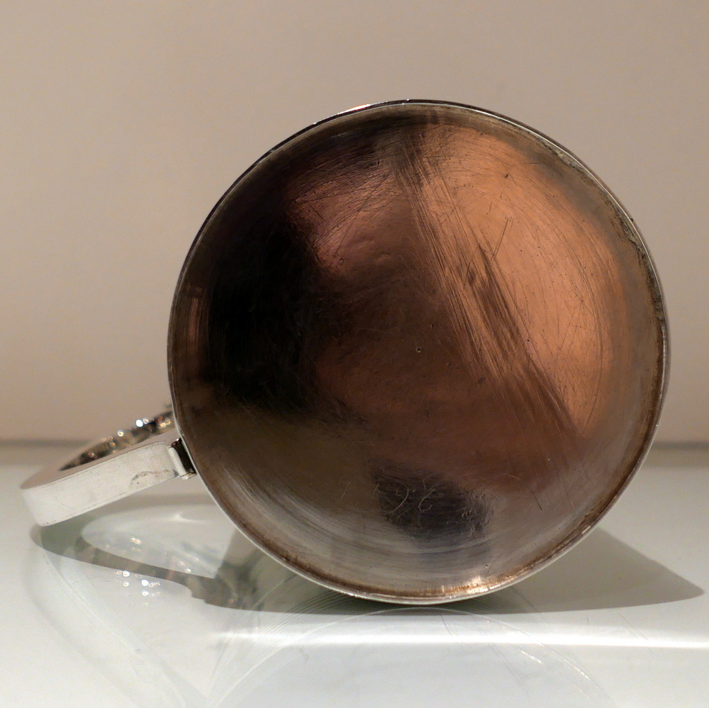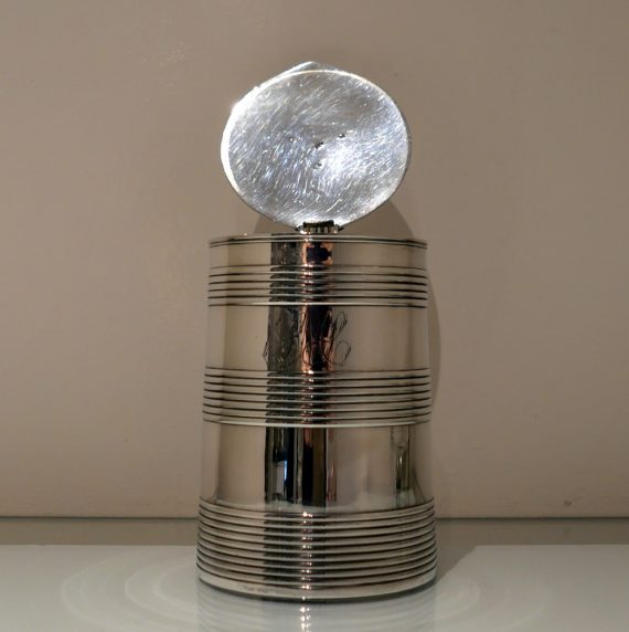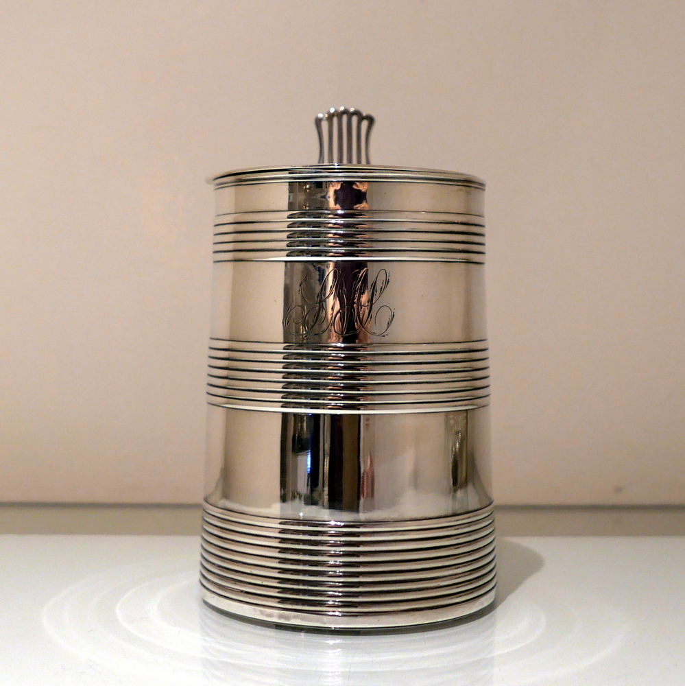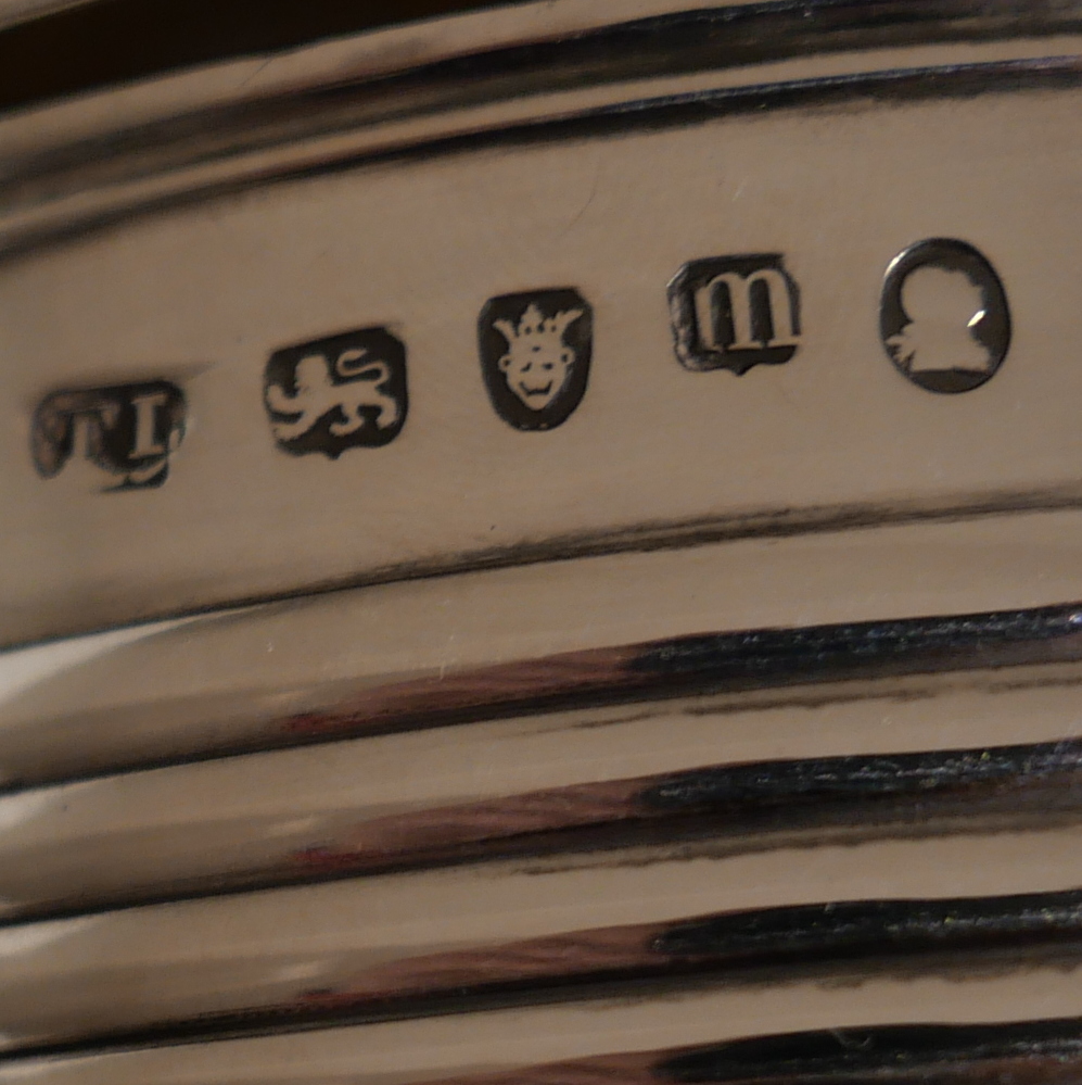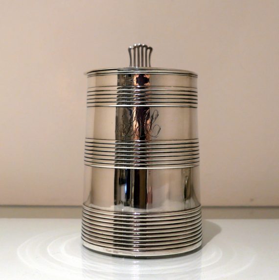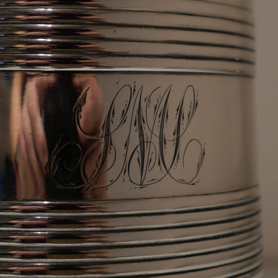 A stunning quality straight sided tapering form silver tankard decorated with three bands of reed which alternates plain formed silver for decorative contrast to the body. Â The hinged lid has a pristine contemporary armorial for importance, with an additional script entwined initial to the upper section of the body.