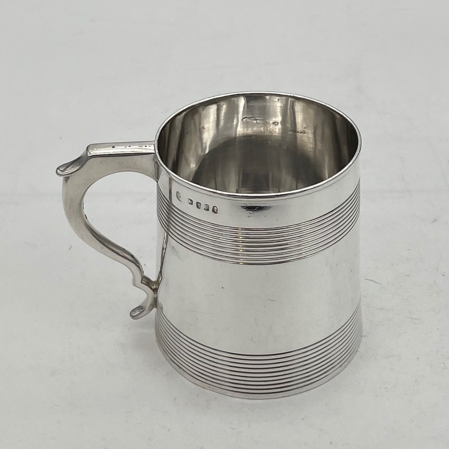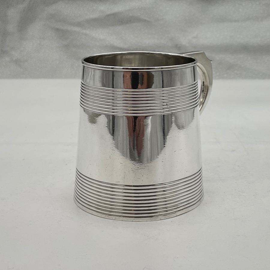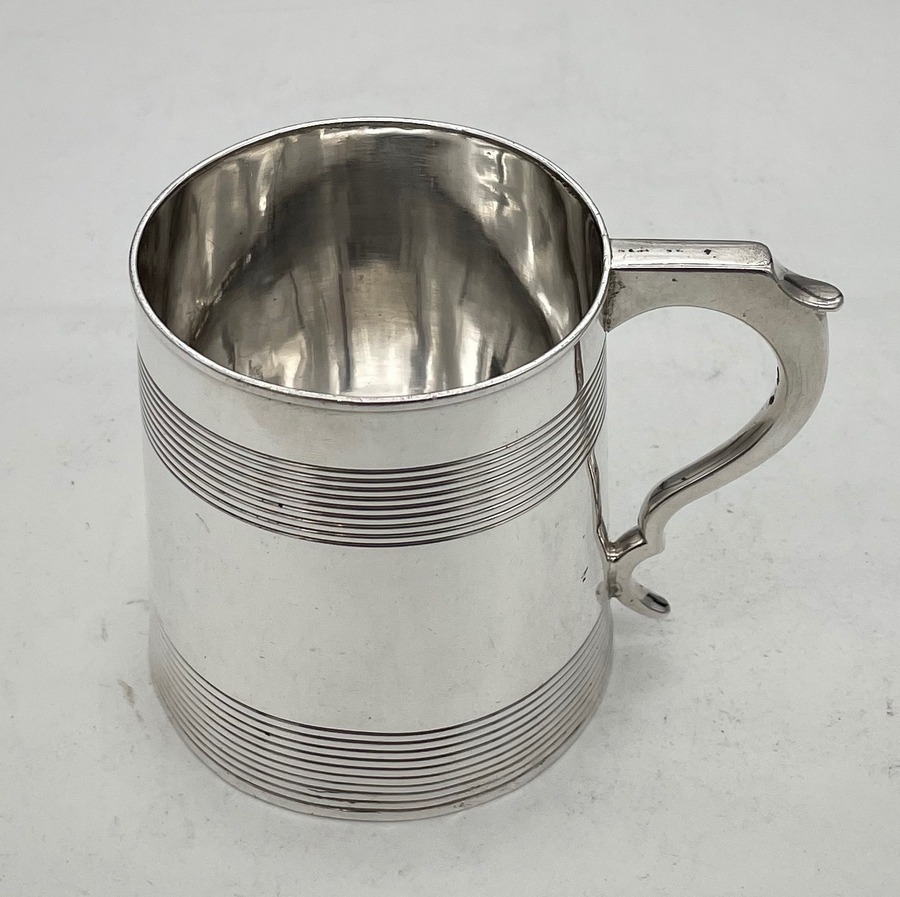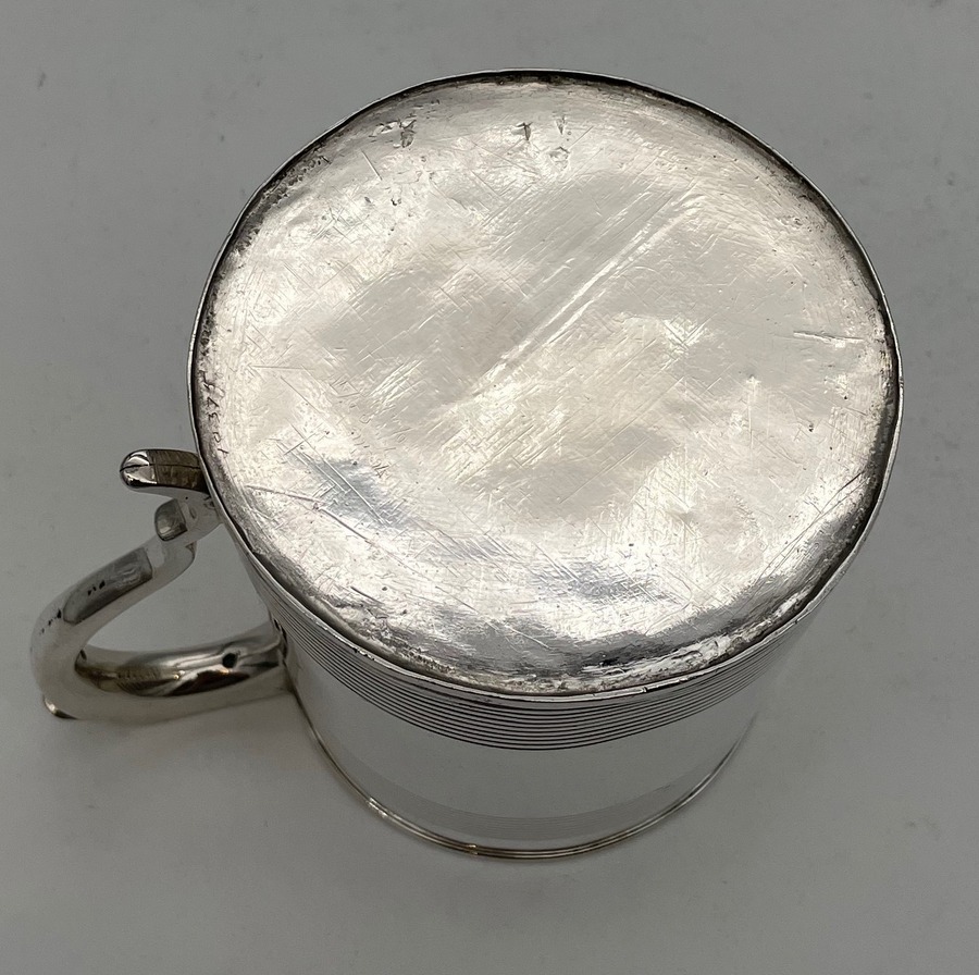 A wonderful 18th century silver pint mug decorated with two elegant bands of engraving and a stylish straight thumbpiece scroll handle.