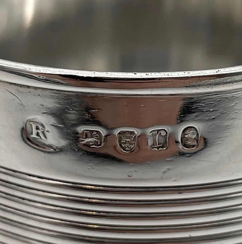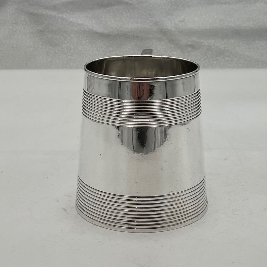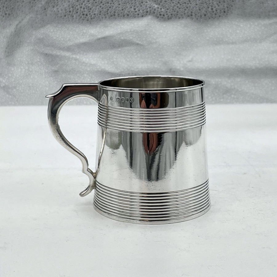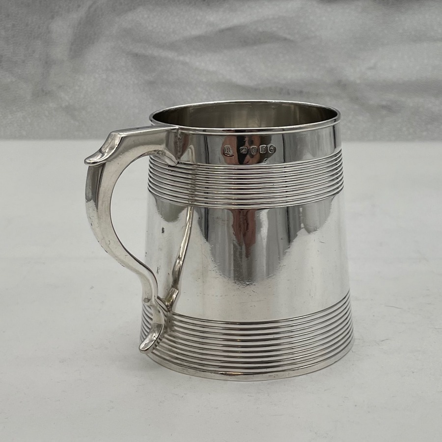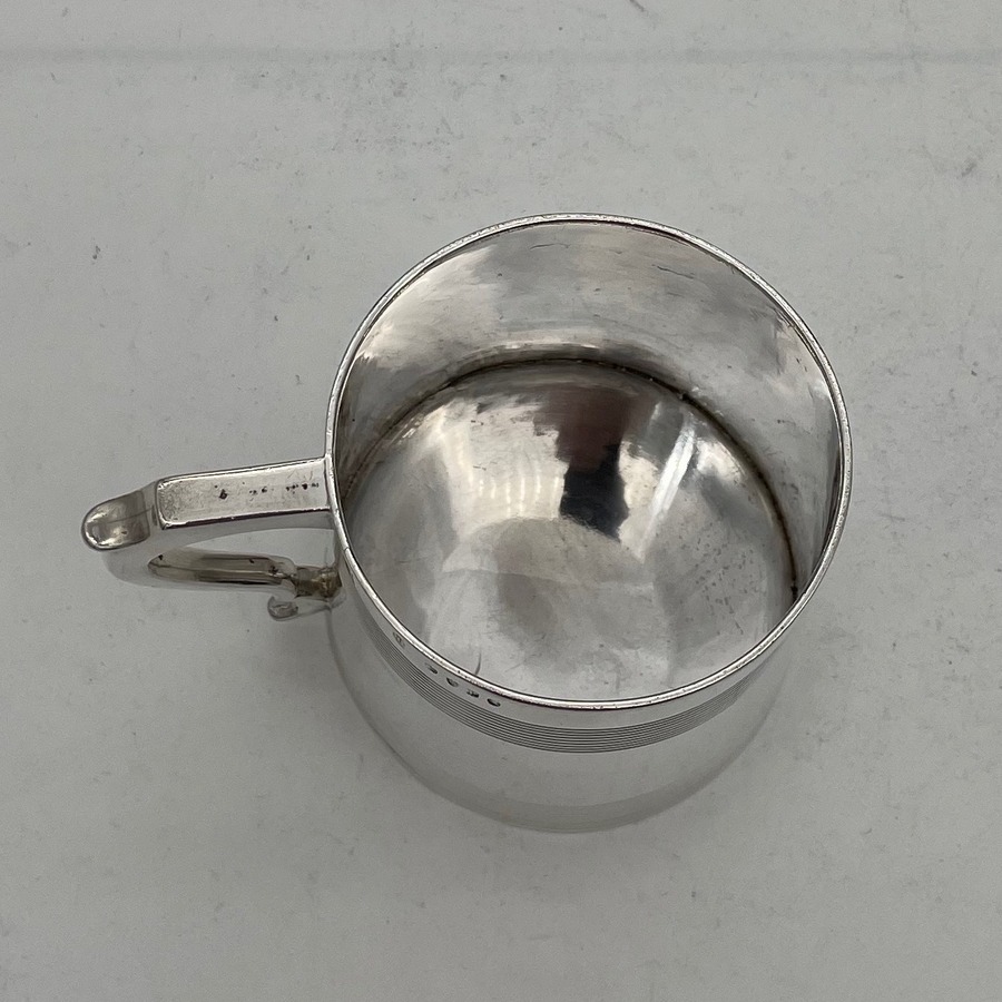 A wonderful 18th century silver pint mug decorated with two elegant bands of engraving and a stylish straight thumbpiece scroll handle.