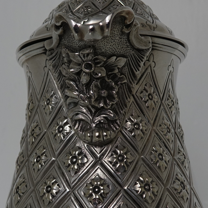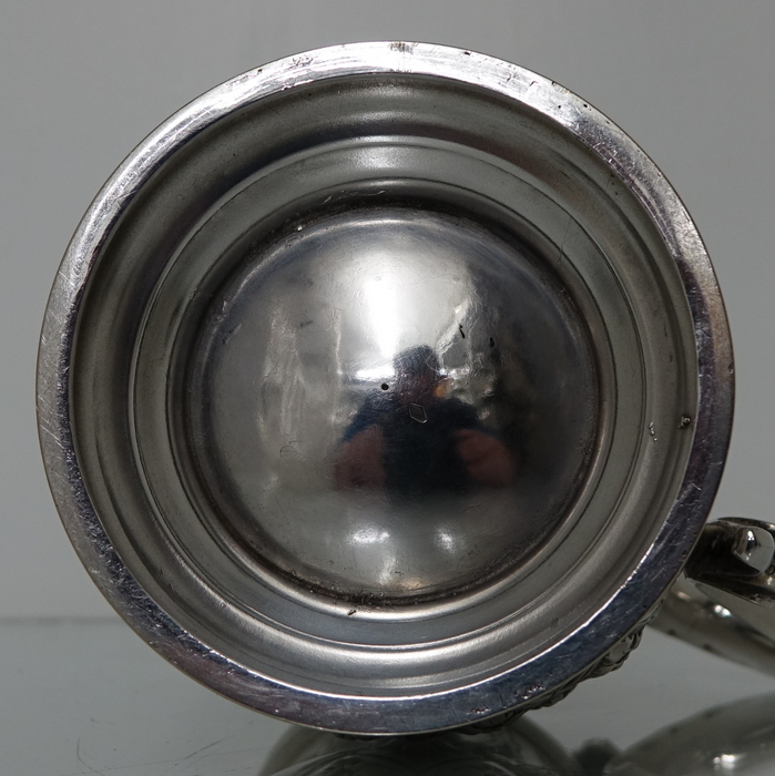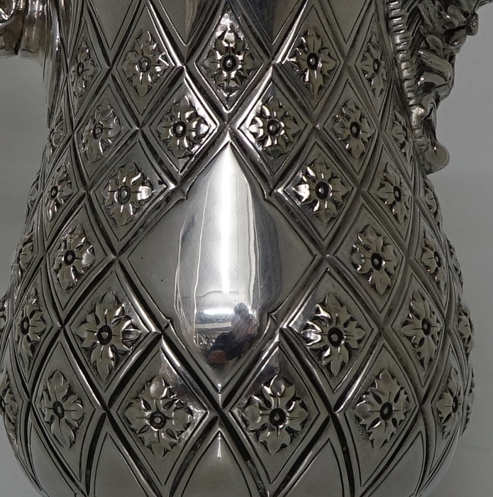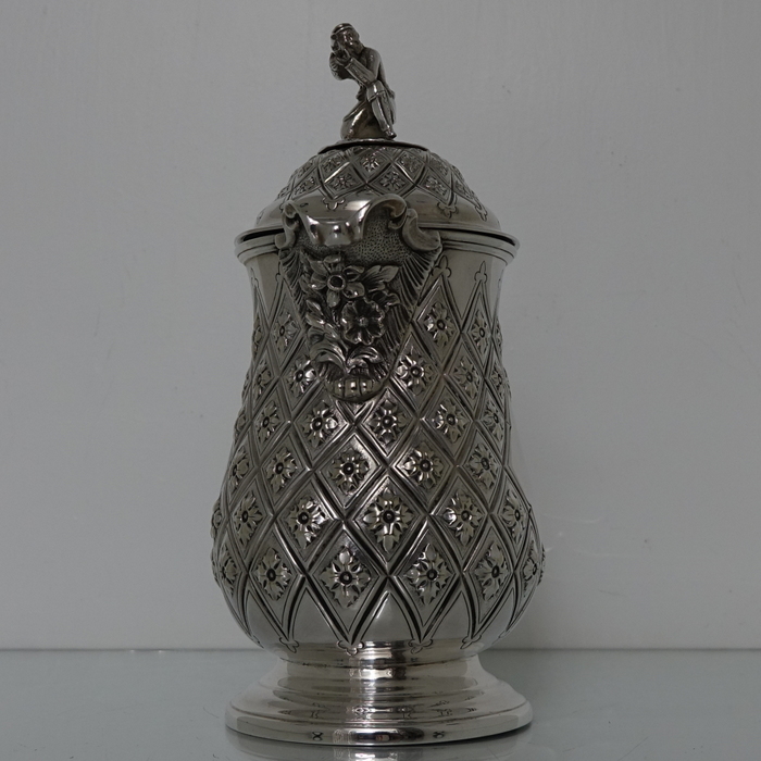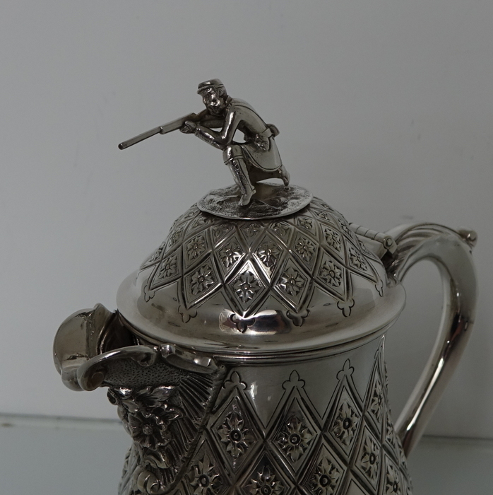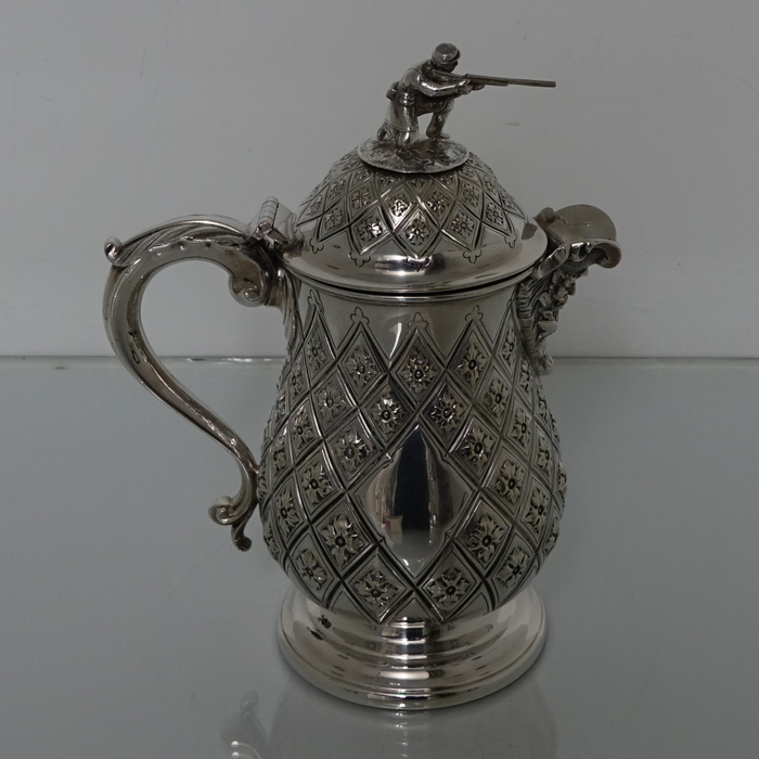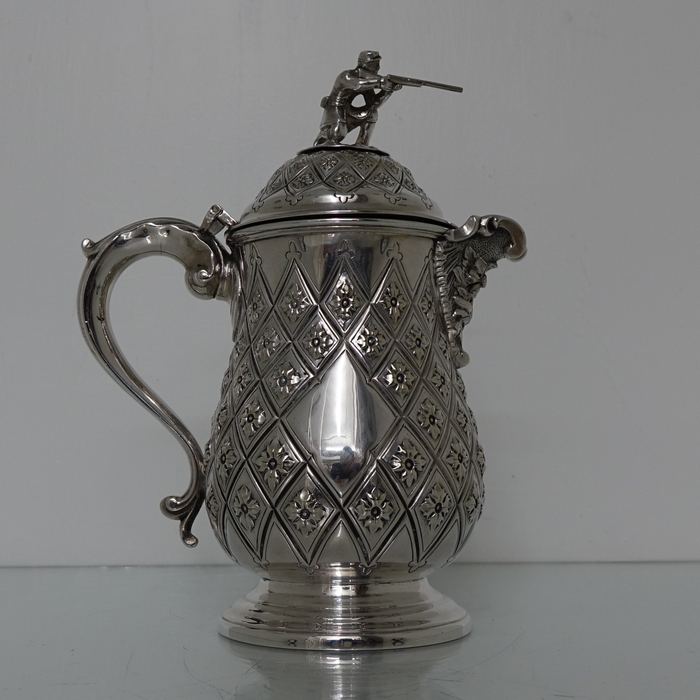 A very elegant Victorian plate Abercrombie patterned beer/wine flagon with single scroll handle. Â The body of the flagon has a very stylish diamond shaped double cartouche and is crowned with a domed hinged lid with a delightful soldier finial.