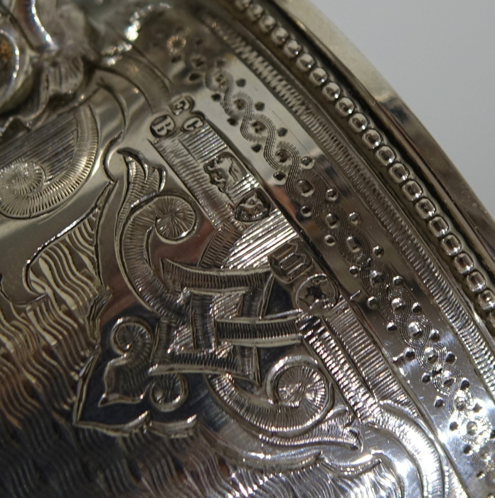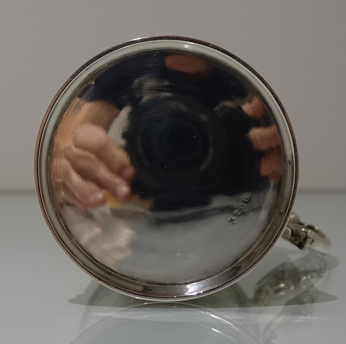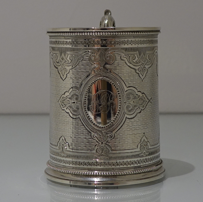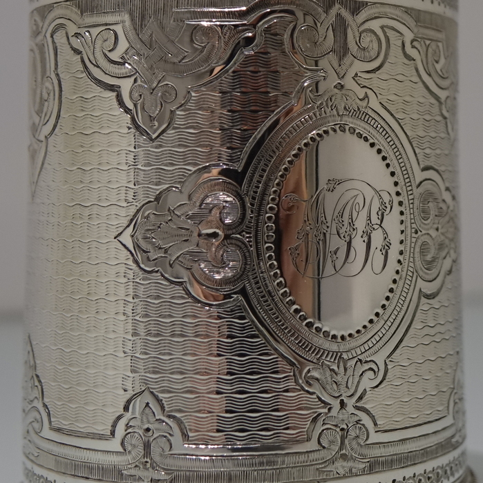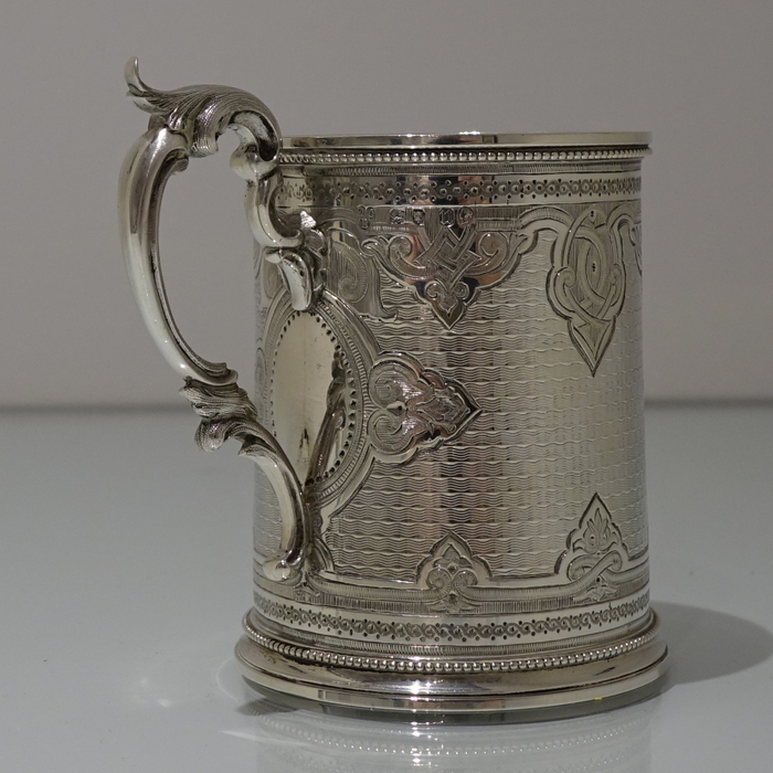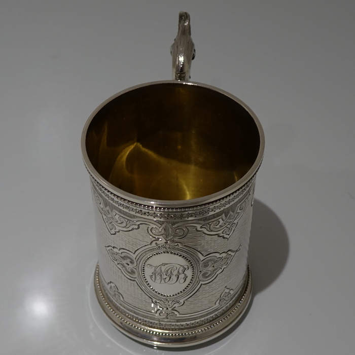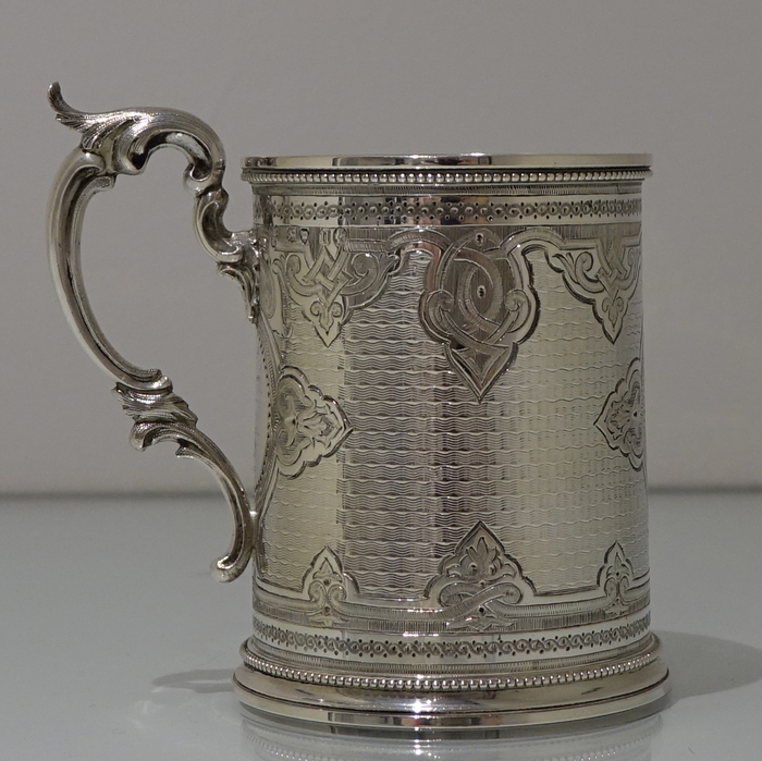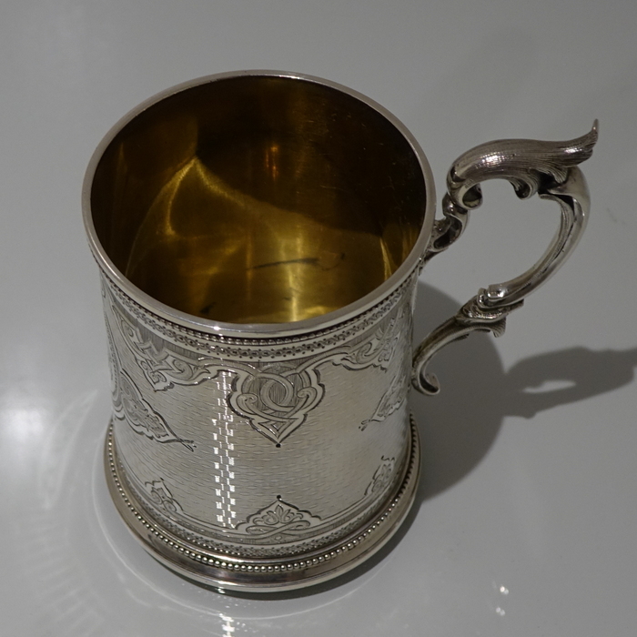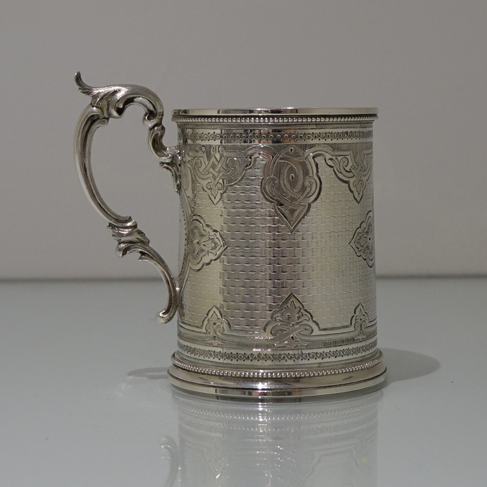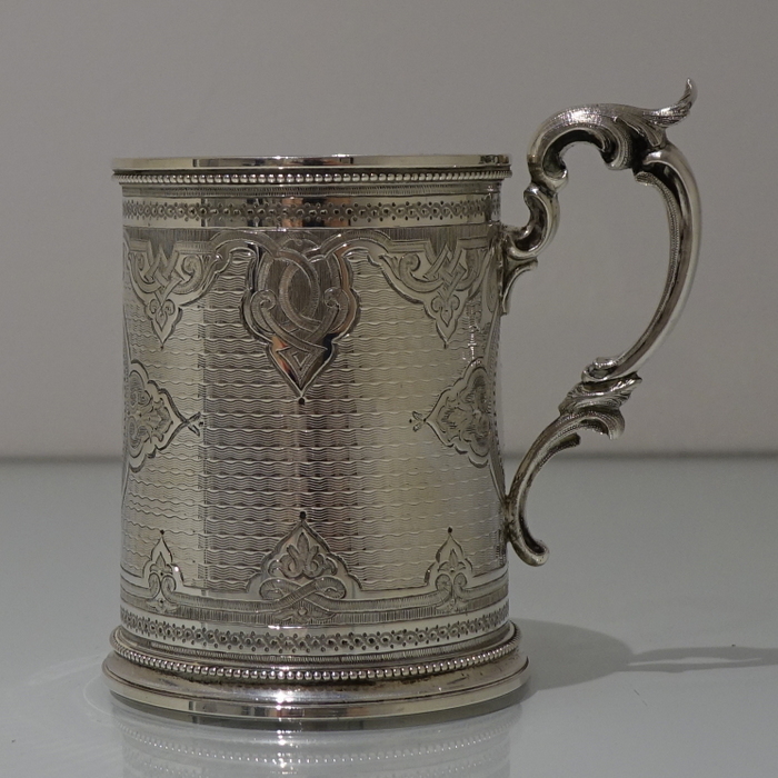 An extremely beautiful mid 19th century christening mug with upper and lower bead borders for low/highlights. Â The mug has been elaborate bright cut hand engraved throughout for decoration and has a double cartouche. Â The centre front of the mug has a contemporary initial for importance.