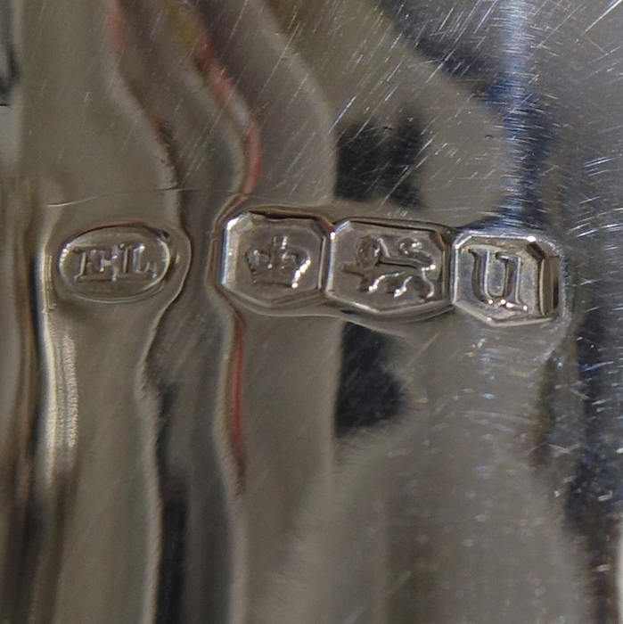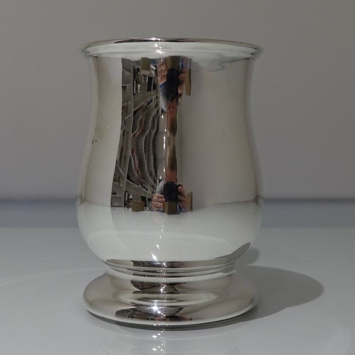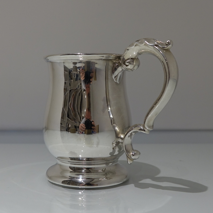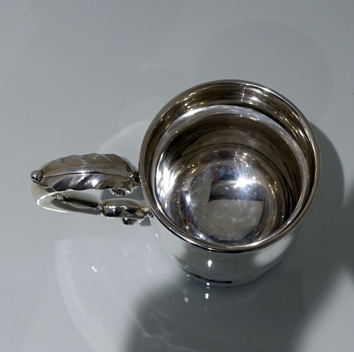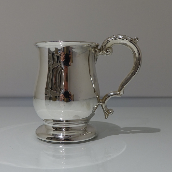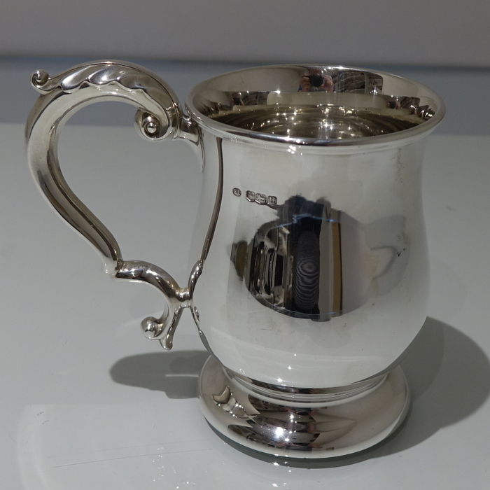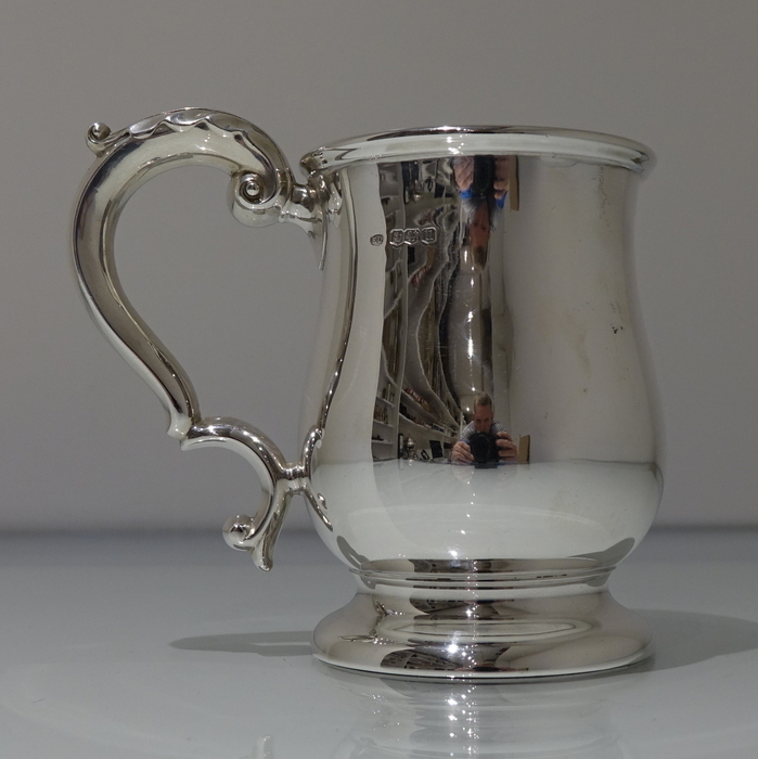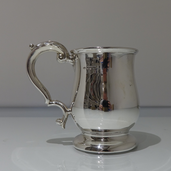 A stylish George VI baluster shaped pint mug, plain formed in design with elegant double scroll handle which is crowned with an ornate acanthus leaf thumb piece.