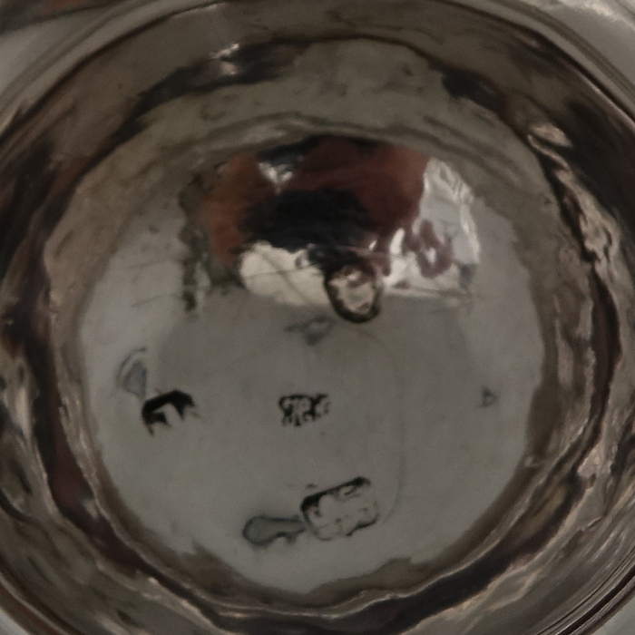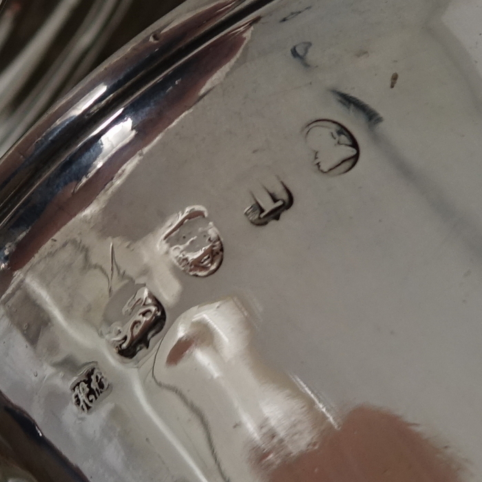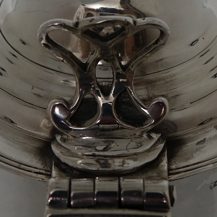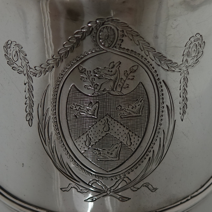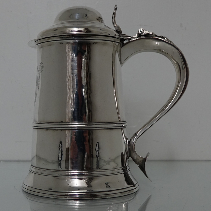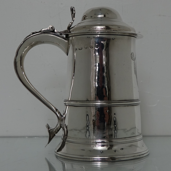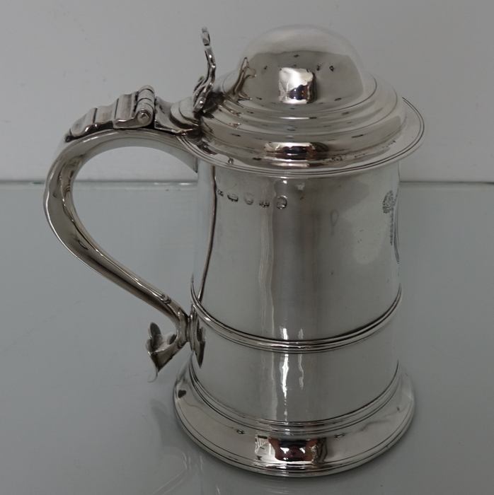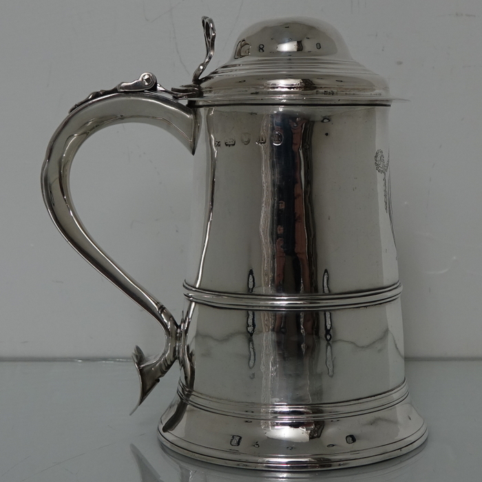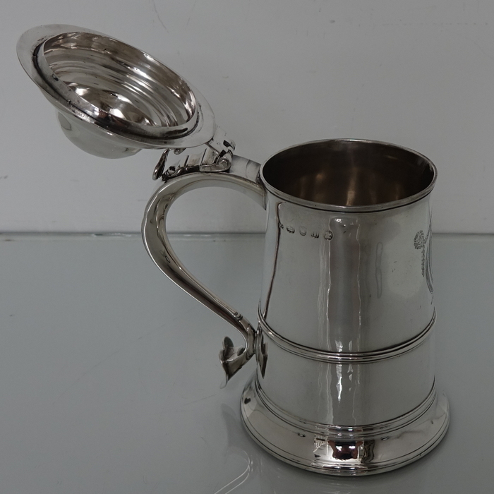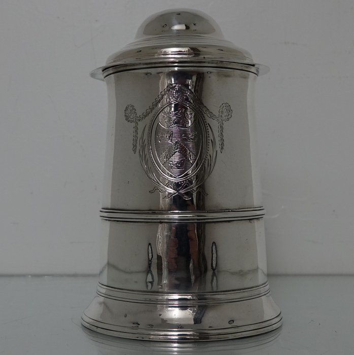 A highly collectable tapered cylindrical tankard sitting on a plain skirt foot with open-work chair back thumb piece to the domed hinged lid. Â The tankard has a beautiful contemporary bright cut engraved armorial for importance.
