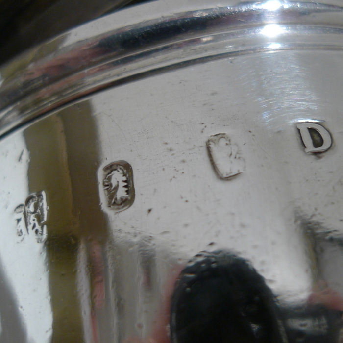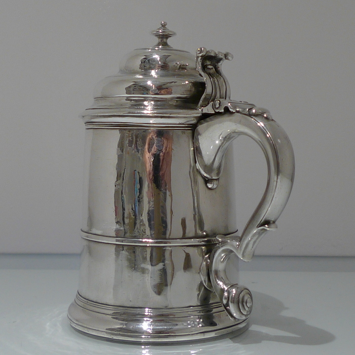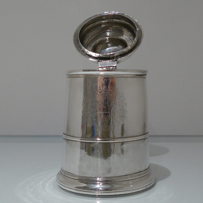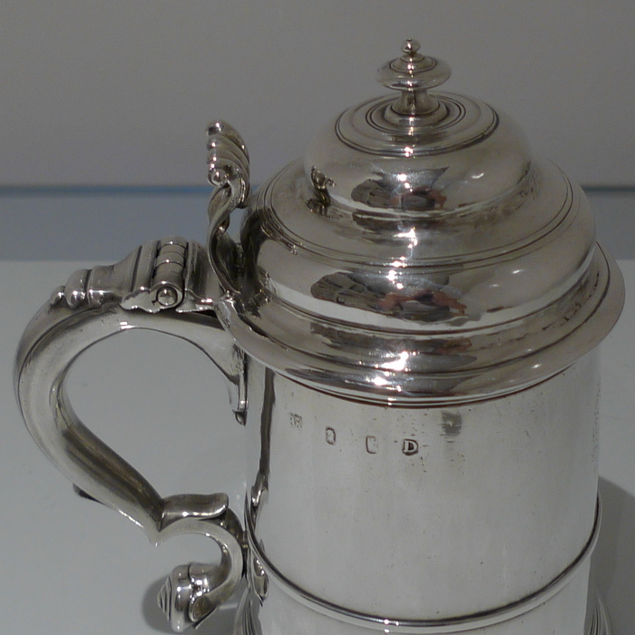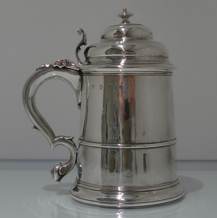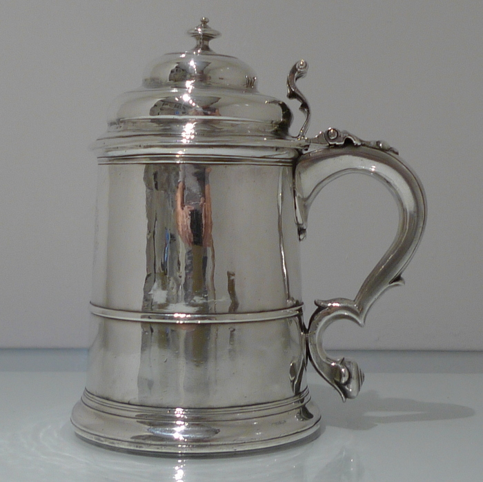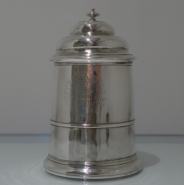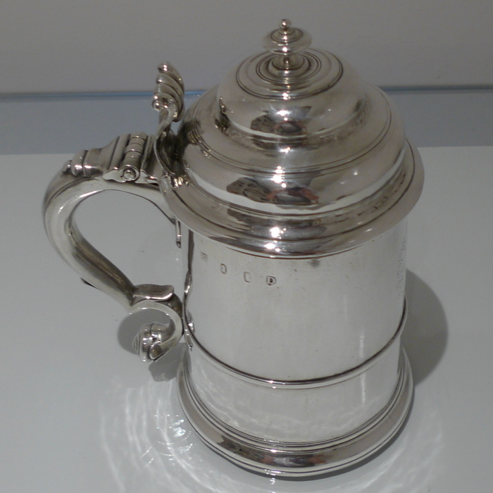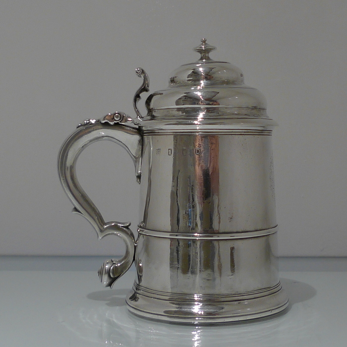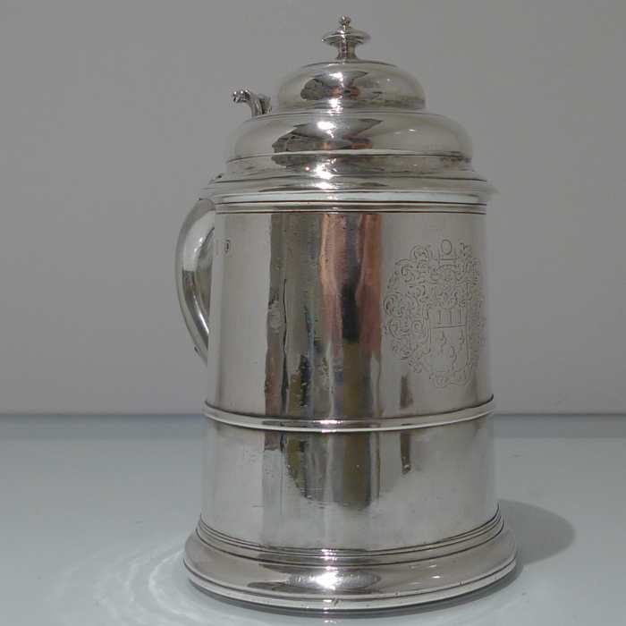 A rare and extremely collectable cylindrical tankard and cover which is designed in a Scottish manner but for the London market. The body has an elegant strap work band above which sits a stylish looking contemporary armorial for importance. Â The lid is domed in two sections and crowned with a elegant finial. Â The handle is double scroll in design.