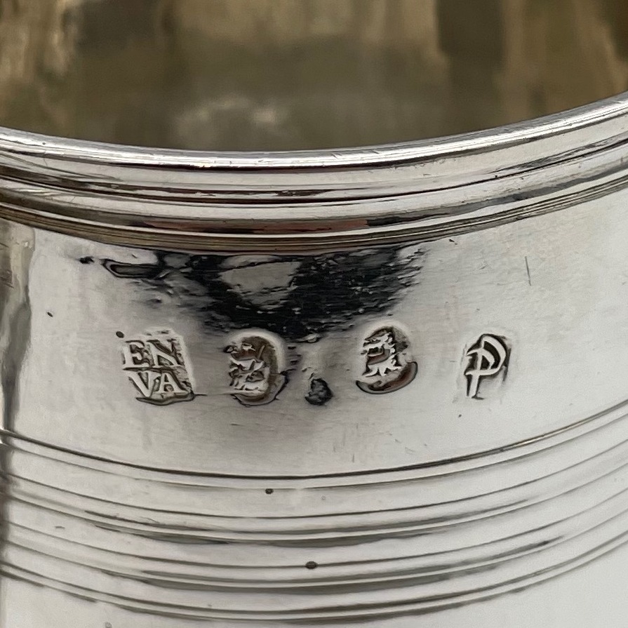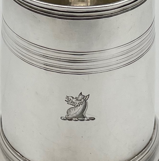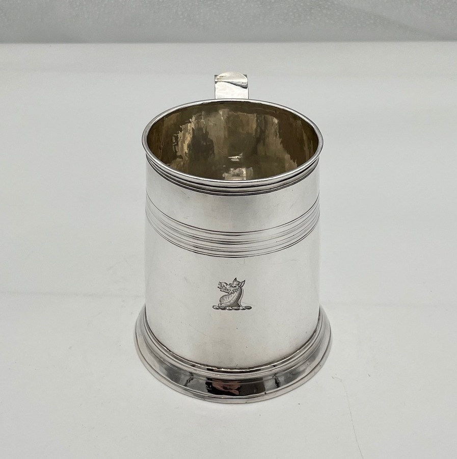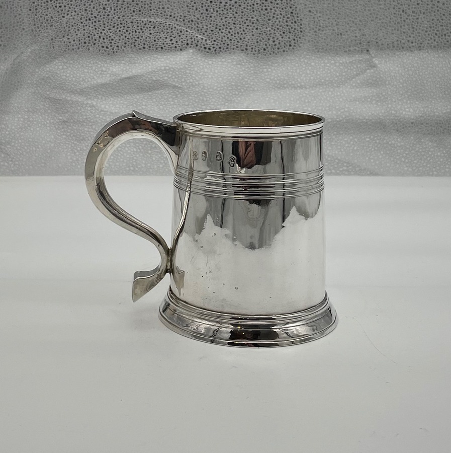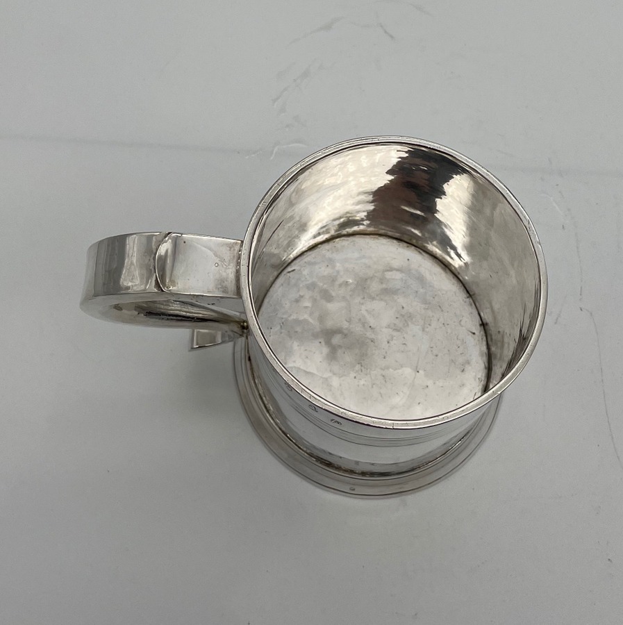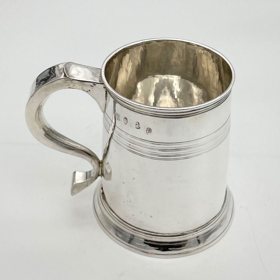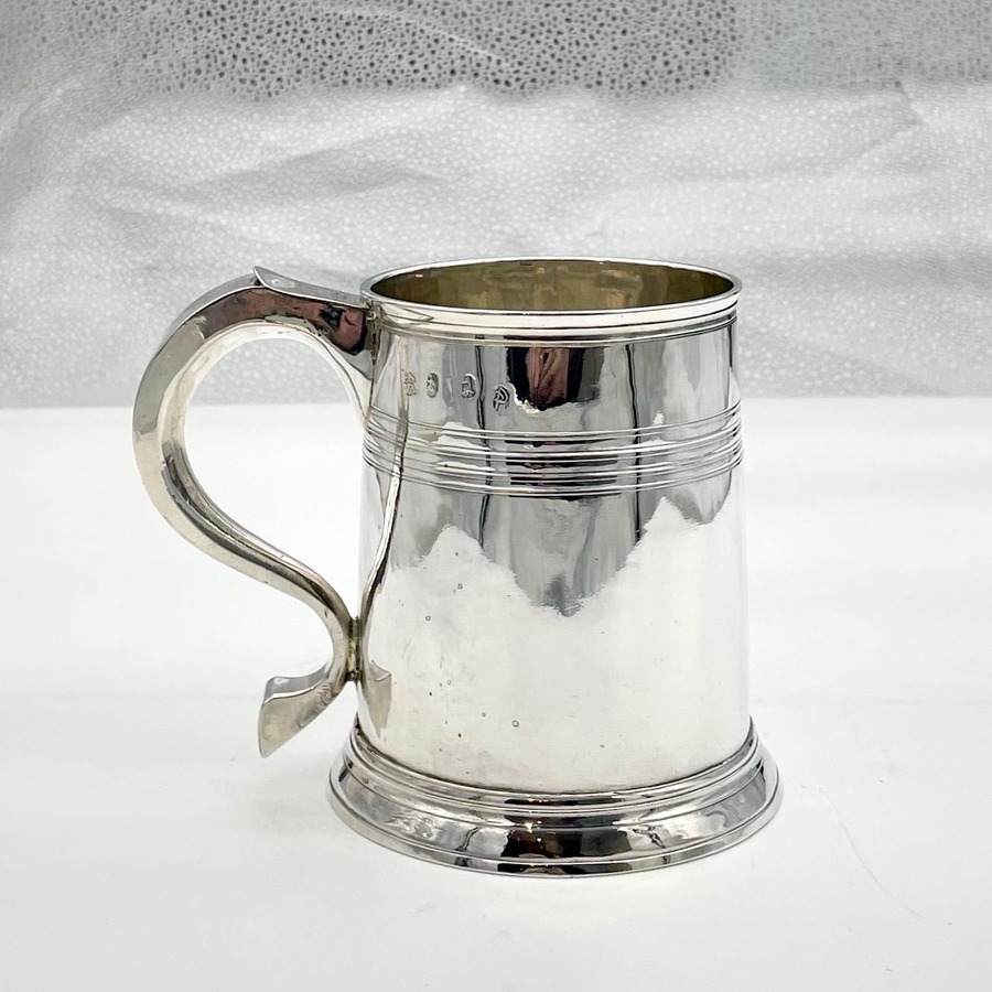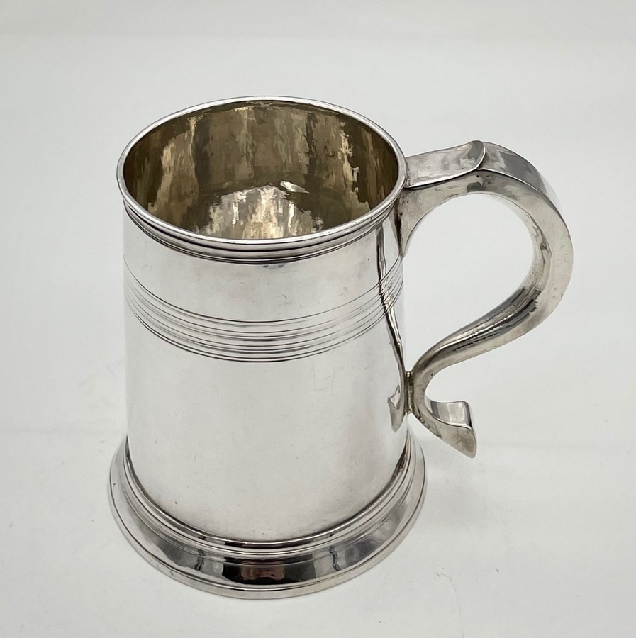 A handsome early 18th century straight sided Britannia silver pint mug decorated with upper turnings and a traditional skirt foot. Â The applied scroll handle has an elegant sheet thumbpiece.