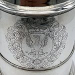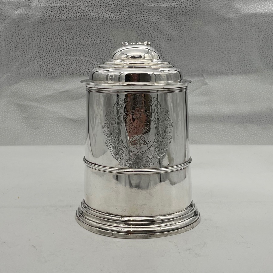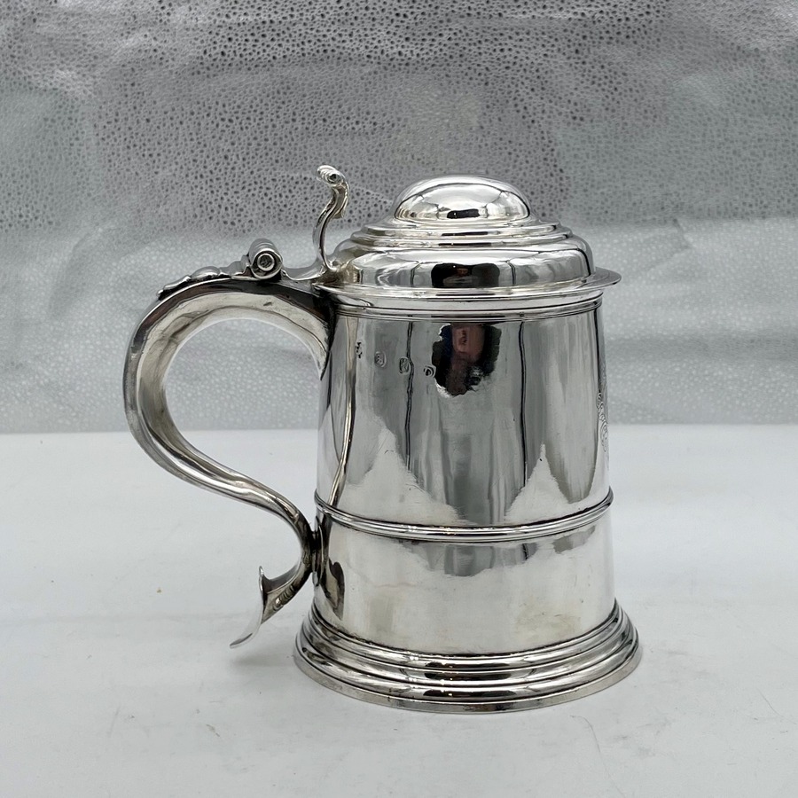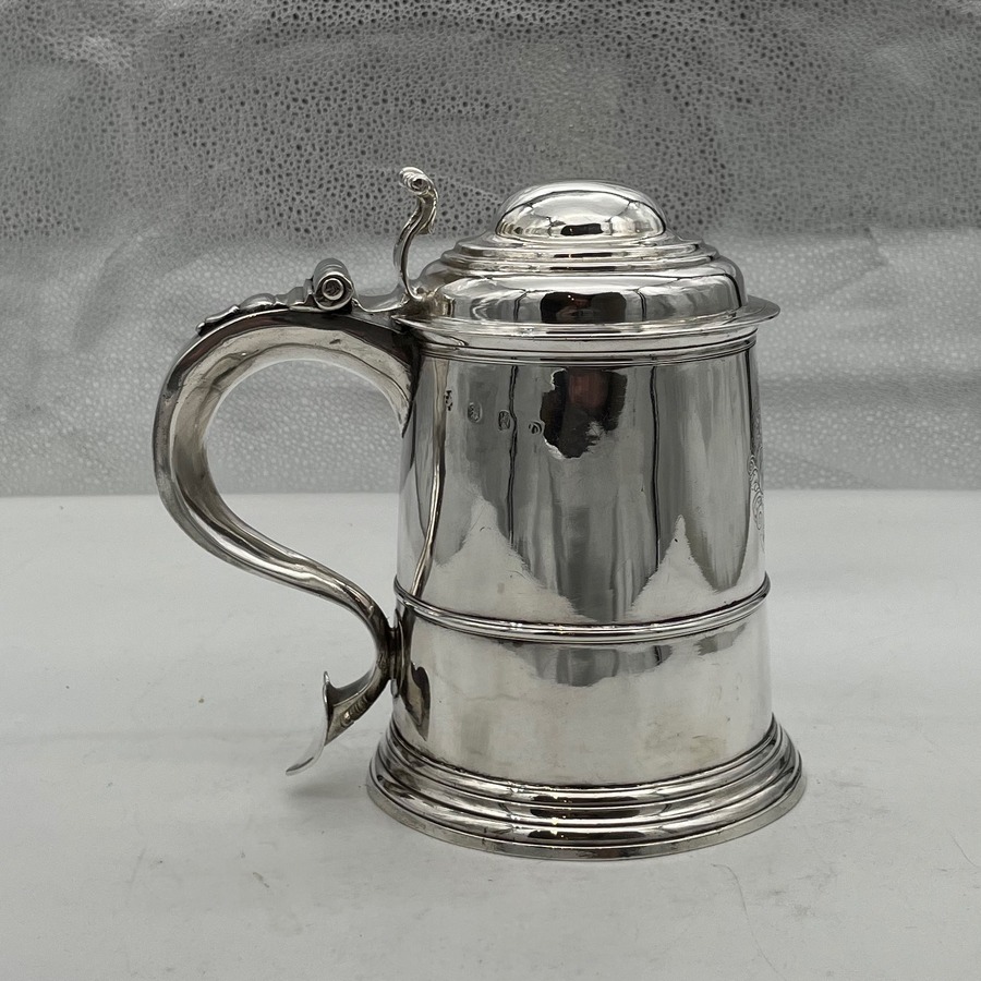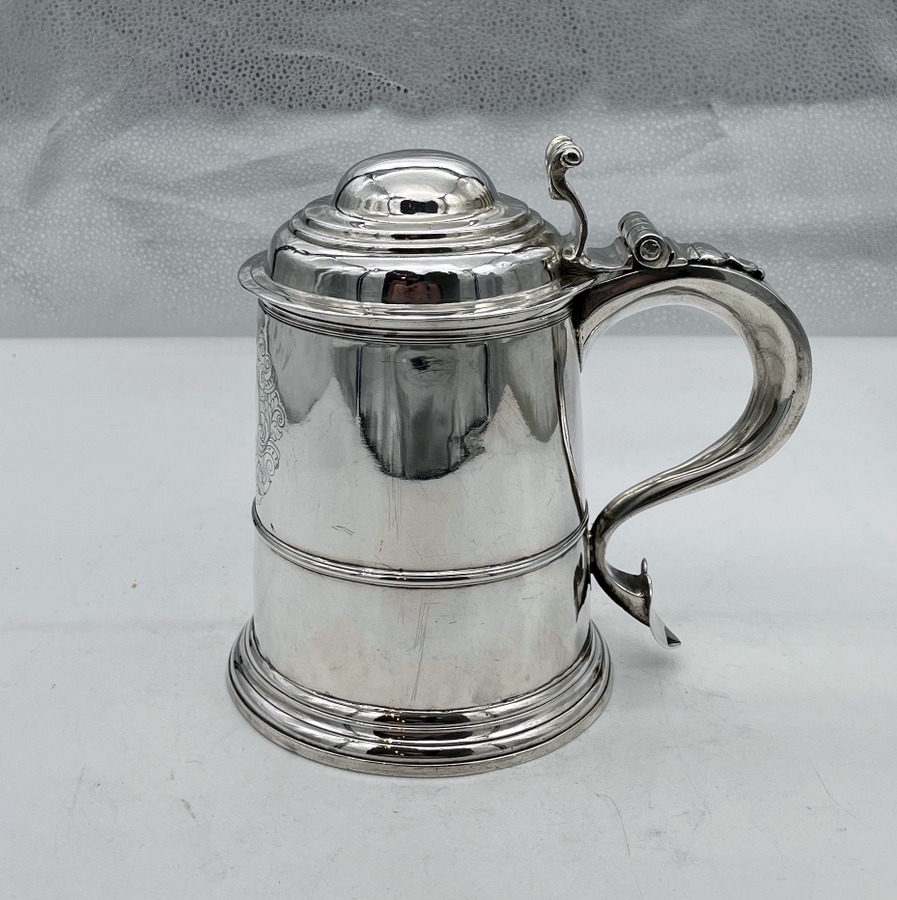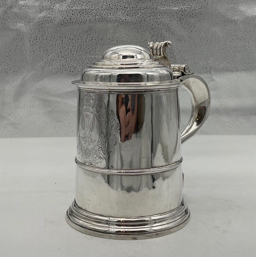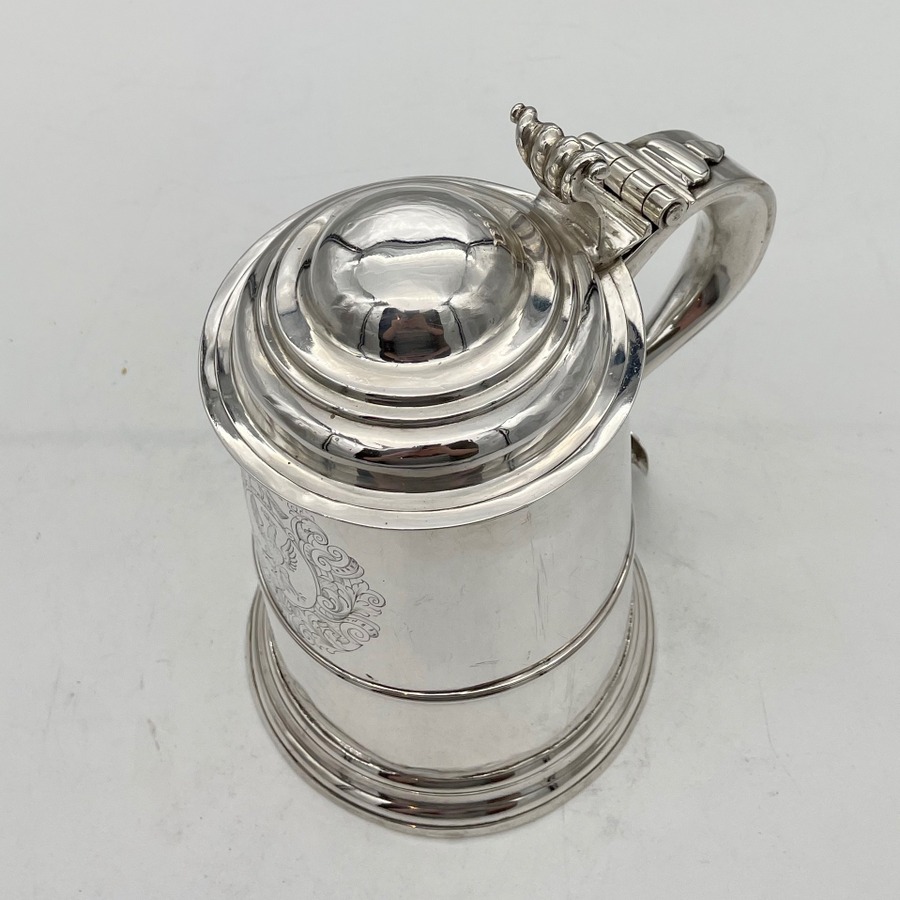 A rare and highly collectable Anne Tanqueray made Britannia silver quart tankard designed with an elegant slight tapering body which has a central girdle above which sits a truly impressive hand engraved contemporary armorial which is purposely positioned to be the central focal point of decoration and importance of the tankard. Â The hinged lid is domed and there is a stylish foliate volute type thumbpiece.